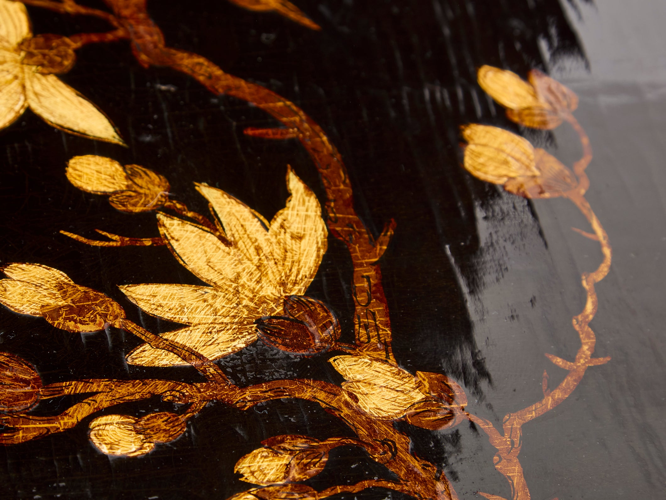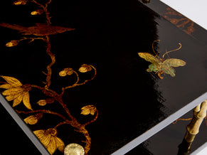 This unique pair of Maison Baguès chinoiserie end tables was created in the early 1940s with solid bamboo shaped bronze structure and a chinese decor lacquered top picturing birds and butterflies on a flowered tree. This table is typical of the Chinese inspired neoclassical work of Maison Baguès in the 1940s, and offers a timeless, sophisticated look, with plenty of amazing details. The bronze structure has been fully cleaned and polished, and has a beautiful patina, while the Chinese lacquer tops have been fully revarnished. These tables are now found in an amazing condition. These are rare finds, and real statement pieces.