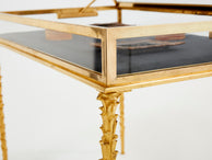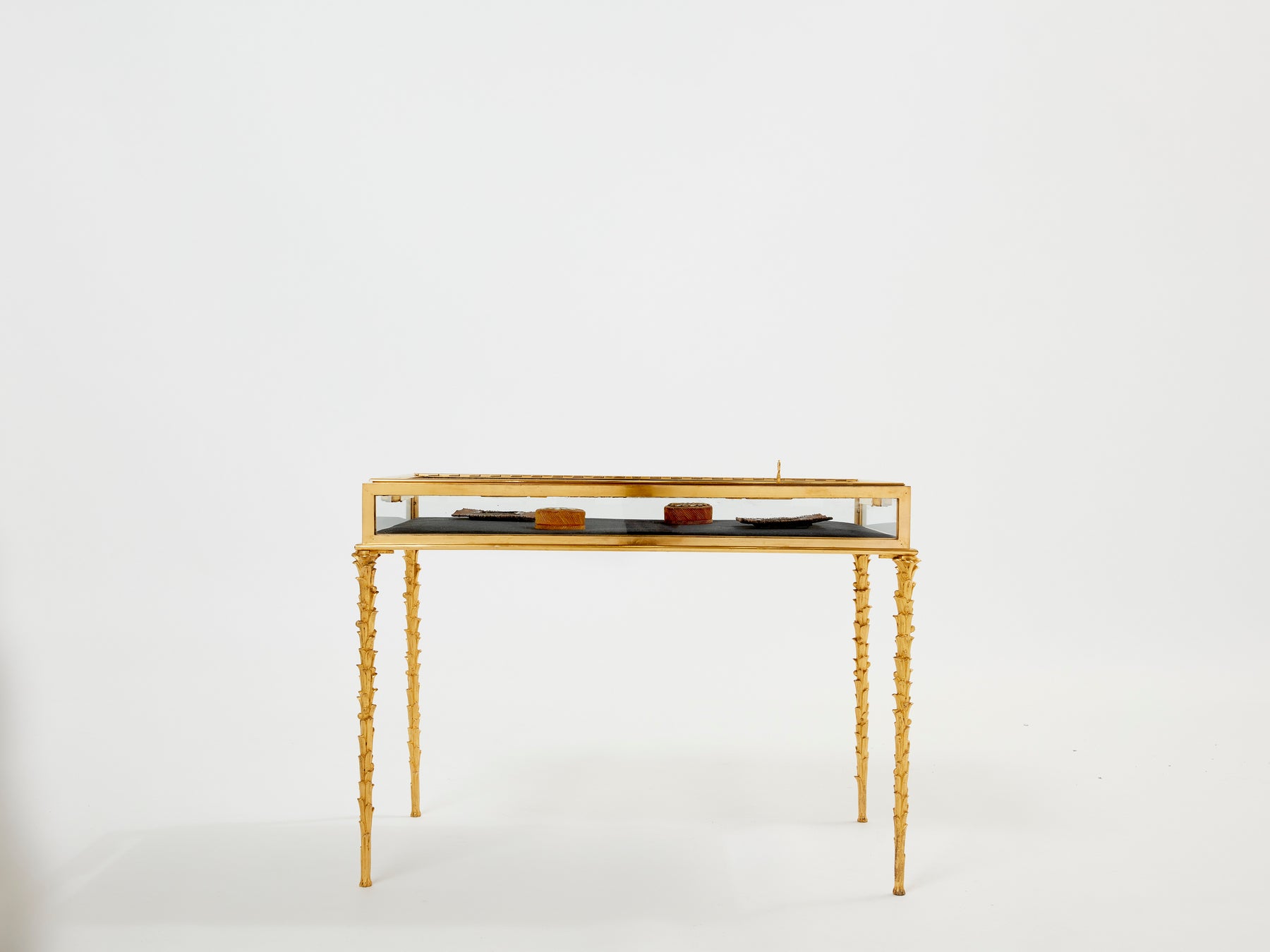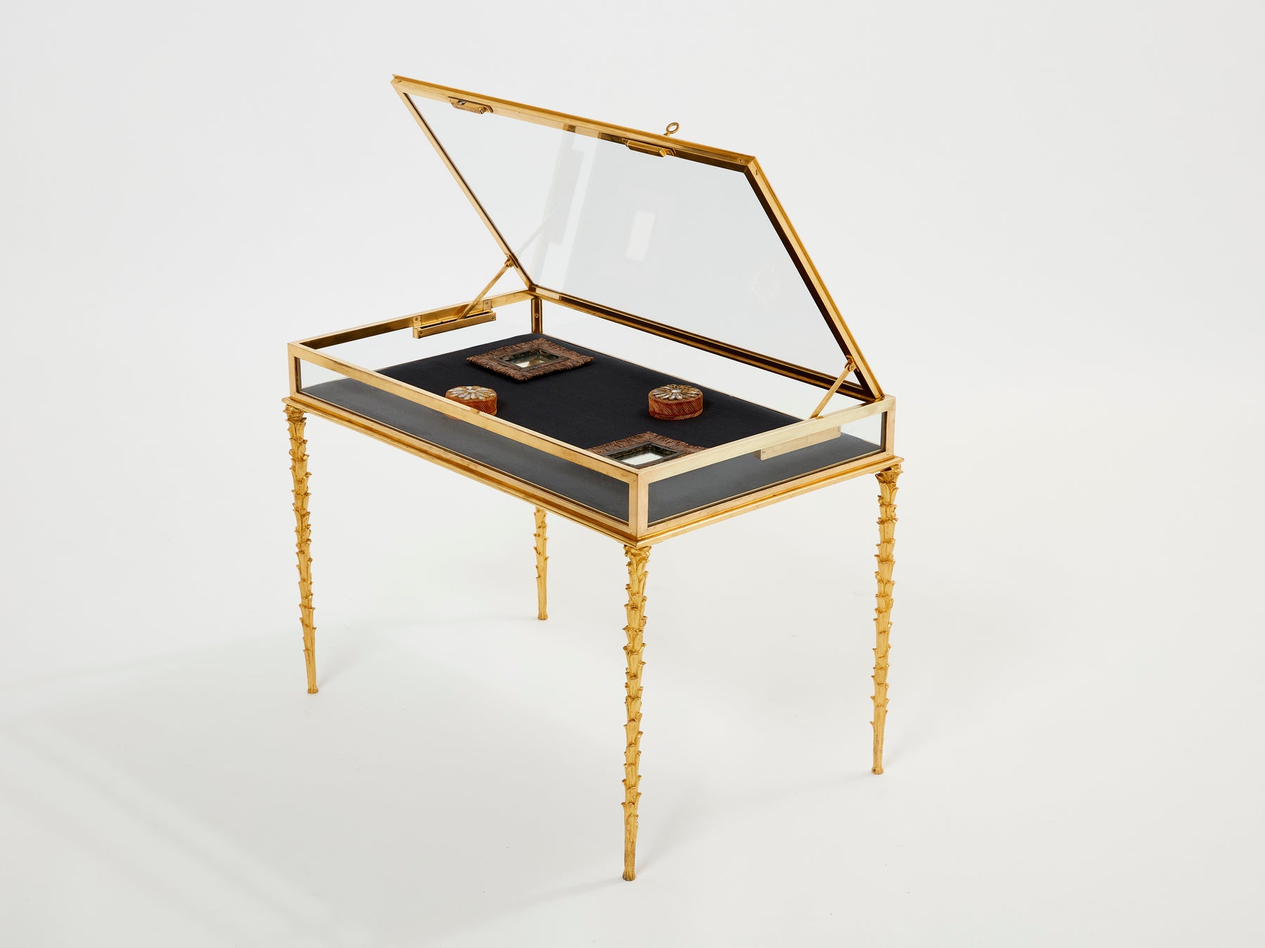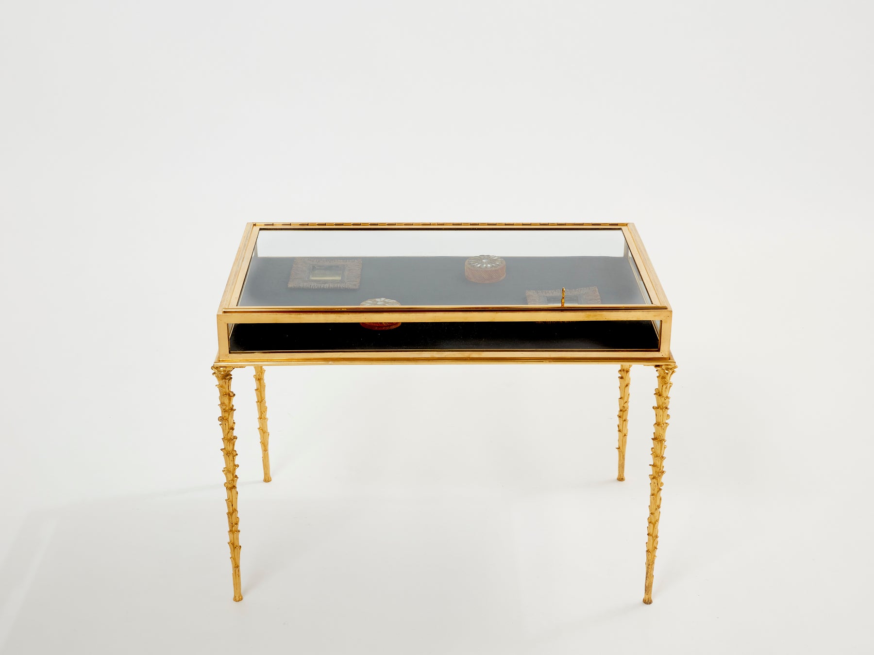 This beautiful French Maison Baguès vitrine table was created in the early 1950s with solid foliage shaped gilded bronze structure and a lined black velvet vitrine top. This table will be perfect as a side table in a bedroom, or a large dressing room, for a fine jewelry collection. The bronze foliage feet and structure details provide an imaginative base for the piece. This side table is typical of the Chinese inspired work of Maison Baguès in the 1950s and 1960s, and offers a timeless, sophisticated look, with plenty of amazing details. The gilded bronze structure has been clean, and has a beautiful patina, while the vitrine part has been fully restored, with the new velvet upholstery inside. A very rare find, found in an amazing vintage condition.