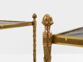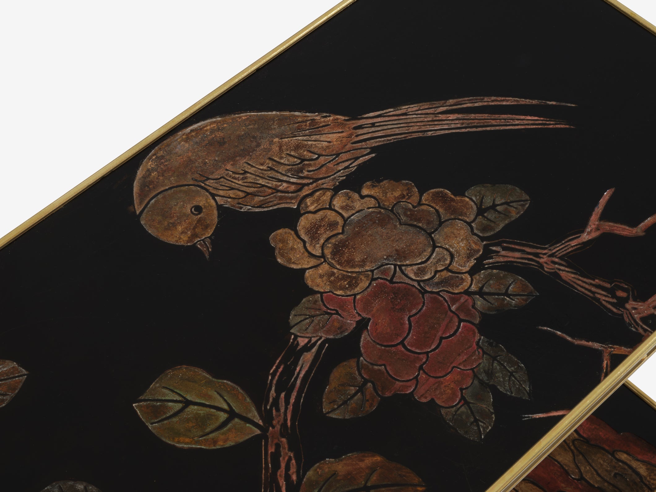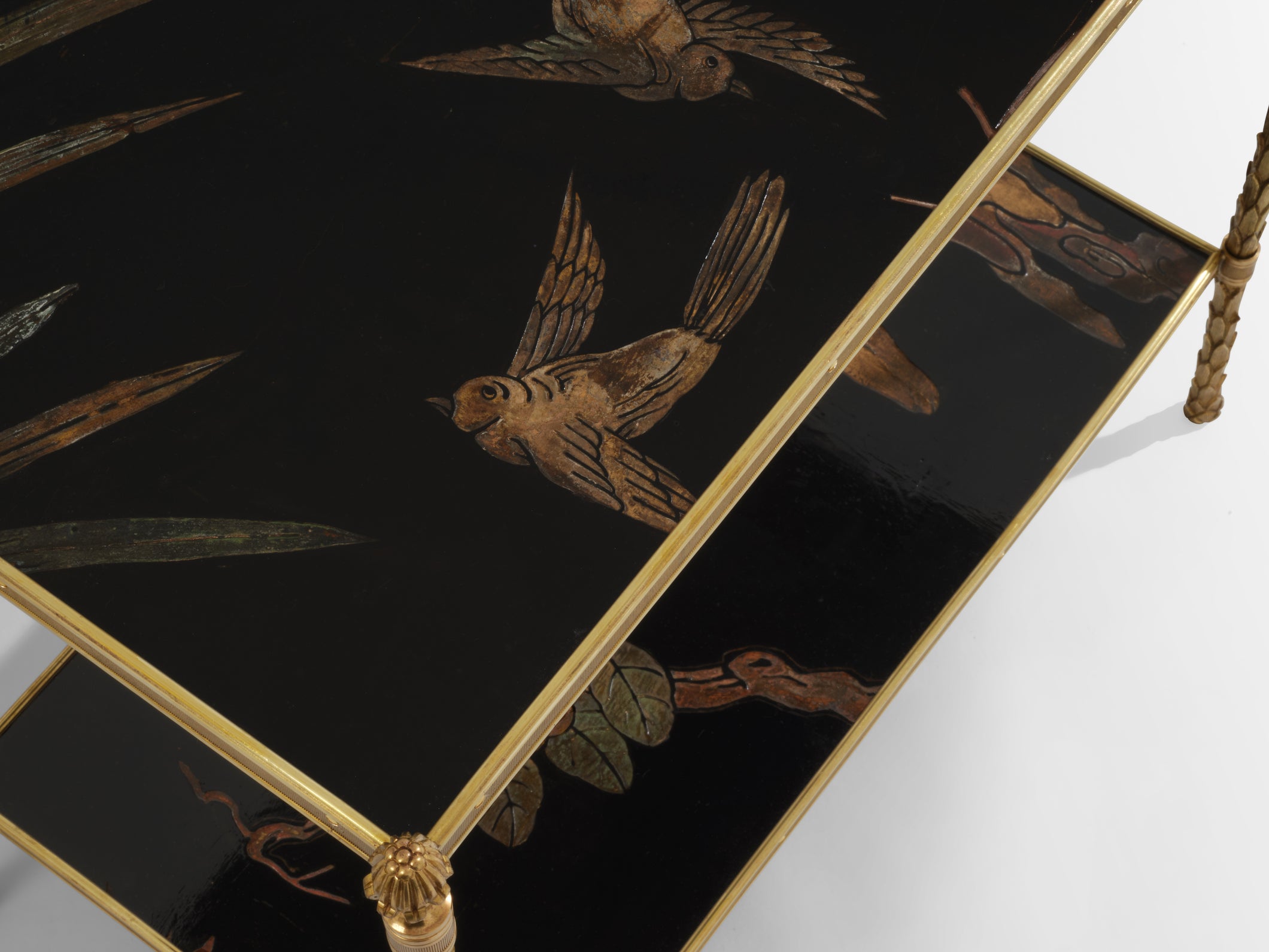 This beautiful pair of Maison Baguès chinoiserie two-tier end tables was created in the early 1940s with solid foliage shaped gilt bronze structure and a chinese decor lacquered top picturing birds and foliage on a tree. This table is typical of the Chinese inspired neoclassical work of Maison Baguès in the 1940s and 1950s, and offers a timeless, sophisticated look, with plenty of amazing details. The gilt bronze structure has been fully cleaned and has a beautiful patina, while the Chinese lacquer tops have been fully varnished. These tables are now found in an amazing condition. These are rare finds, and real statement pieces.