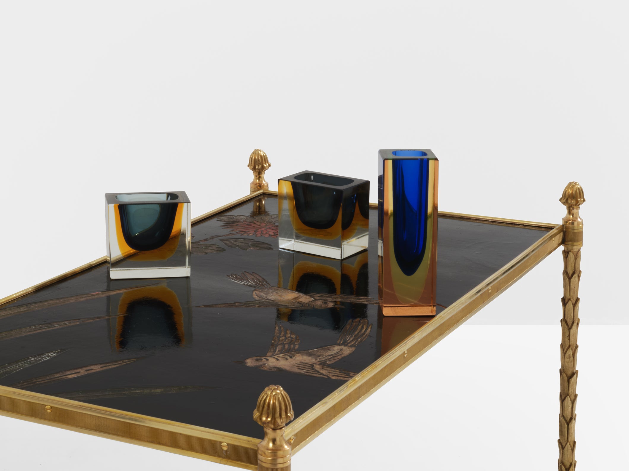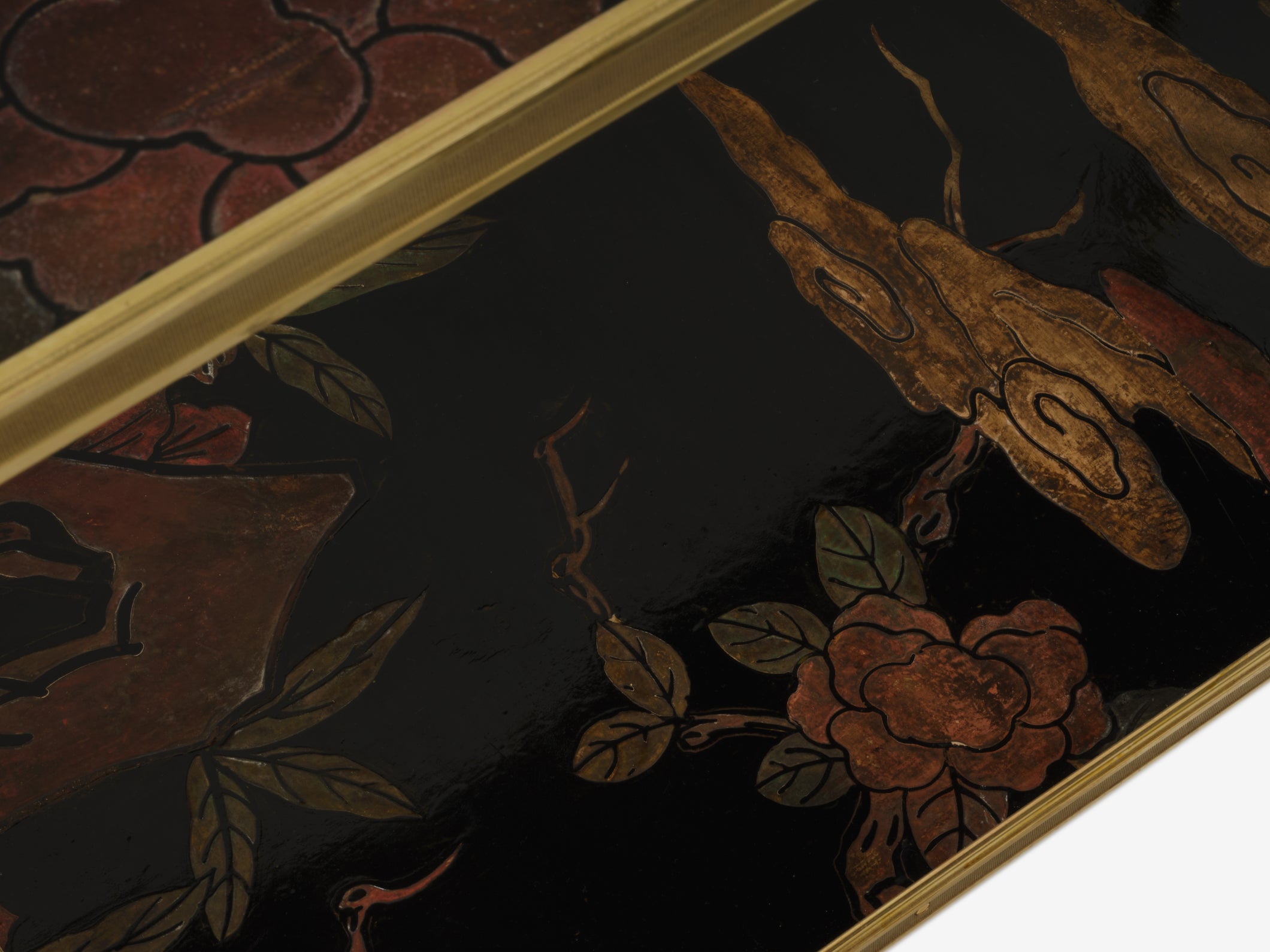 Maison Baguès foliage gilt bronze chinoiserie lacquered end tables 1940s