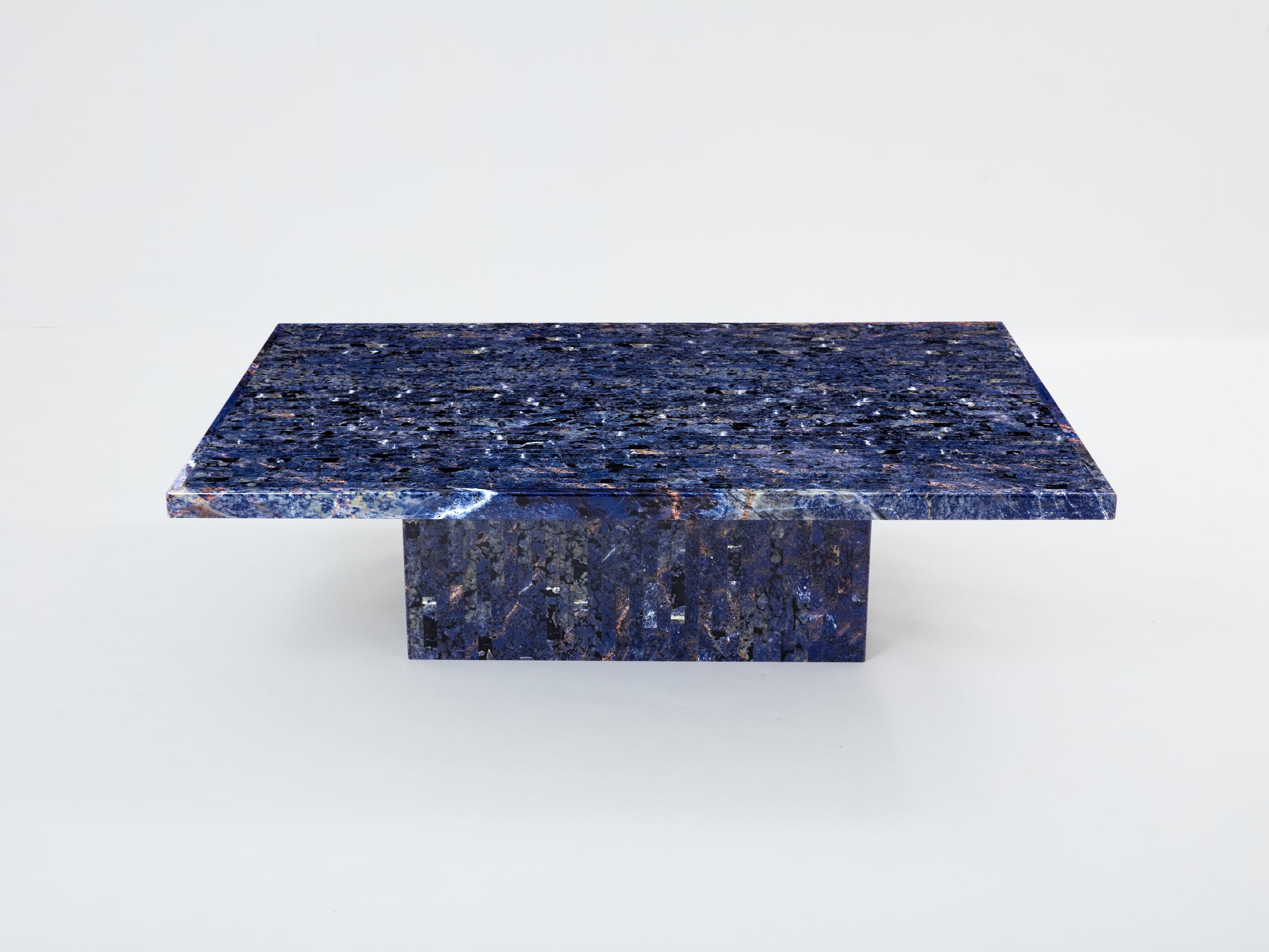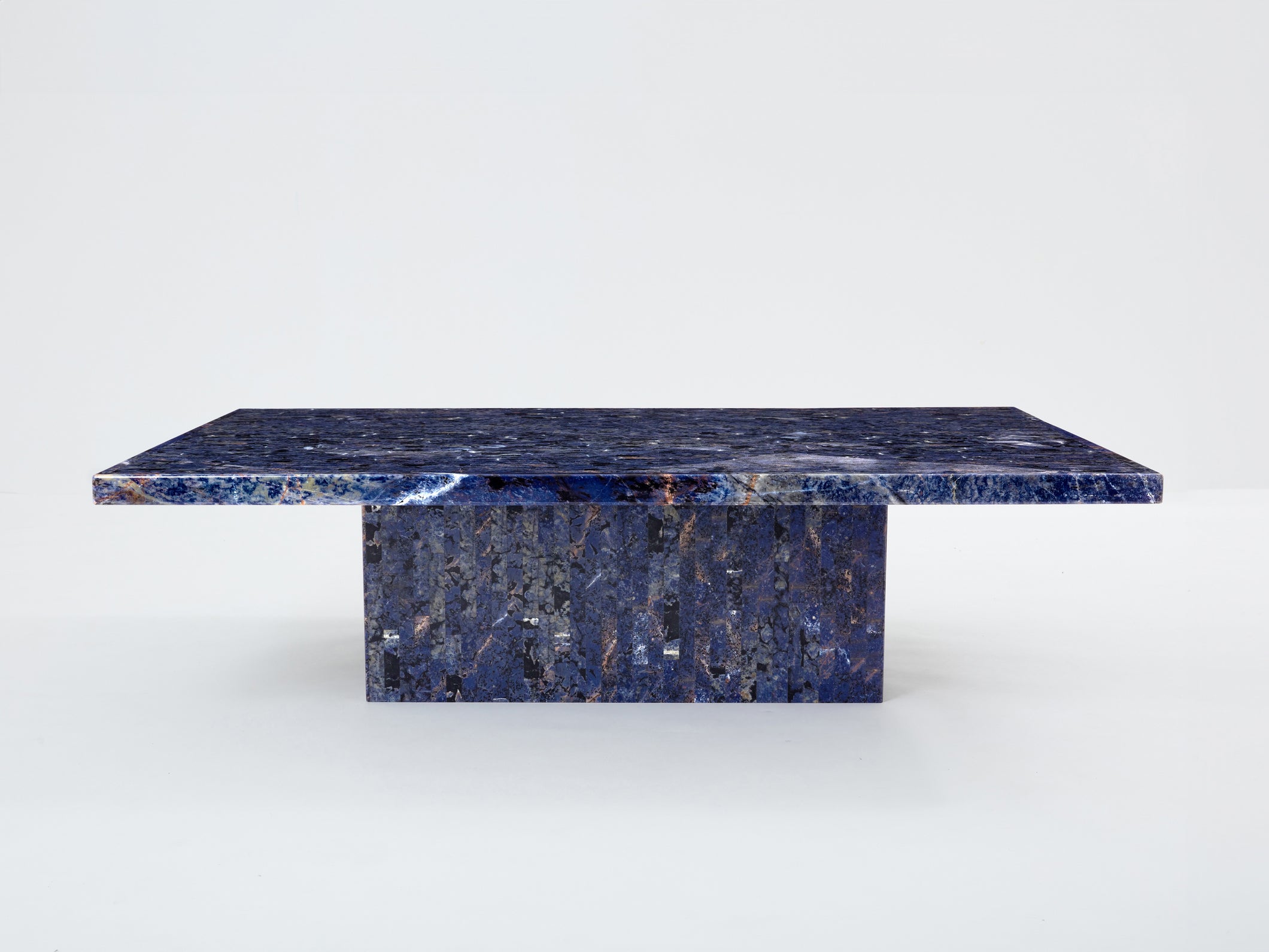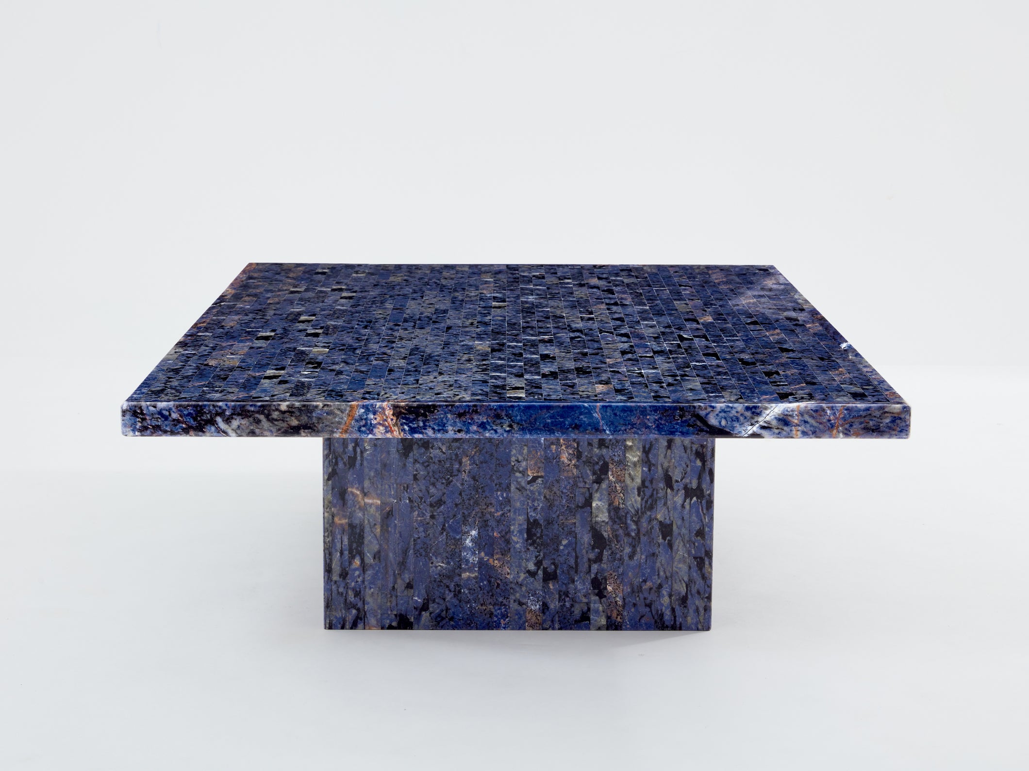 Unique lapis lazuli marquetry coffee table made to order by Maison Jansen in the late 1970s. The lapis lazuli is a deep-blue metamorphic rock used as a semi-precious stone that has been prized since antiquity for its intense color. The table top and base are entirely covered by lapis lazuli rectangle marquetry with amazing deep-blue contrasts and presence. This special coffee table has been fully repolished and revarnished, and is found in an amazing condition. A very rare and special find.