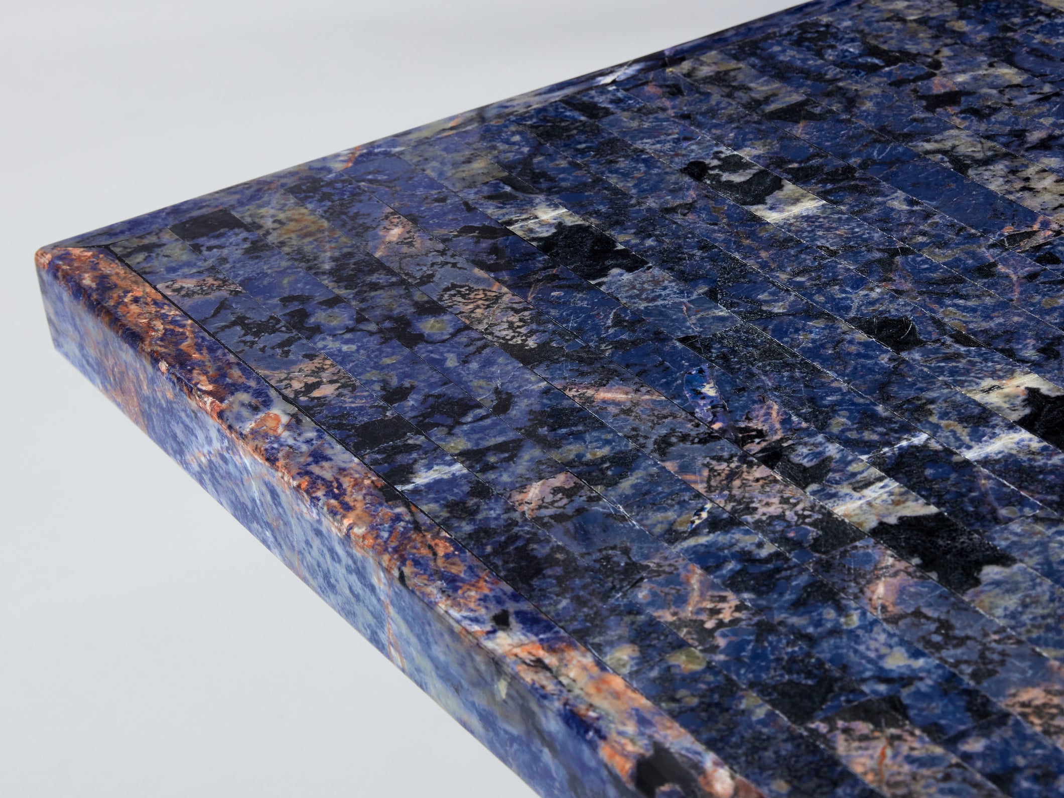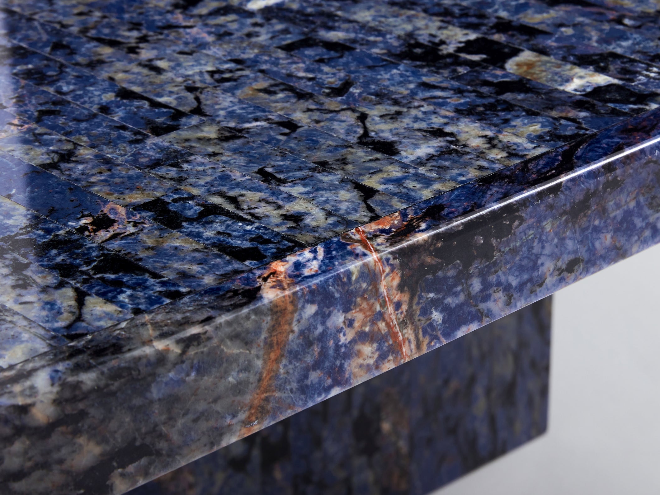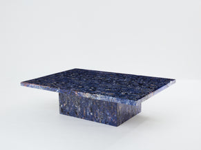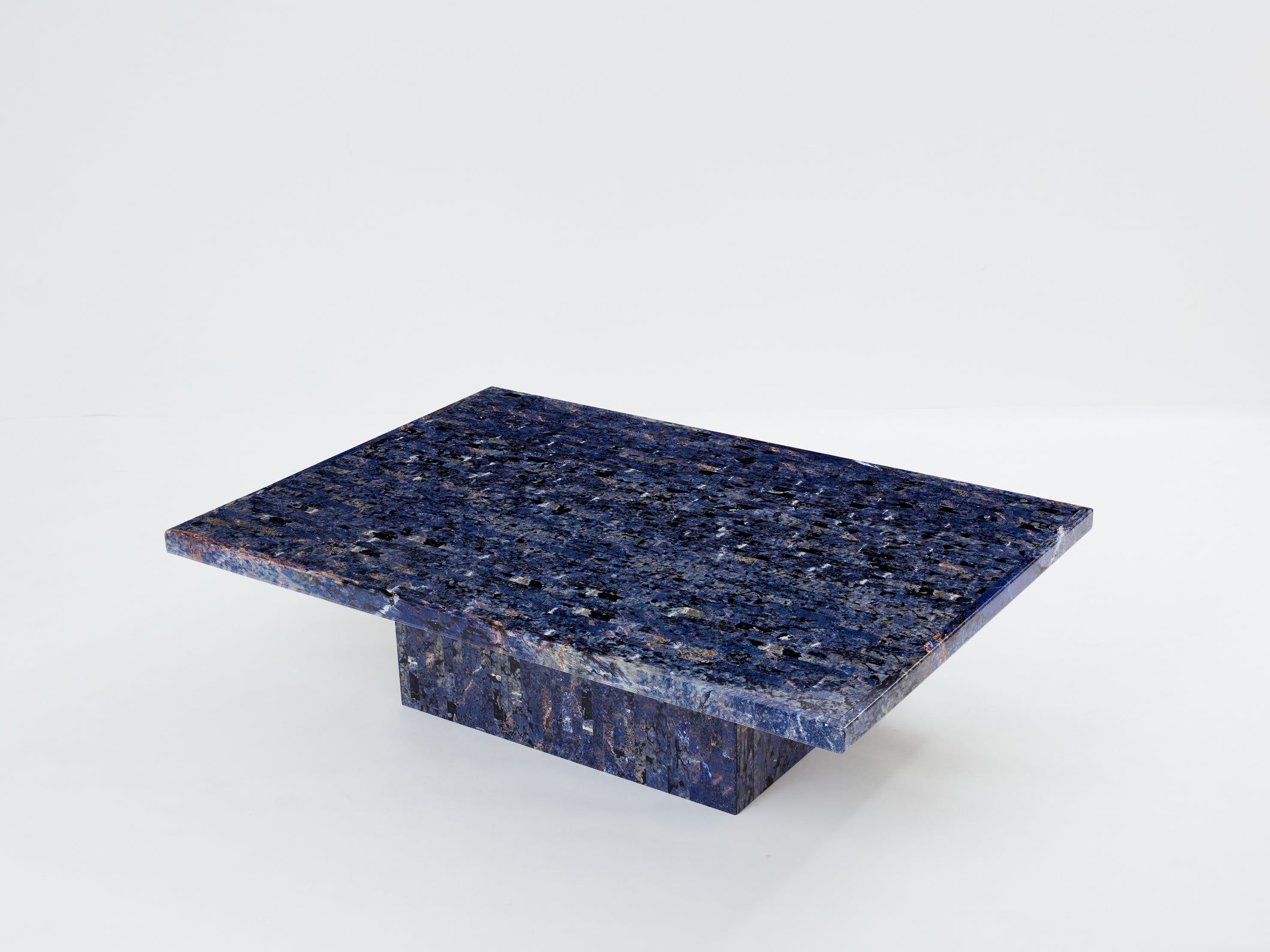Unique lapis lazuli marquetry coffee table made to order by Maison Jansen in the late 1970s. The lapis lazuli is a deep-blue metamorphic rock used as a semi-precious stone that has been prized since antiquity for its intense color. The table top and base are entirely covered by lapis lazuli rectangle marquetry with amazing deep-blue contrasts and presence. This special coffee table has been fully repolished and revarnished, and is found in an amazing condition. A very rare and special find.