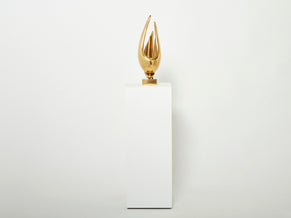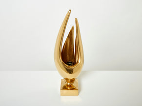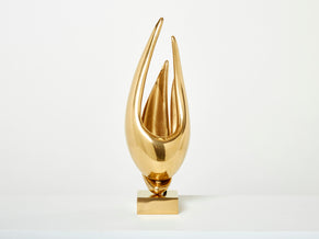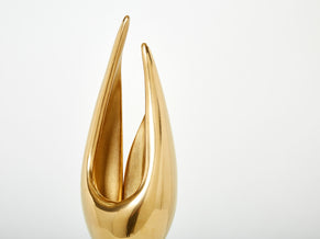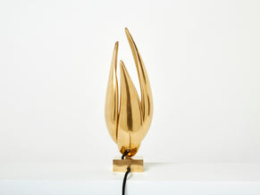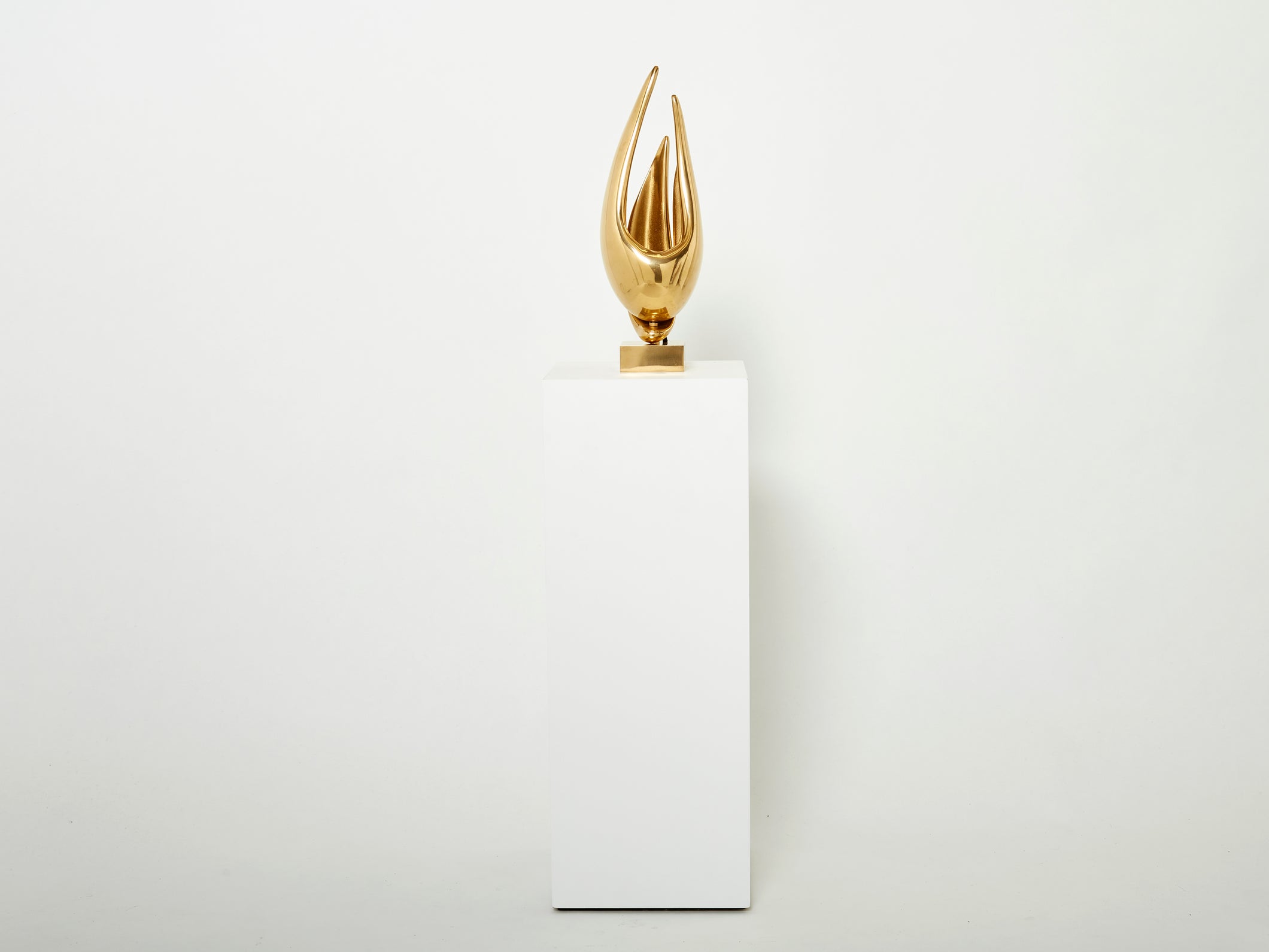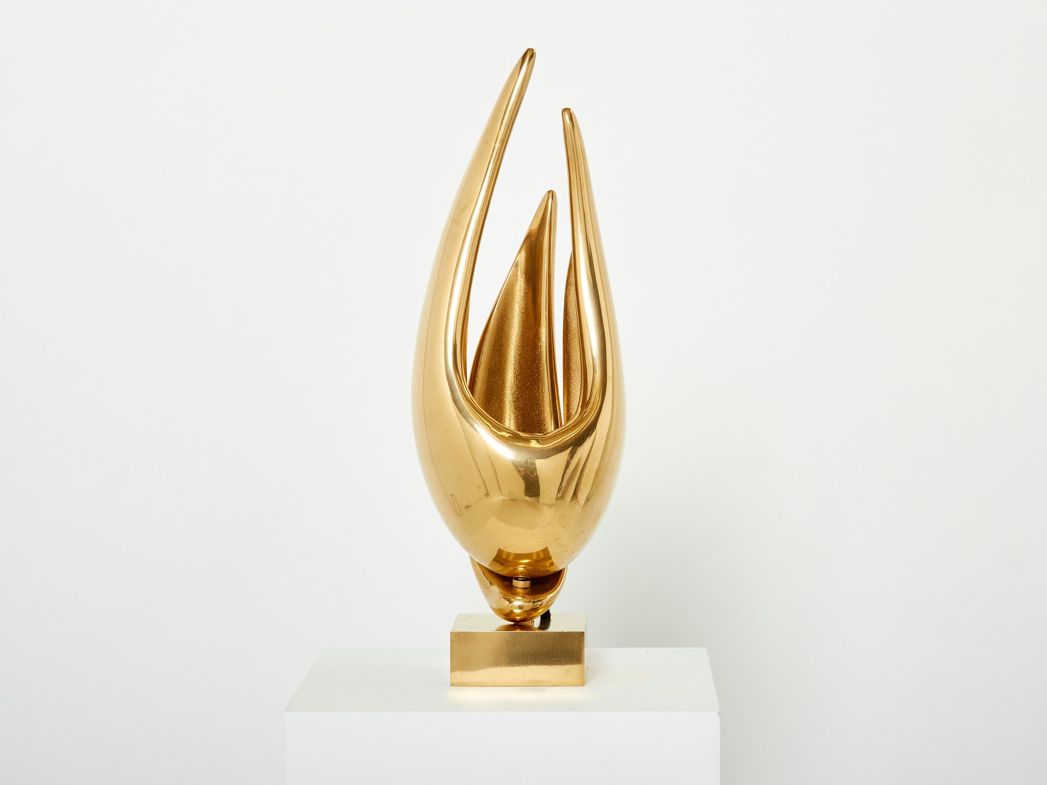 This beautiful table lamp produced by Atelier Michel Armand in the 1970s has the visual impact of a modernist sculpture. This rare model, named L’Envol, is made of solid bronze fully gilded, and shaped as a small flame. The result is the impression that this poetic lamp is a unique work of art. Indeed, all Michel Armand pieces were handmade, remaining a small production, heavy and highly qualitative. It has been fully cleaned, restored and re-electrified, and is found in an amazing condition. Rare, this lamp would make any space feel chic and special.