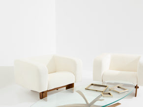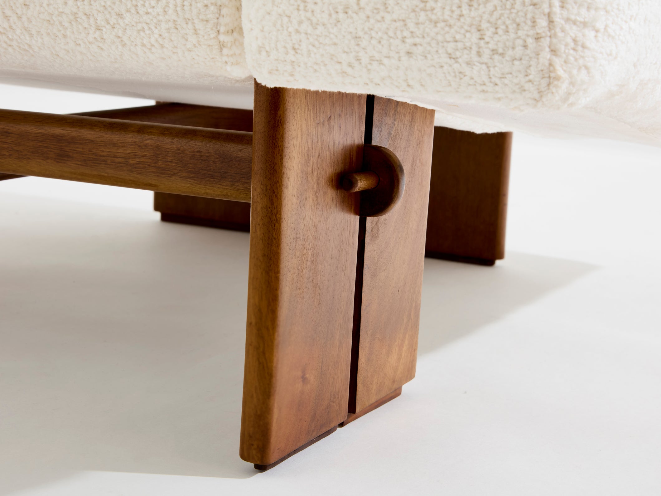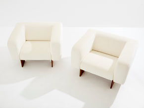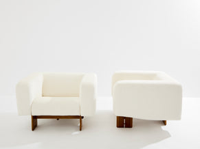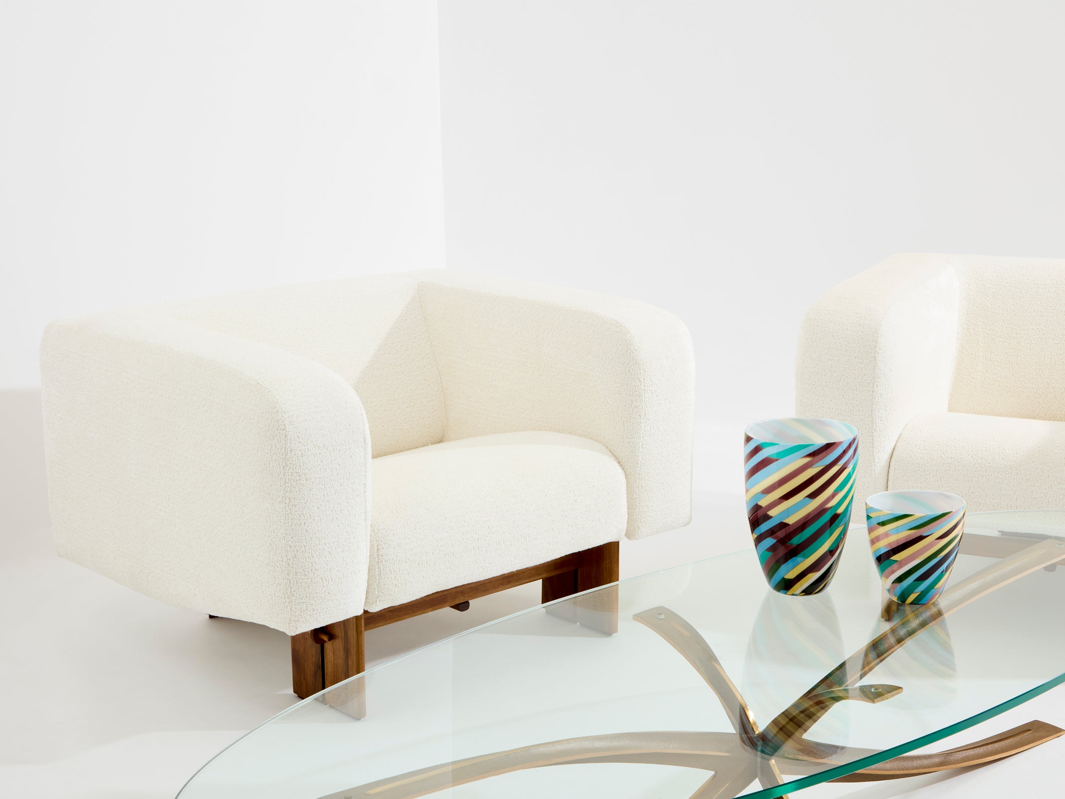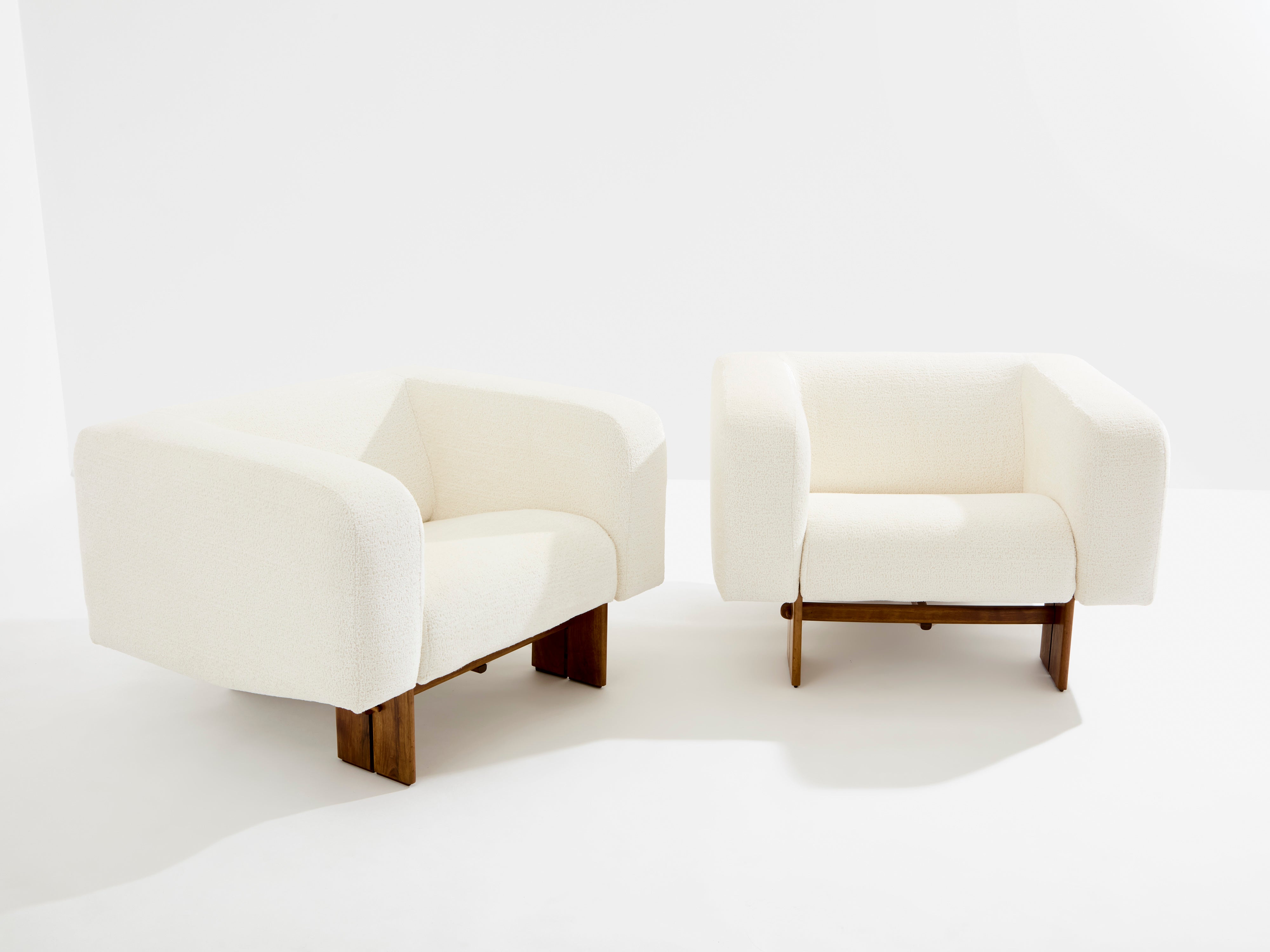 Beautiful pair of brutalist armchairs from an anonymous Italian designer created in the 1960s. The feet and structure are made of solid walnut, with beautiful details and craftsmanship. The seat features one high-density foam cushion with sharp lines, providing a very comfortable seating experience. These armchairs have been fully restored, seating foam replaced, and reupholstered with a soft chenille velvet fabric from Dedar.