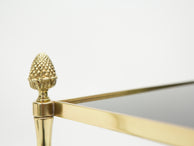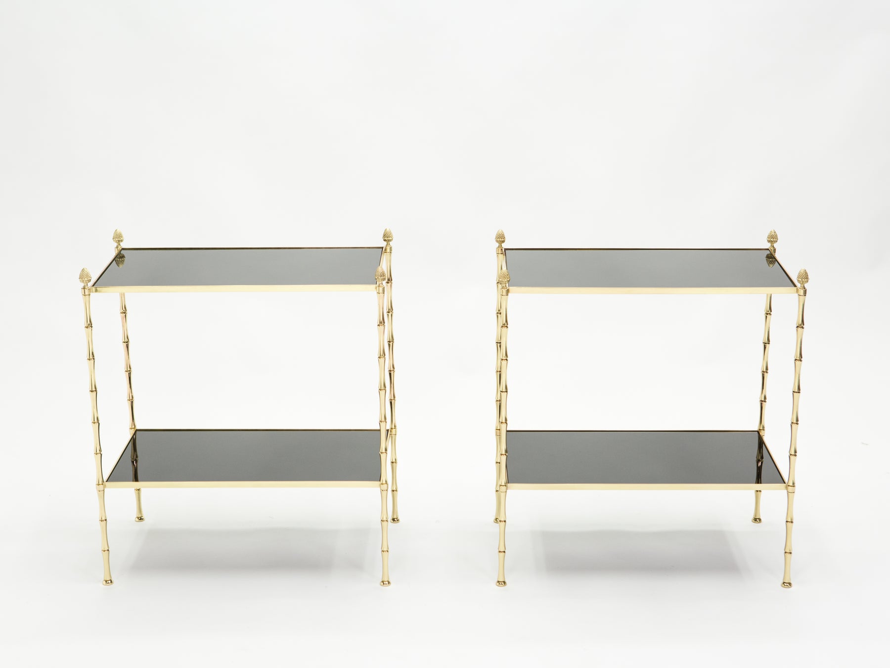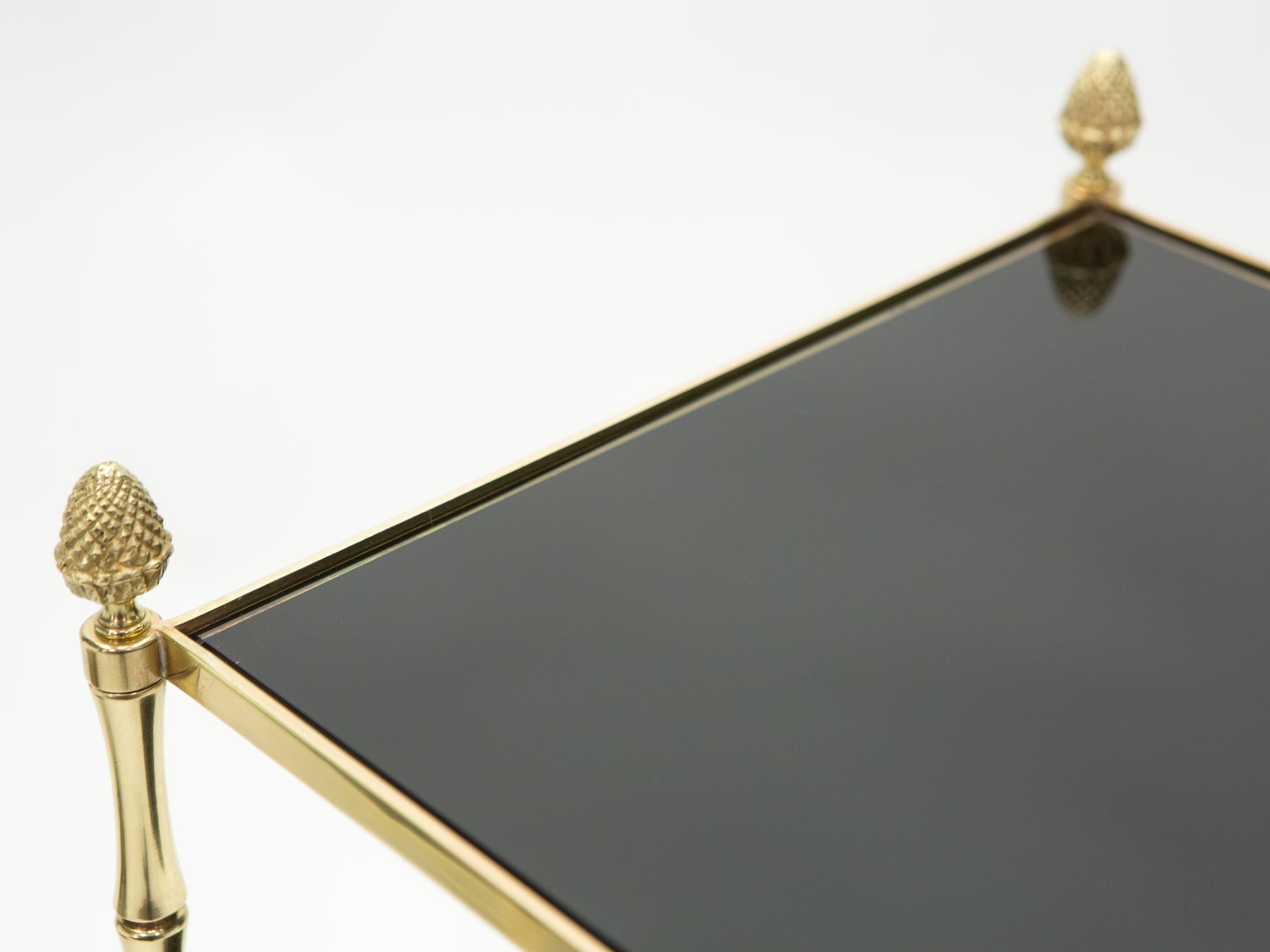 This pair of two-tier end tables by French house Maison Baguès was created with solid bamboo shaped brass, typical french neoclassical pine cone, and beautiful black opaline glass tops circa 1960. The two-tier black tops are timeless and smooth, while the brass feet and brass pine cone details provide an imaginative base for the piece. Its tapered feet and clean design are typical of the French neoclassical work by Maison Baguès and Maison Jansen, and offer a timeless, sophisticated look, simple, yet with plenty of amazing details.