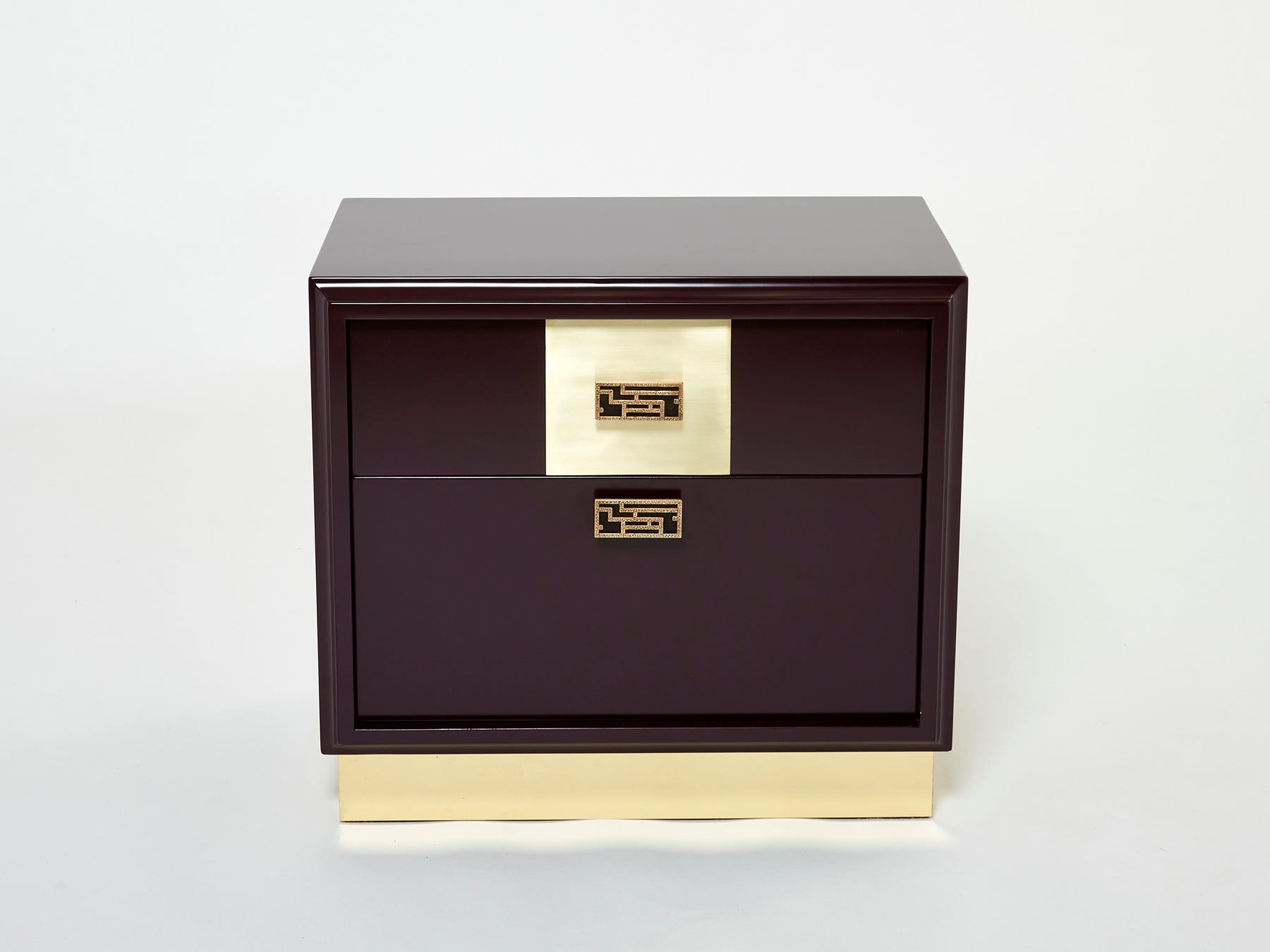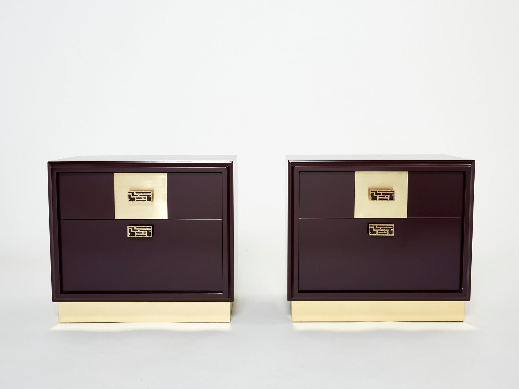 This rare pair of Italian Mid-Century plum prune lacquered nightstands would be stunning in any bedroom. Designed by Luciano Frigerio for Frigerio Di Desio in Italy in the late 1970s, the satin plum lacquer paired with the mix of polished and brushed brass materials and asian inspired handles is a thing of beauty. Both materials reflect light in a subdued way and create a warm and chic color palette. They both feature one drawer and one niche under. They have been fully restored, and are found in an amazing condition. There are fine examples of high-quality Italian design and craftsmanship from the 1970s.