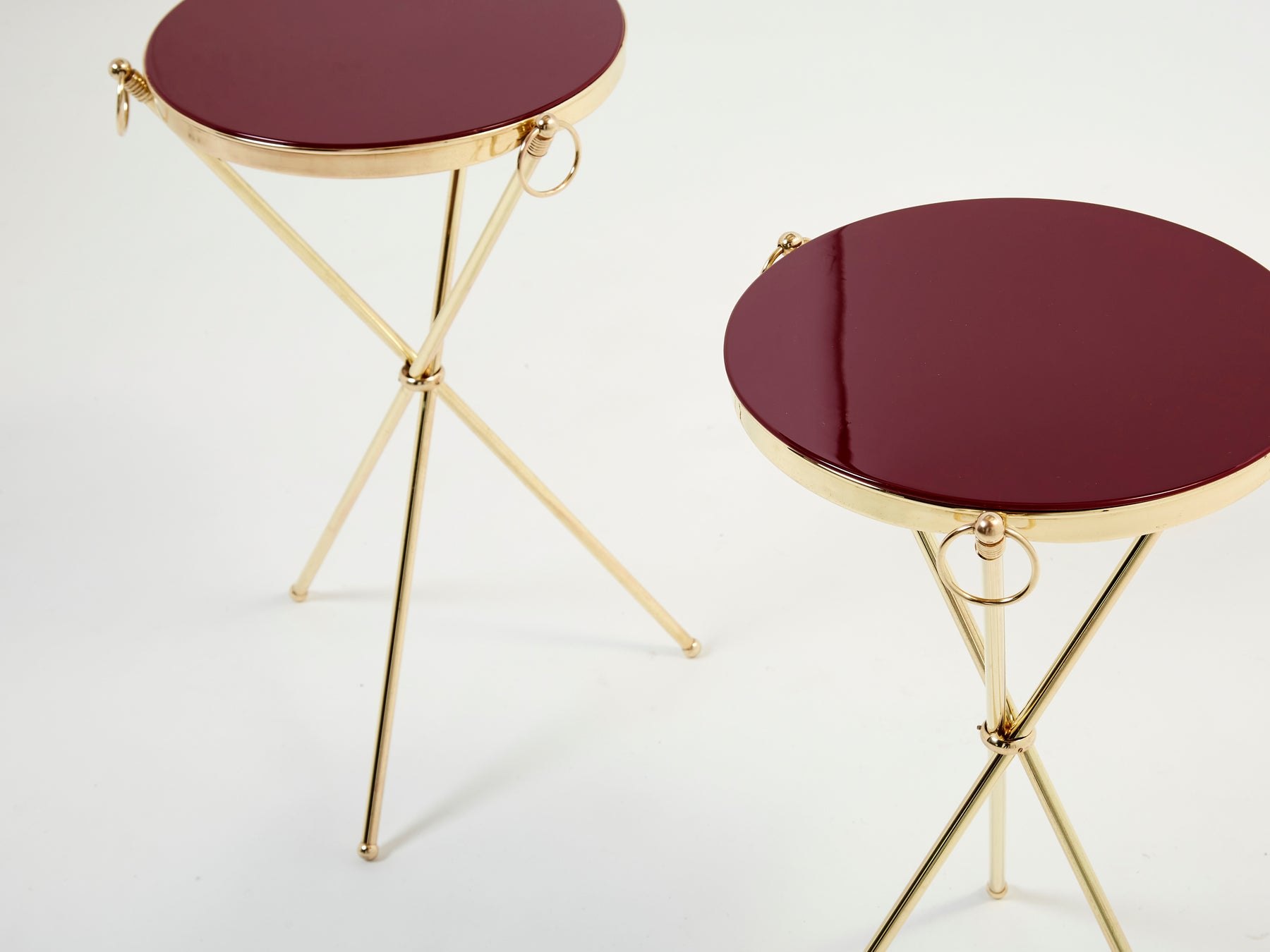 This pair of gueridon tables from the 1960’s is a beautiful statement piece of French firm Maison Jansen. With its sleek look, it feels inspired by Art Deco design, like André Arbus and Jean-Michel Frank, using the tripode shape with rings finish. The structures are made of varnished brass, with beautiful garnet red lacquer tops. This pair of tables feels elegant and timeless. They have been fully restored, tops relacquered, and are found in a great vintage condition. Would definitely be a beautiful addition to most interiors.