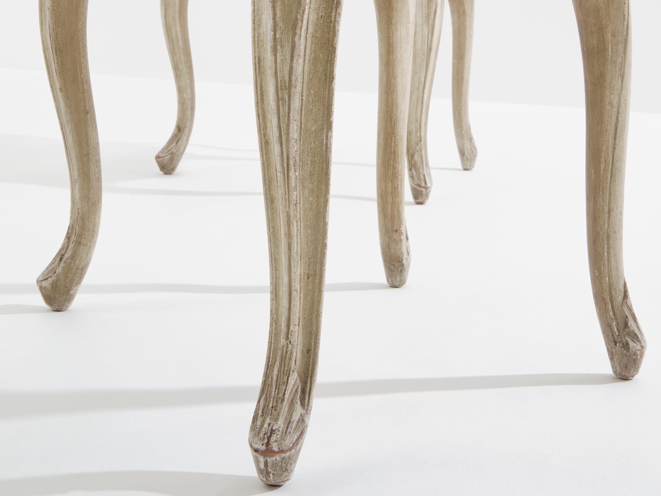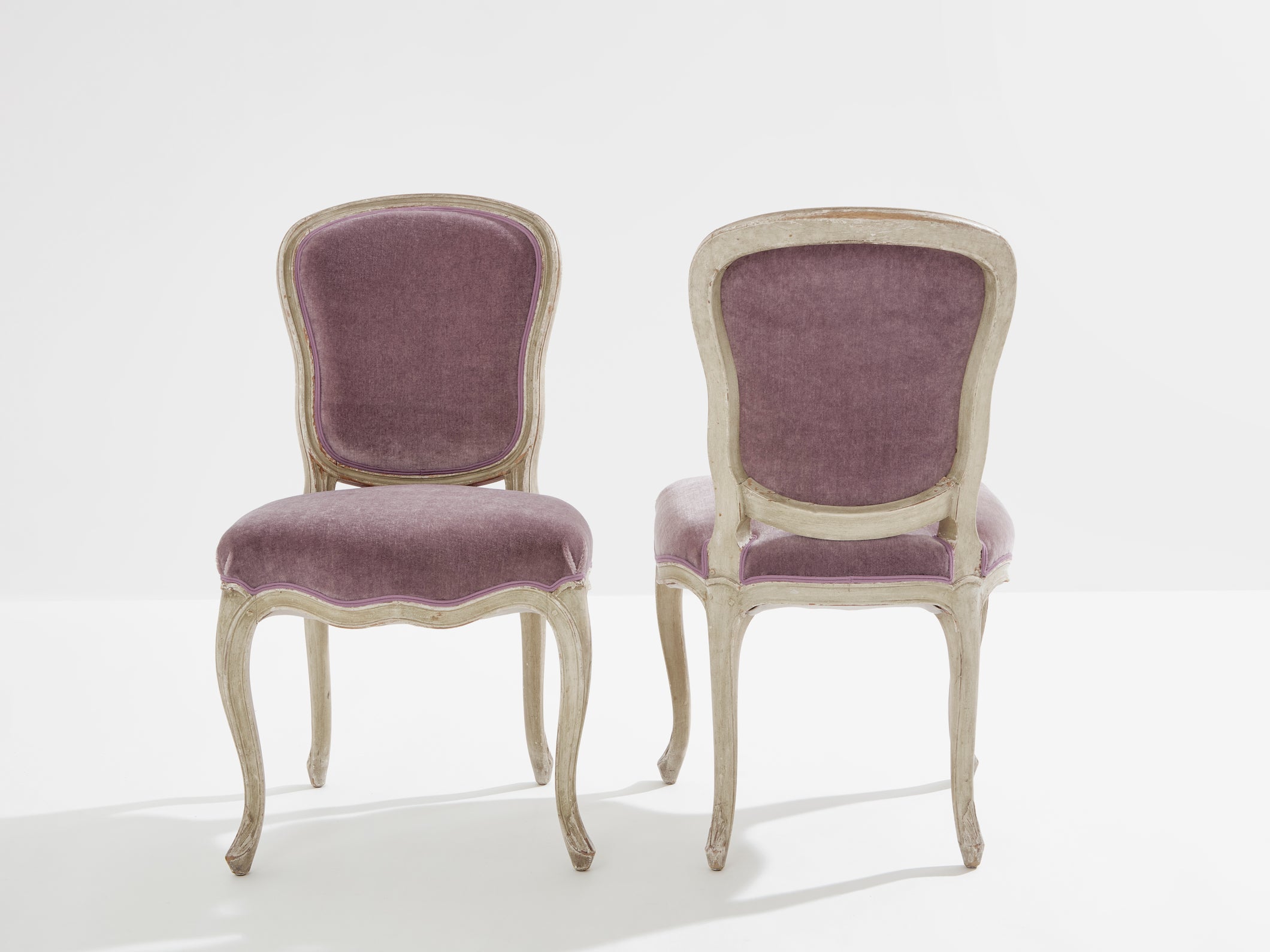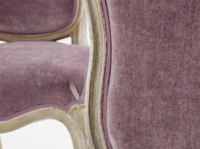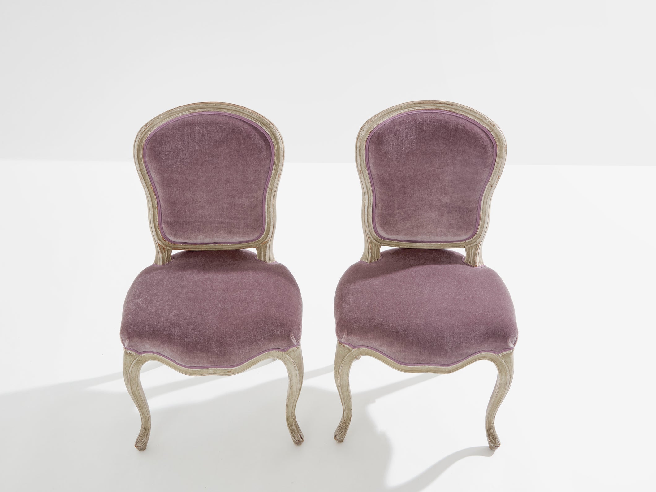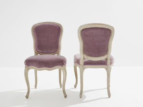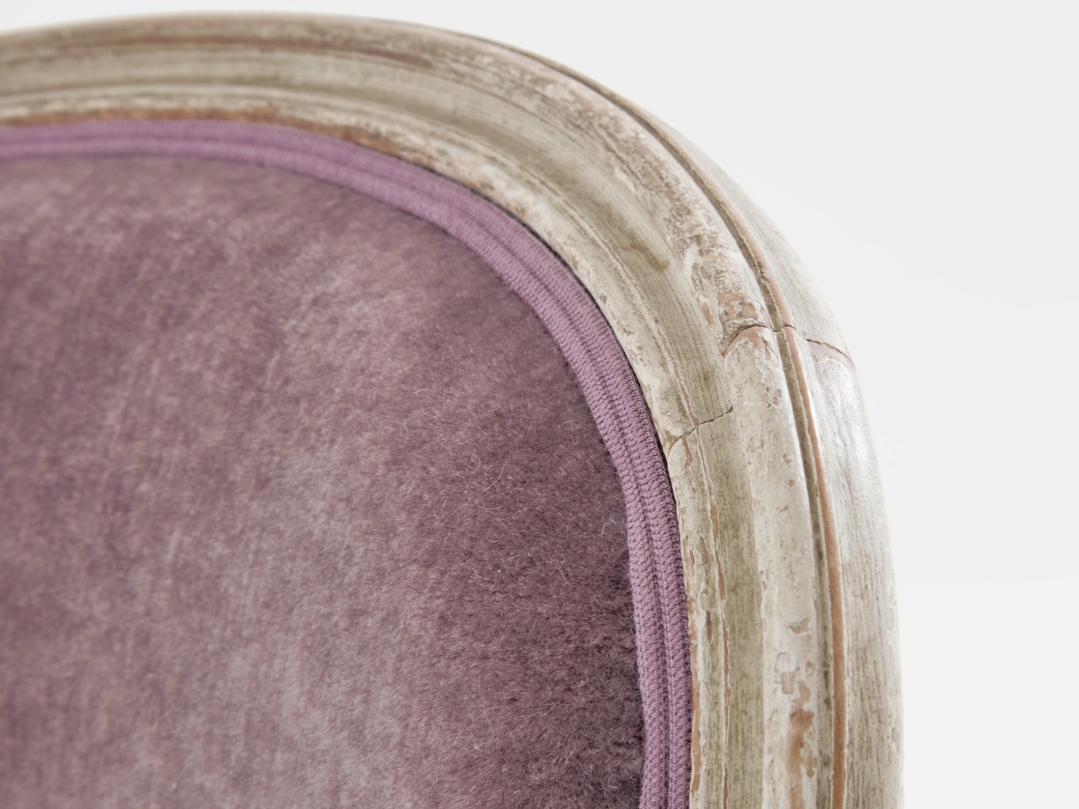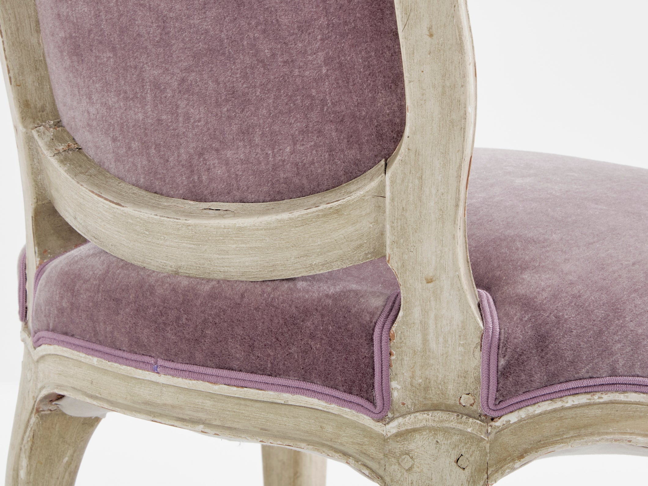 The craftsmanship of this pair of slipper chairs was deeply cared about, and it really shows some eight decades later. The side chairs were made and stamped by Maison Jansen in the early 1940s in their pure Neoclassical Louis XV inspired style. The beautiful painted oak wood structure has developed a stunning beige patina over time. They have been fully reupholstered with a beautiful dusty lilac mohair velvet from Zimmer + Rohde. Each chair stamped JANSEN. Two other armchairs from the same set are also available.