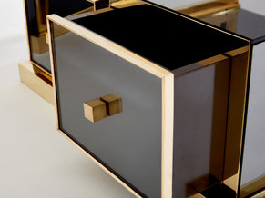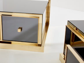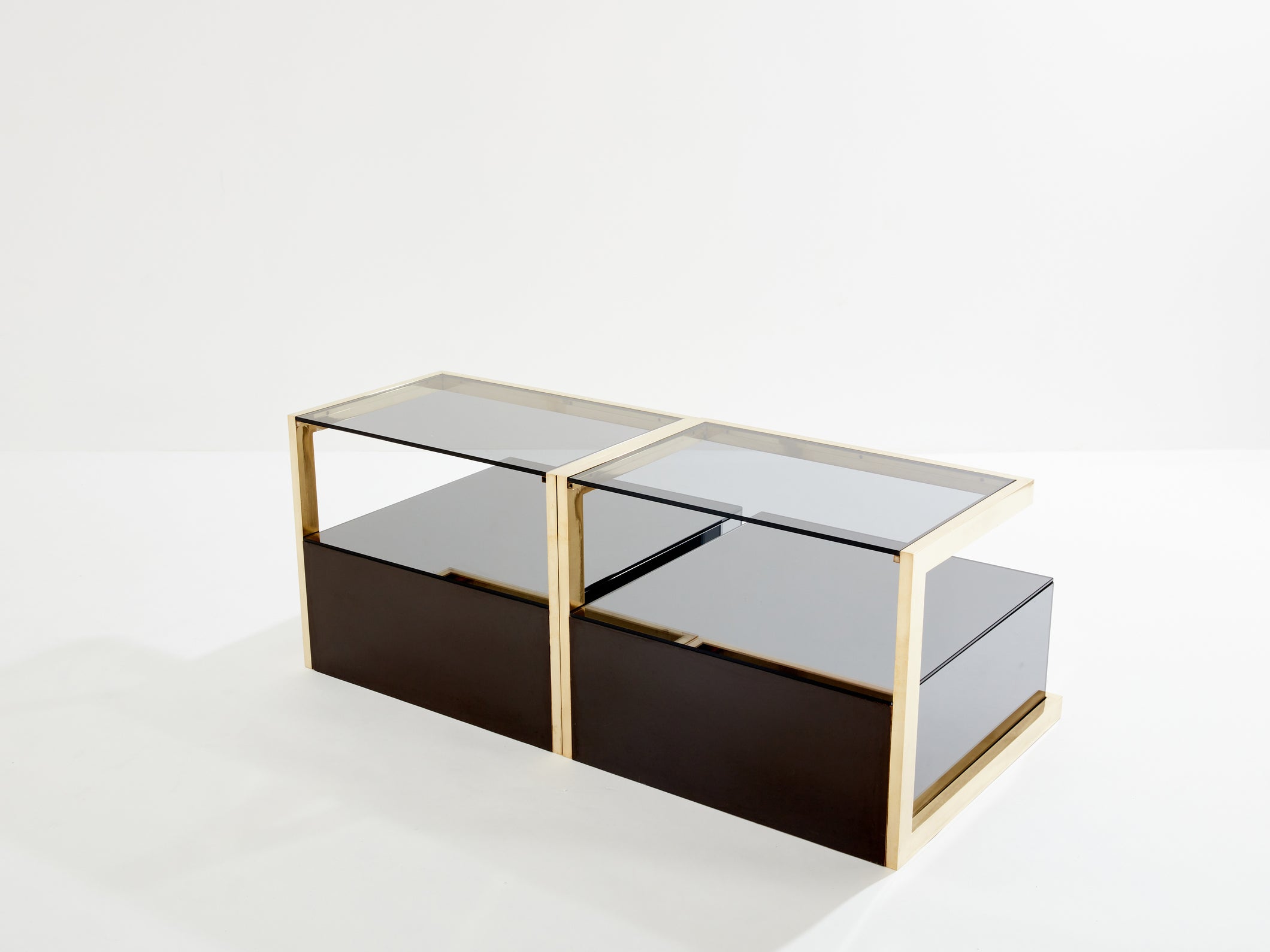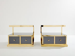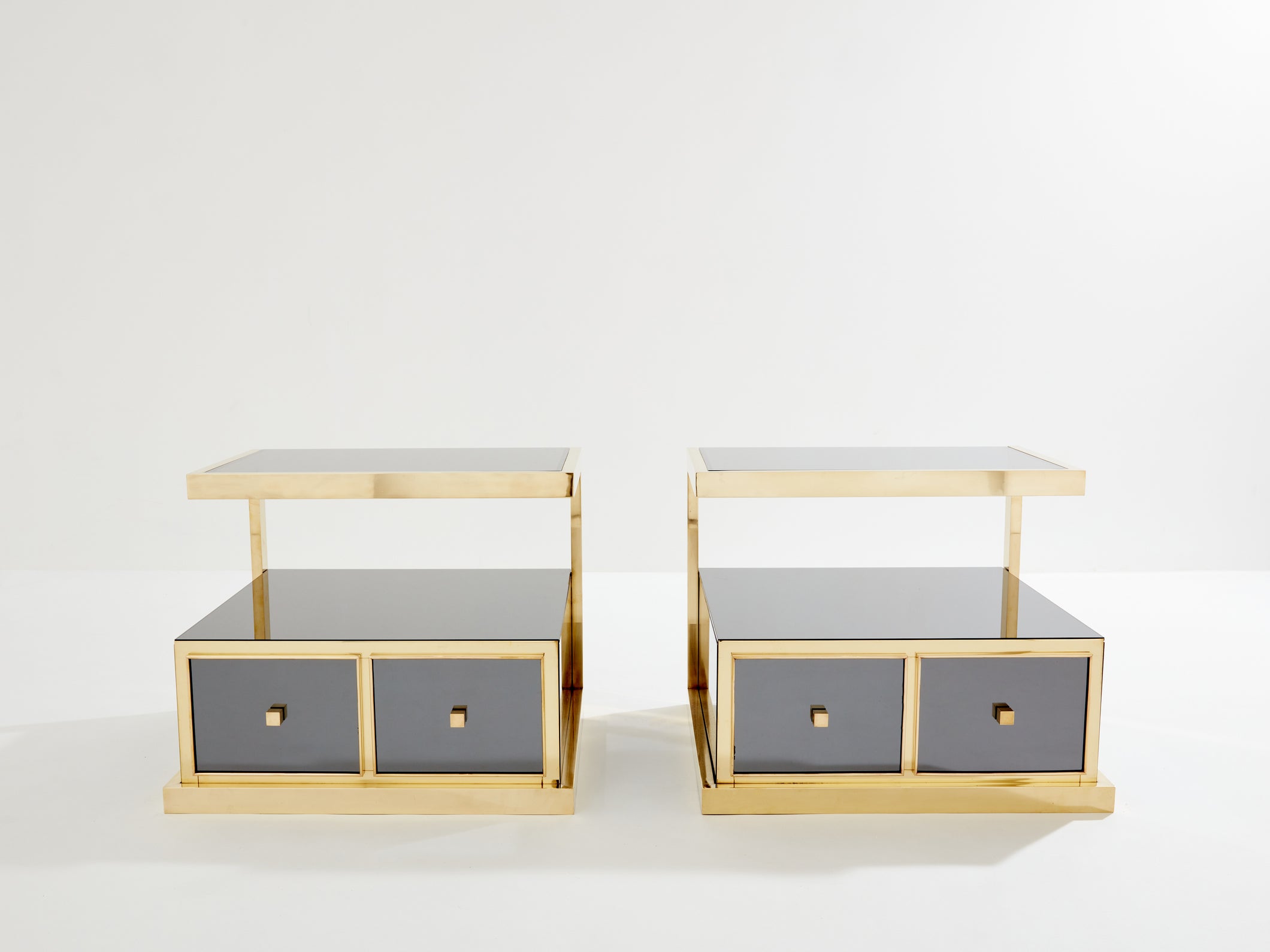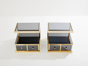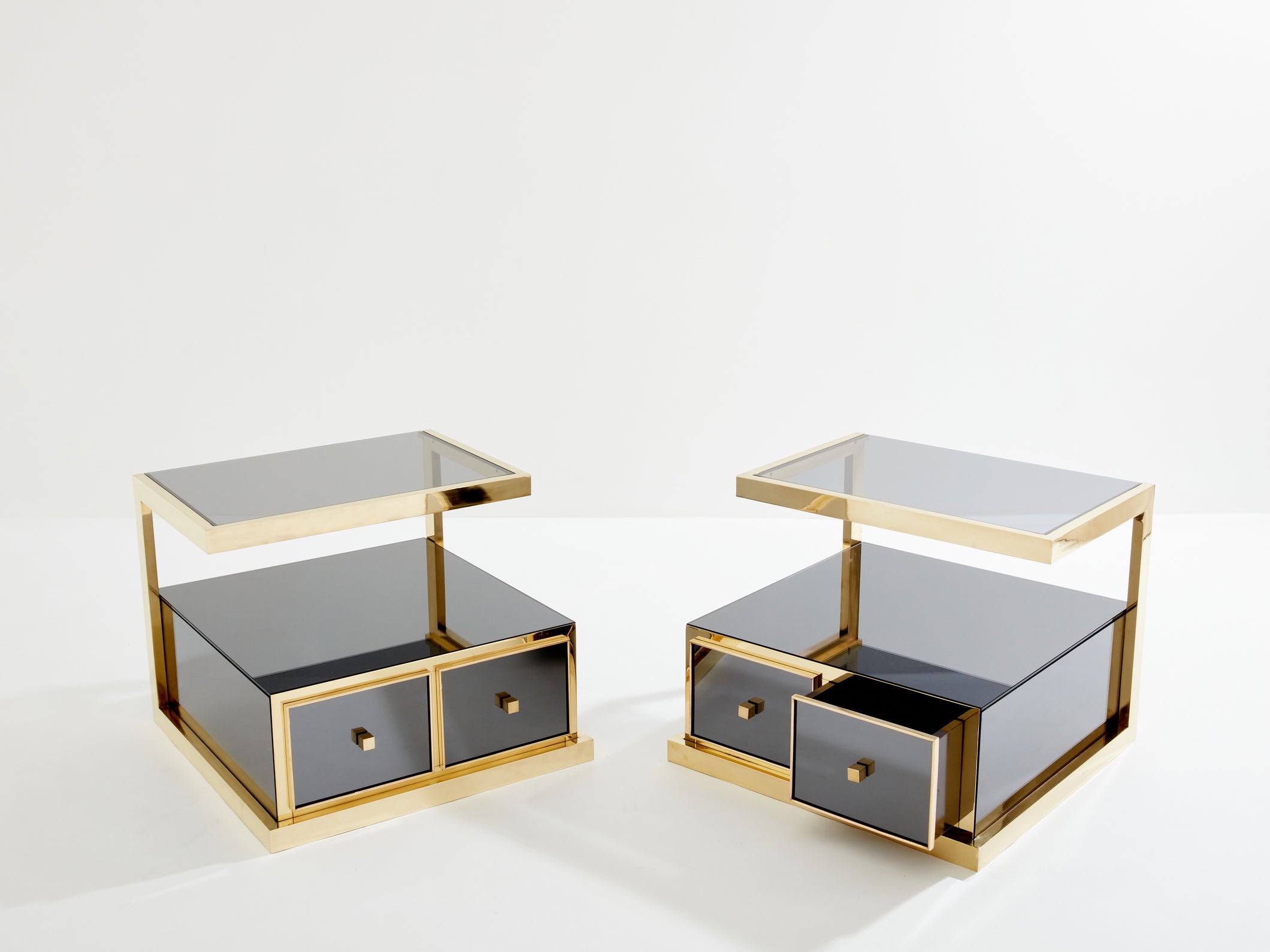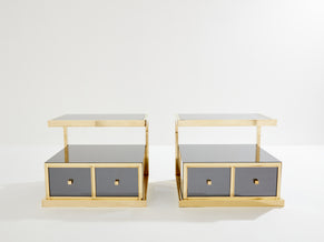This rare pair of two-drawers grey smoked mirrored and brass side tables, or bedside tables, would be stunning in any room. Designed by Michel Pignères in France in the late 1970s, the mix of polished brass materials with smoked mirrors and smoked glass top is a thing of beauty. All materials reflect light in a subdued way and create a warm and chic color palette. Fully restored, brass repolished and glass tops replaced, these tables are found in a very good vintage condition, and are a fine example of high-quality French design and craftsmanship, heavy, with a top notch construction and finish.