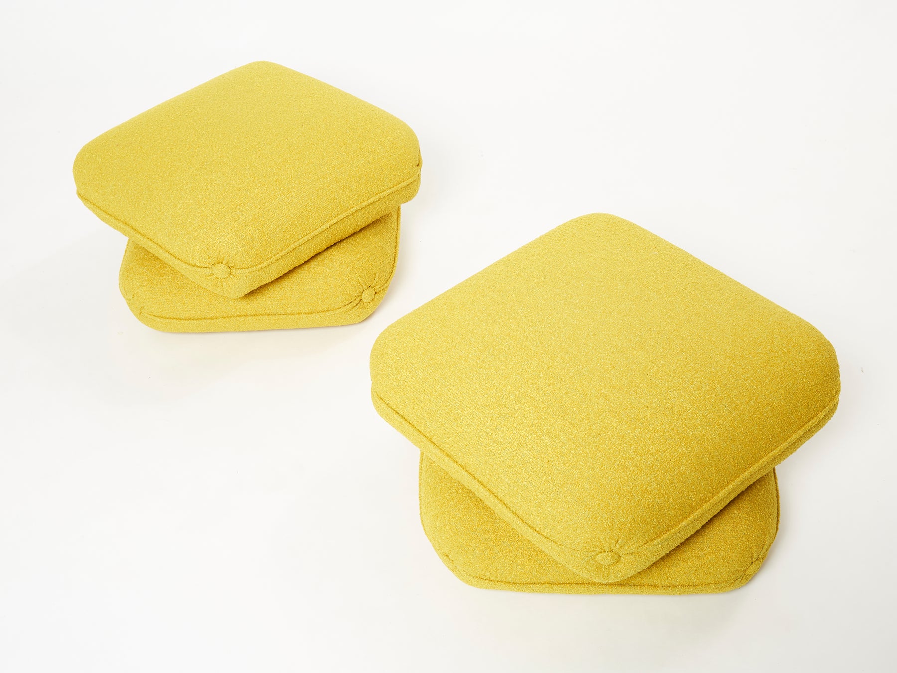 Beautiful pair of poufs or ottomans by French Designer Jacques Charpentier for Maison Jansen in the mid-seventies. The poufs consist of two large cushion elements connected together holding them in place. They have been newly upholstered in a very nice safran color outdoor bouclé fabric from French editor Nobilis - Zeste model for soft yet elegant feel. This ottomans set exudes a stylized 1970s allure that will anchor your space in french mid-century modernity.