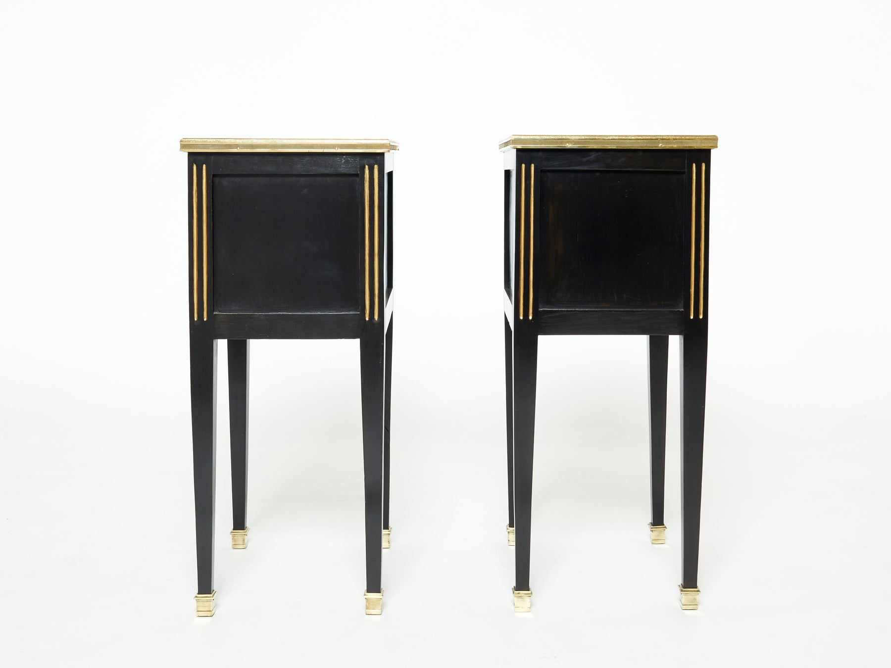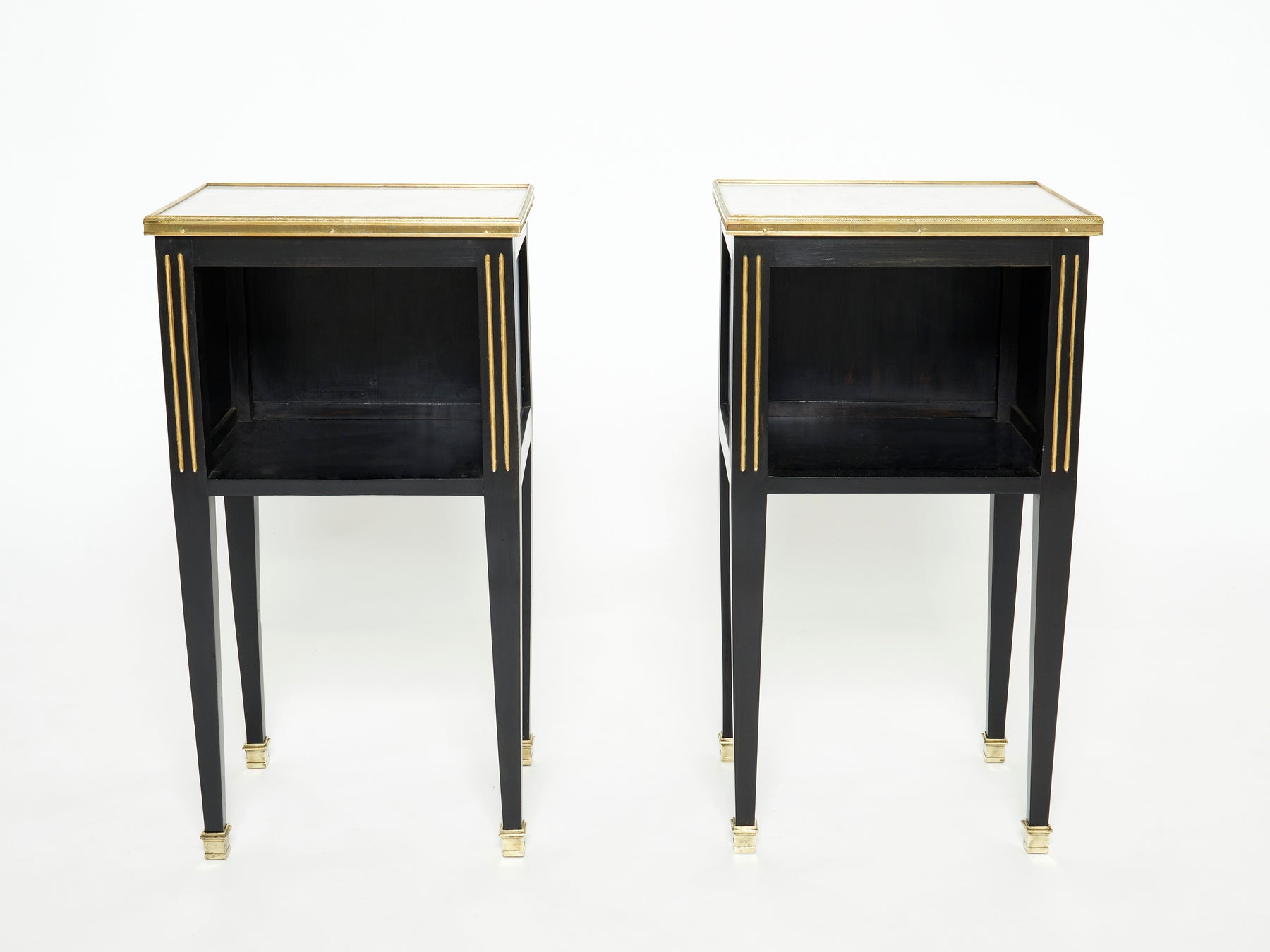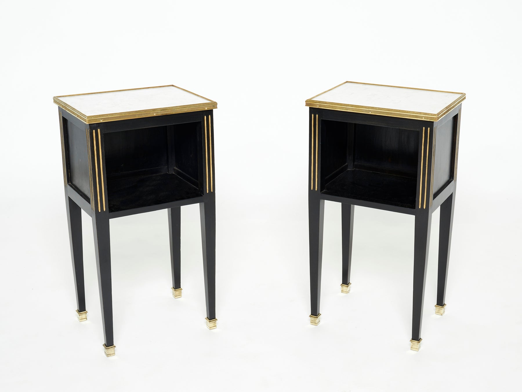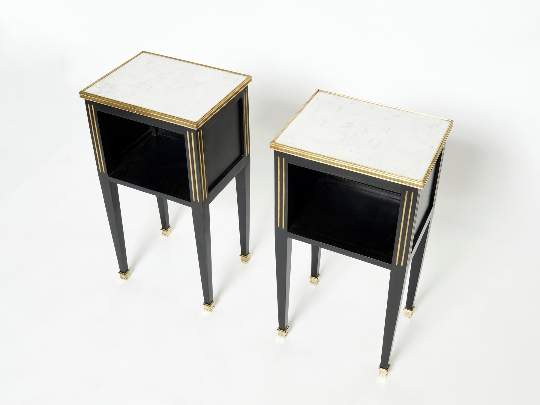 This rare pair of nightstands or end tables by French house Maison Jansen was created in the early 1950s with black varnished mahogany wood, with brass details and white marble top. Typical and timeless french neoclassical style from Maison Jansen, each table features a niche. They have been fully restored and refinished, and are in an amazing condition. A rare find, high quality made, with a lot of attention to details, both stamped Jansen.