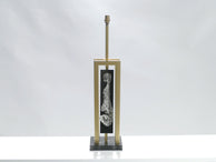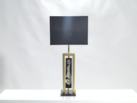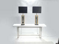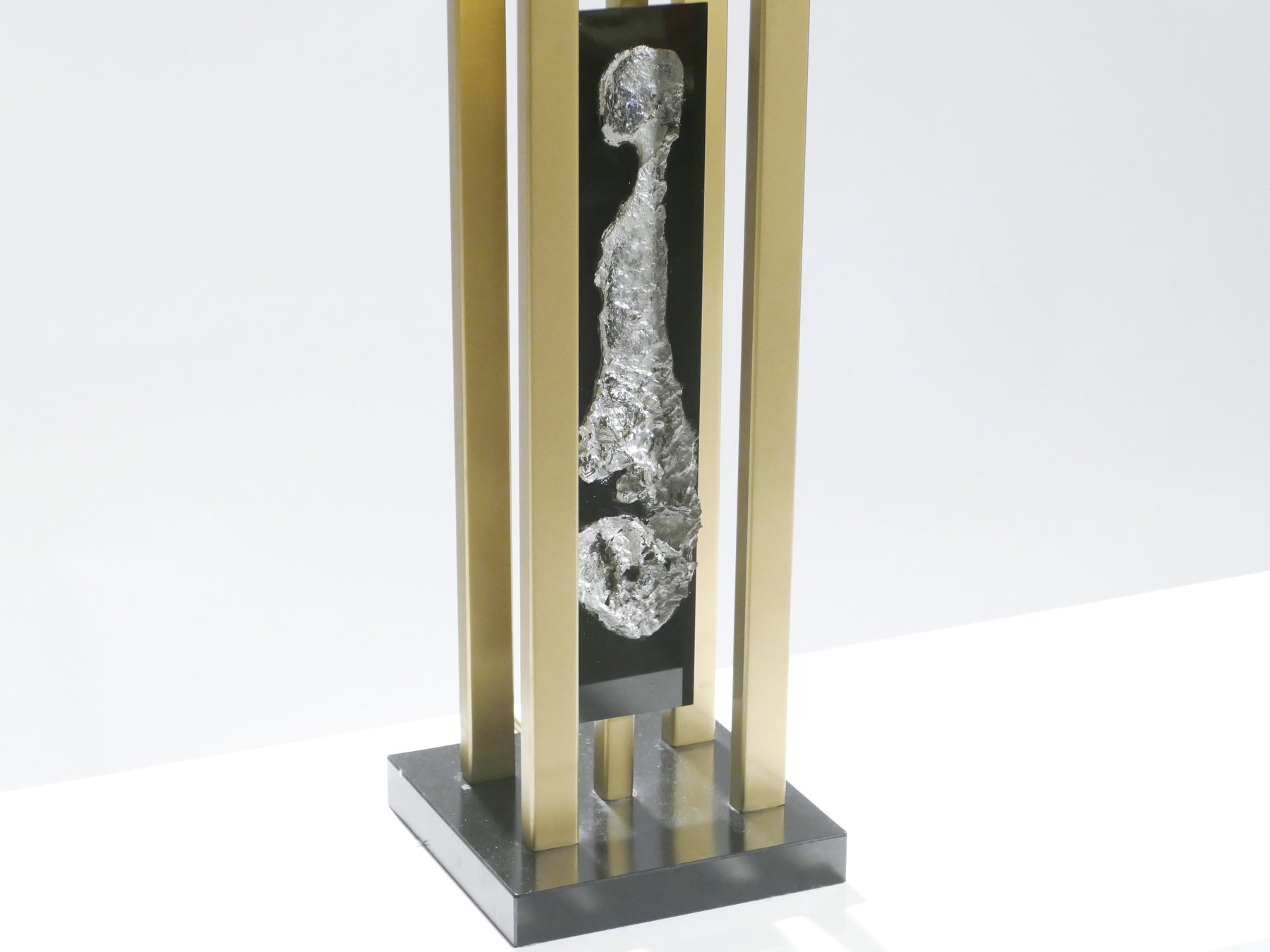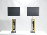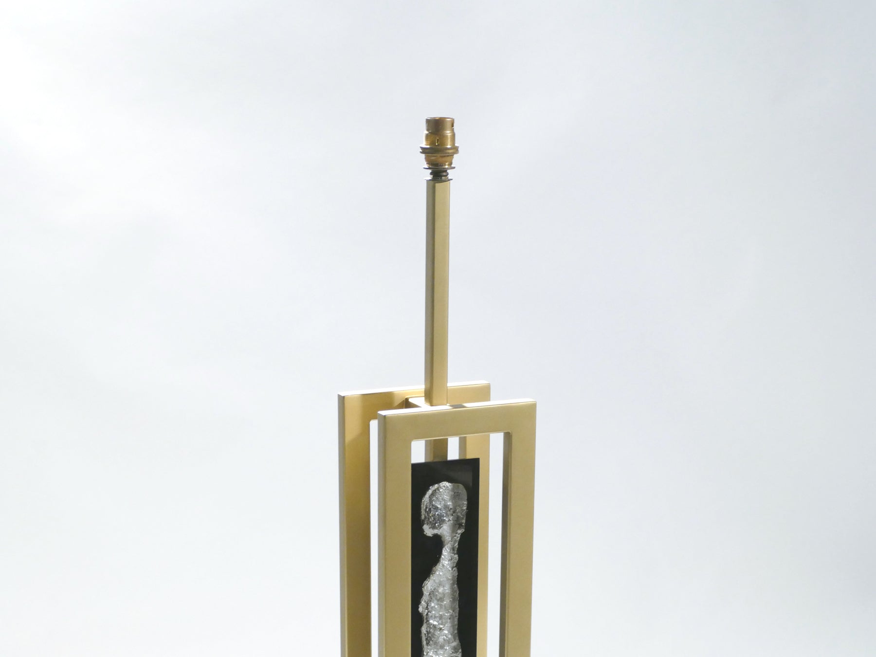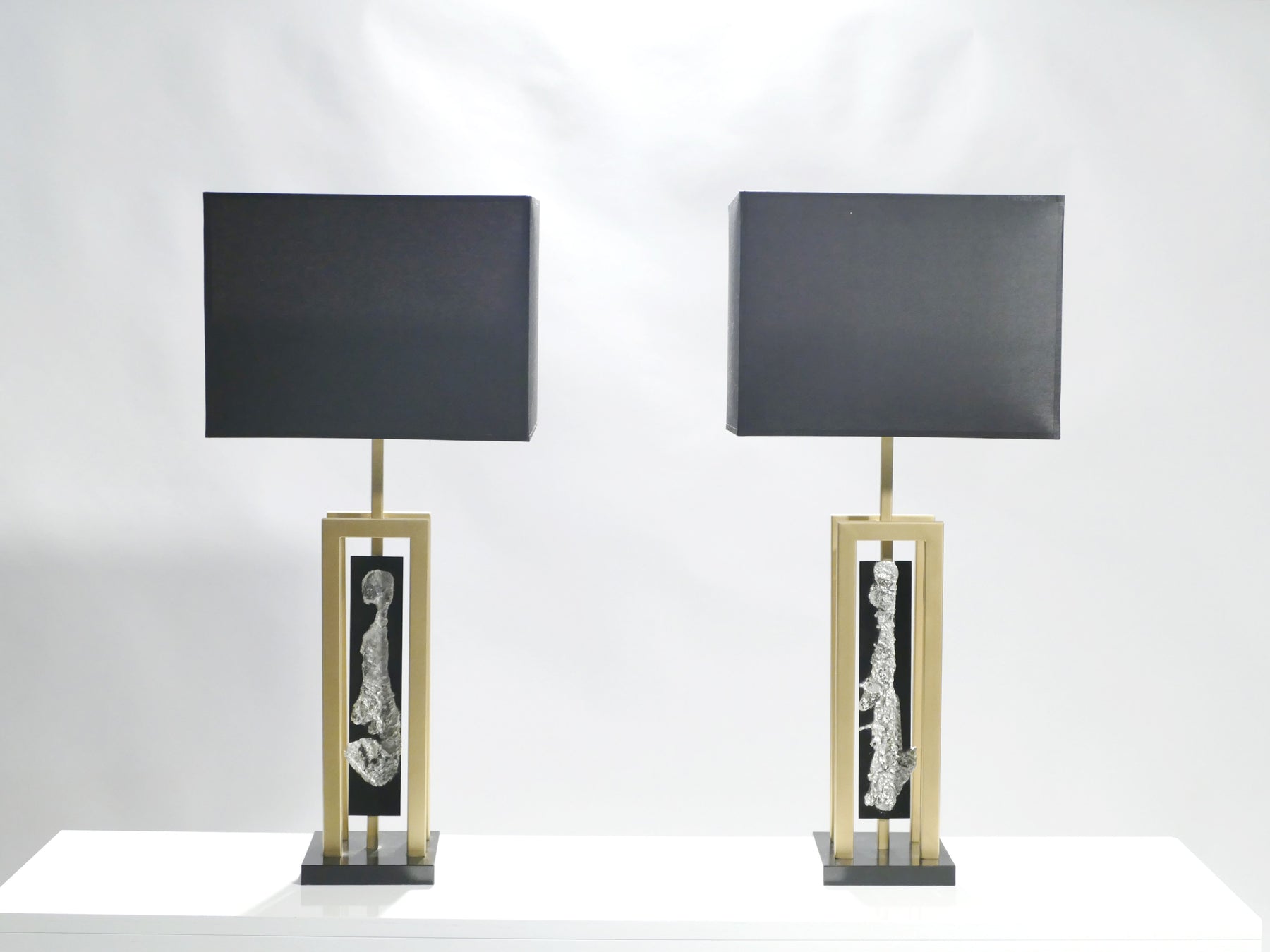 This pair of table lamps possesses the unique allure that is held by unconventional, decorative designs, most notably those by experimental designer Philippe Cheverny. Cool brass and sleek black lacquer form a combination that is immediately arresting and chic. Embedded within the base of the lamps are beautiful nickeled metal sculptures, whose rough, sparkling texture contrasts beautifully with its smooth surroundings. The result is an intriguing piece that is utterly unlike anything else. Each table lamp is large compared to others in this category, and the pair is a rare find.