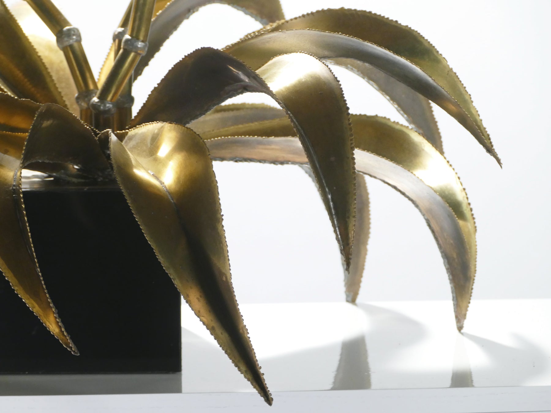 Glamour and opulence defined the 20th century Hollywood Regency style that is exemplified here in these luxe decorative lamps by Maison Jansen. Crafted brass makes up the body of the lamp, formed into intricate, sharp leaves and delicate flowers, which cradle lightbulbs to direct soft light around your space. A black lacquer base is made to resemble a robust flower pot. To encounter the two as a pair is a rare find.