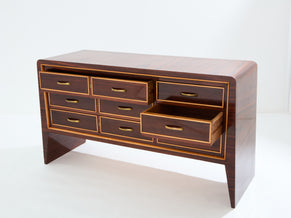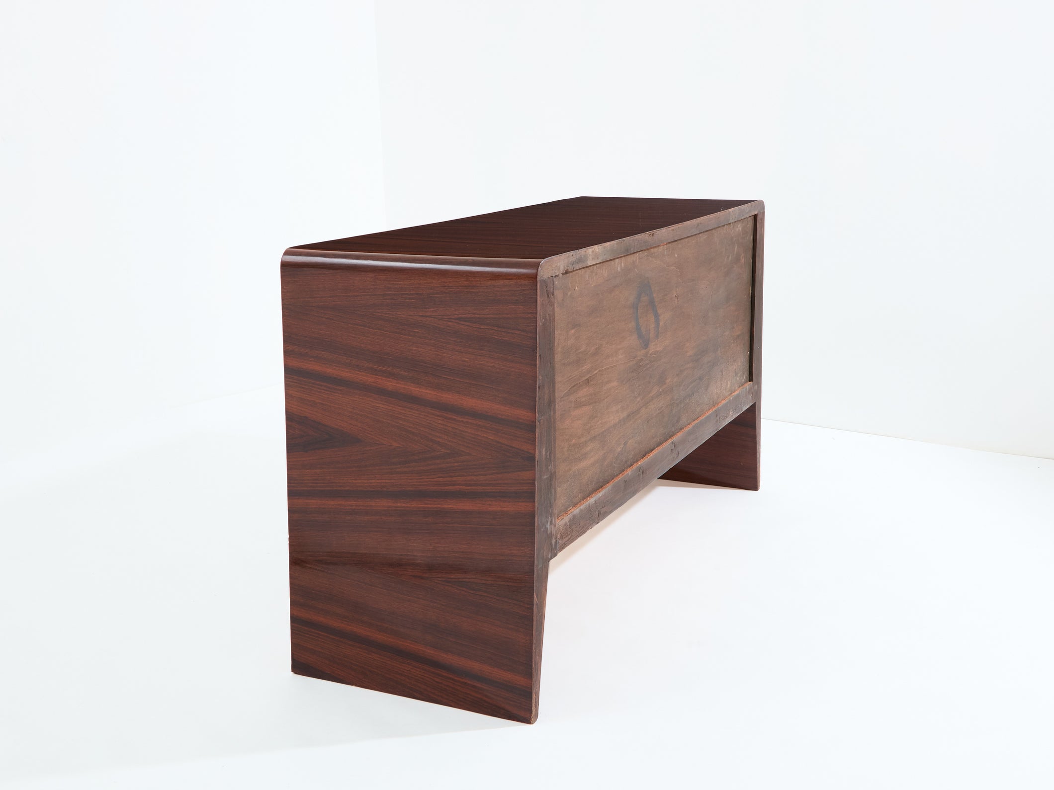 This beautiful chest of drawers designed by Paolo Buffa in Italy in the 1940s imparts a cosy, chic and glowing mood to a space. The warm rosewood remains looking beautiful and smooth eighty plus years later. Elegantly shaped, seating on two curved feet, this commode features three large drawers, and three smaller ones, with sycamore wood framing and brass handles. The piece feels delightfully modern for the Art Deco era, and charmingly vintage now. It is a very fine example of high-quality Italian design and craftsmanship by Paolo Buffa, with a beautiful construction and finish. It has been fully restored and revarnished, and is found in a great vintage condition.