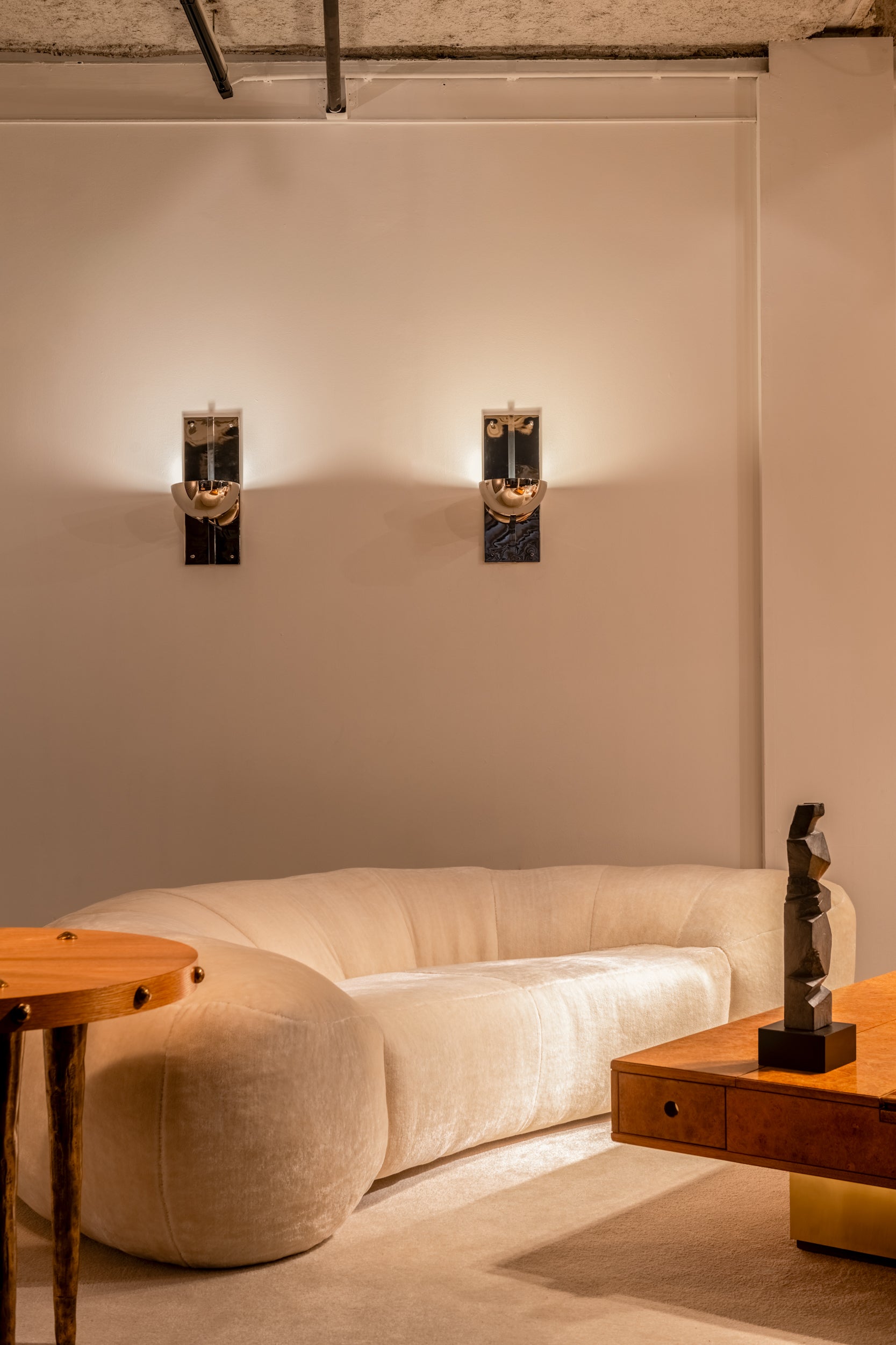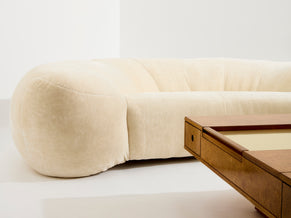 Beautiful sofa by Raphaël Raffel for Maison Honoré Paris produced in the mid-1970s. The sofa has been fully restored and newly upholstered with a beautiful light beige mohair velvet fabric from Italian editor Dedar - A Soft Place reference, for a comfy and elegant feel. As Dedar describes the fabric, soft, high-pile velvet that combines the textural nature of pure virgin wool with the luminosity of viscose, to create the shimmering appearance of fur. This sofa exudes a stylized 1970s allure, with a warm, cosy energy that will gently diffuse into your space, anchoring in mid-century modernity.