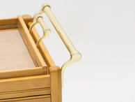 This rare and beautiful bar cart was made by Jacques Adnet for La Compagnie des Arts Français in the early 1940s. It carries with it the elegant mood of the art deco period, especially with its bold, modern use of beechwood and brass. It’s set on functioning wheels and has 2/3 surfaces with two retractable shelves on each side and a drawer. A rare find, fully restored, in a great vintage condition. Jacques Adnet imbued the piece with his signature geometric flair with simple, clean shapes.