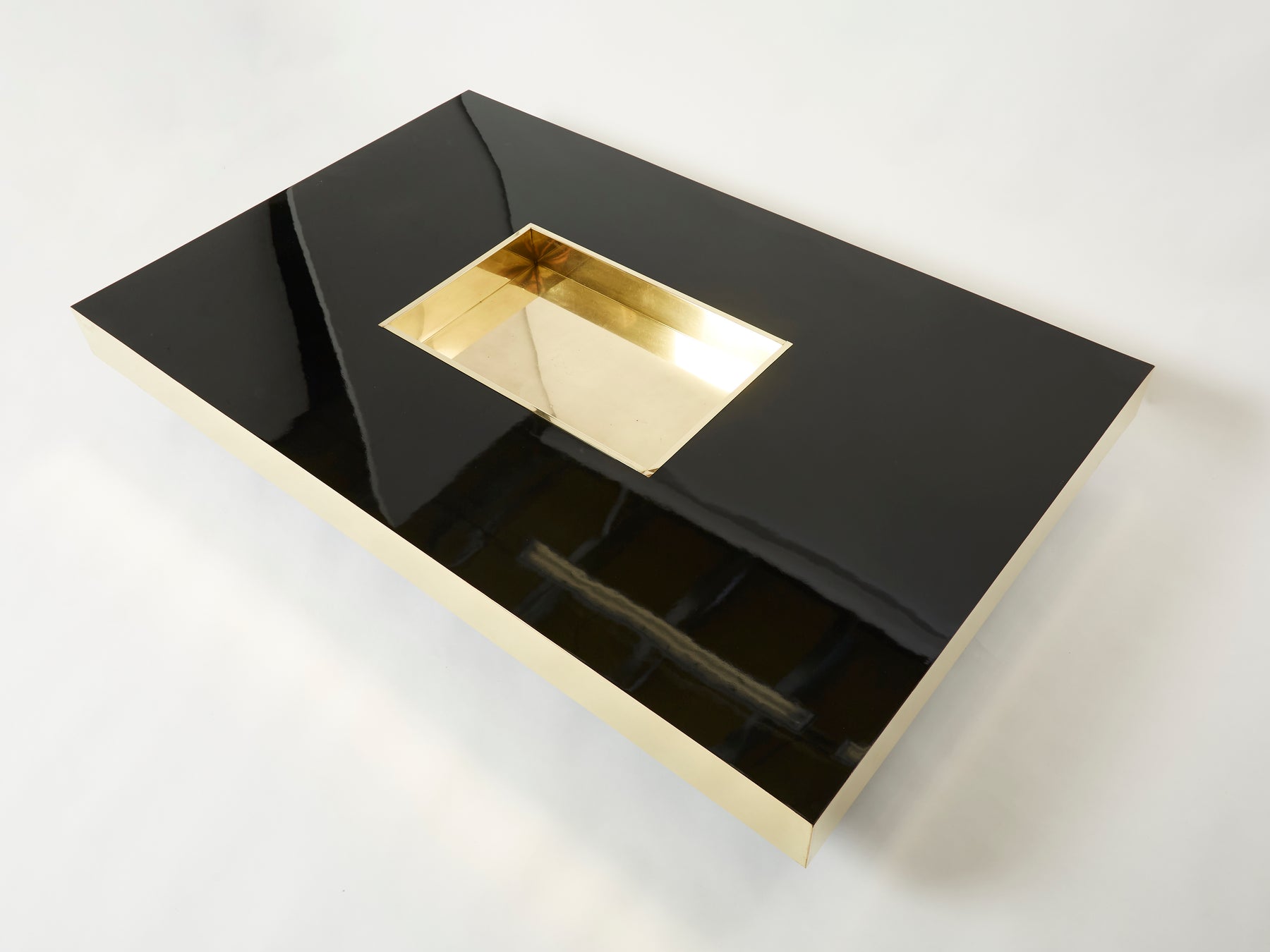 This stunning coffee table is guaranteed to be the focus of attention when you entertain guests, and will make a fascinating centerpiece for your living room. Following the glamorous mid-century look of other classic Willy Rizzo designs, the gleaming black lacquered table is inset with an eye-catching brass bar at its center plus brass sides, which creates a wonderfully radiant negative space in the surface of the piece. A very rare find in this extra large size, fully restored and in great vintage condition.