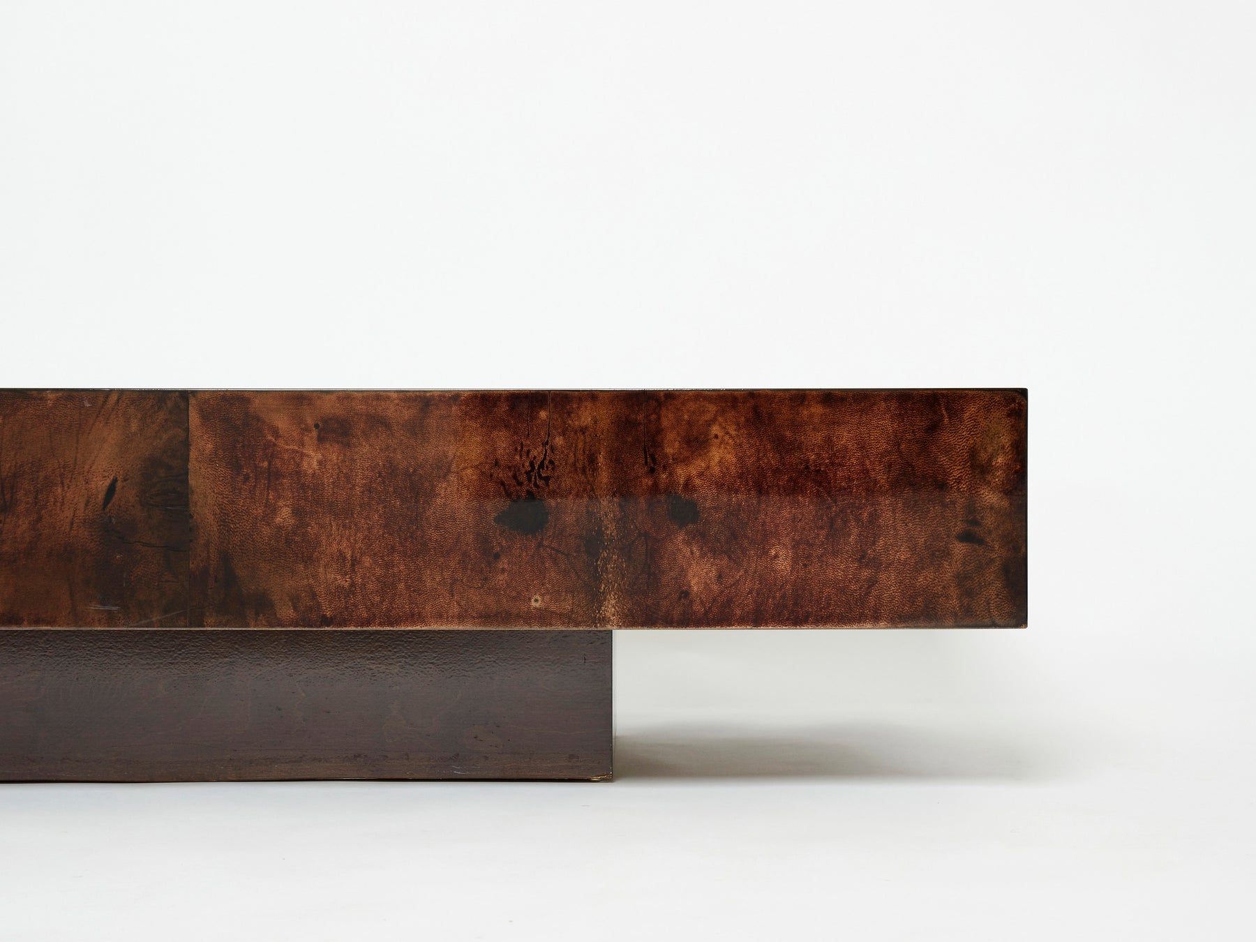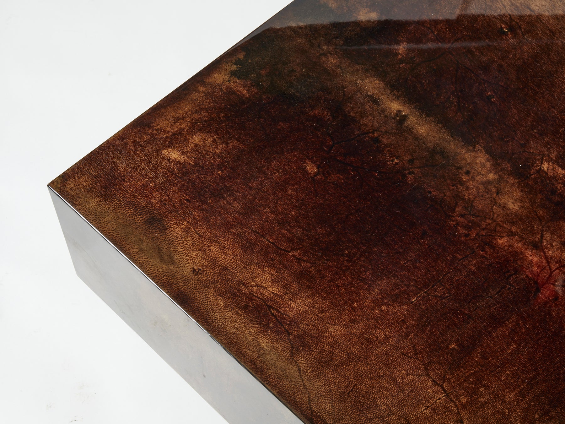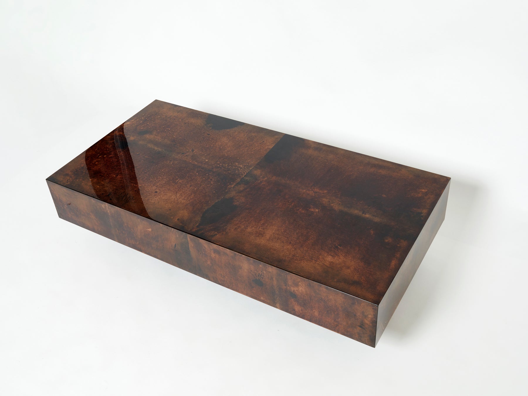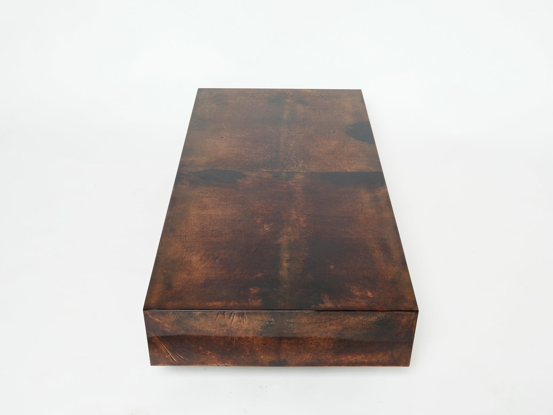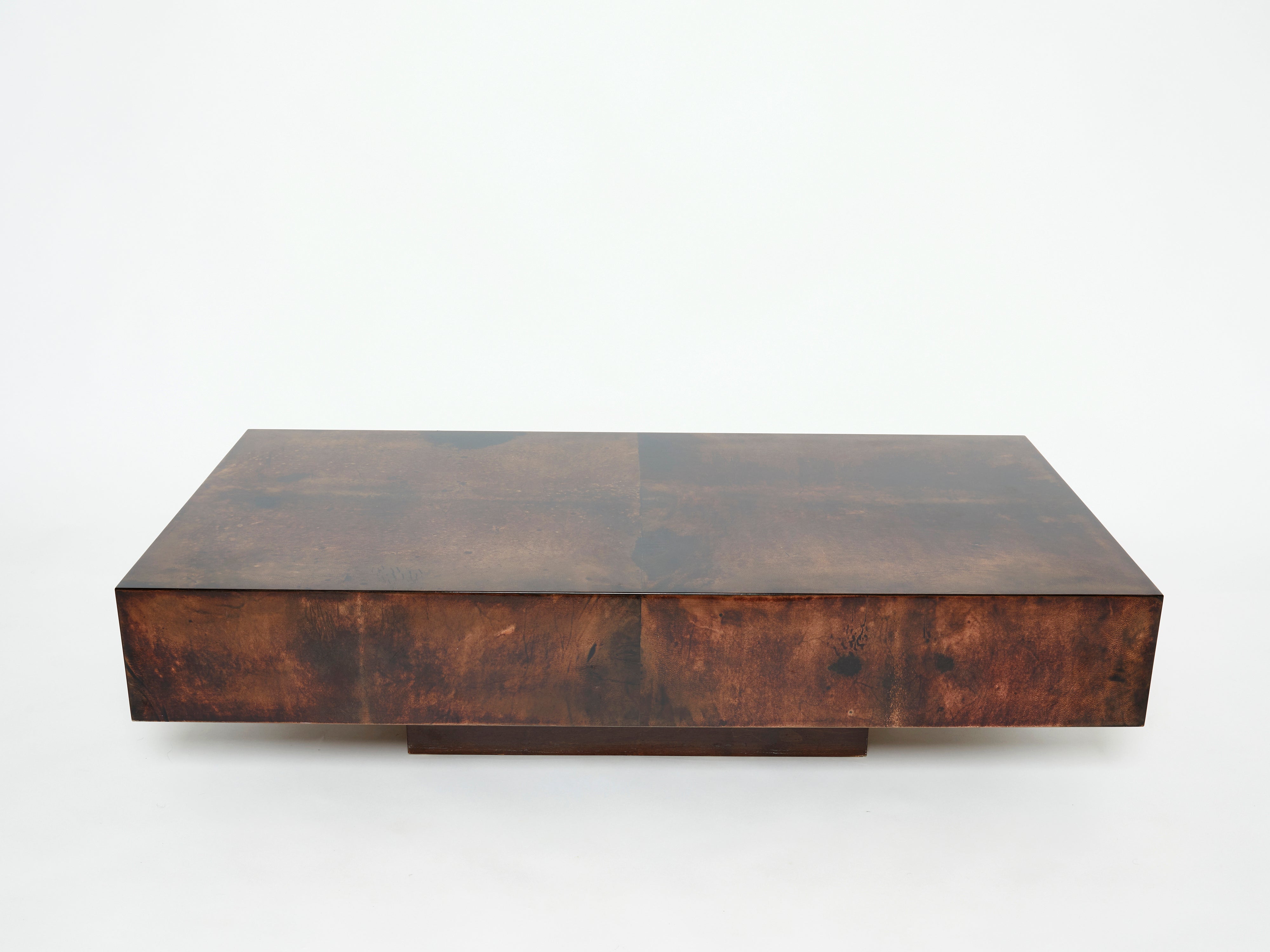 The varnished goatskin parchment, in rich shades of brown, makes this coffee table typical of designer Aldo Tura. This large coffee table would make a fascinating centerpiece for a living room. It’s been beautifully finished for a smooth, glossy texture that feels highly decorative. Despite its sharpness, the warm, dappled colors of the table allow it to seem cozy, rather than harsh. It’s found in a very good vintage condition.