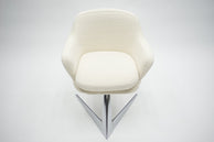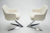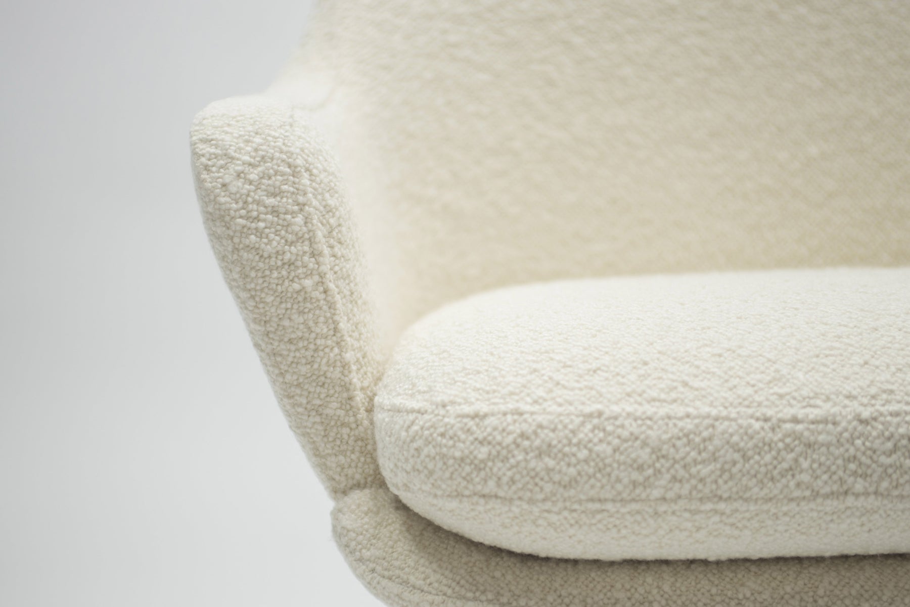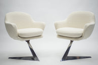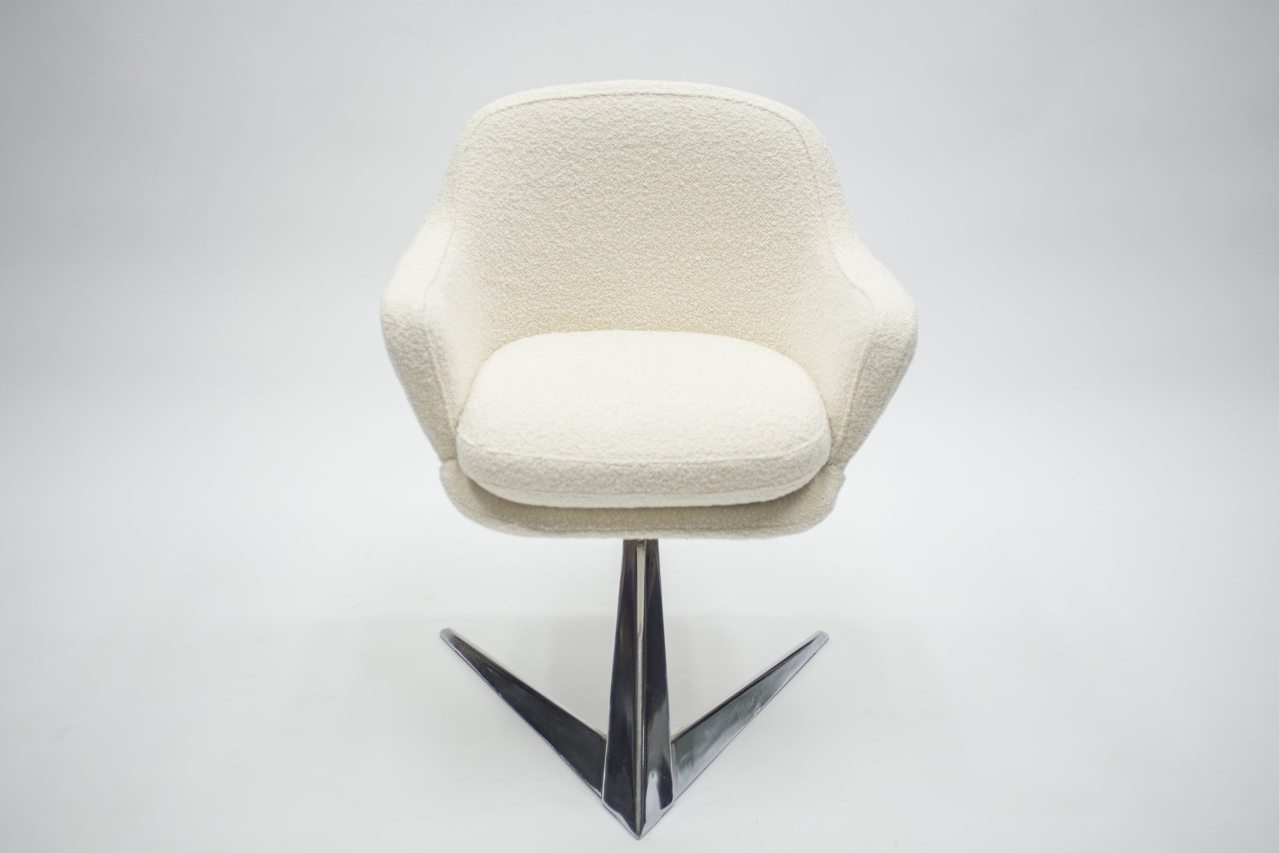 Today, the mid-century modern chairs have a decidedly vintage appeal, calling to mind film sets like the original Star Trek, or indeed, the powerful and glamourous world of airlines during the mid-century. The chromed steel base is original to the chairs, and they’ve been newly upholstered in white cream Italian bouclettes fabric from DEDAR for total functionality in contemporary homes or offices.