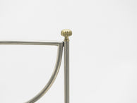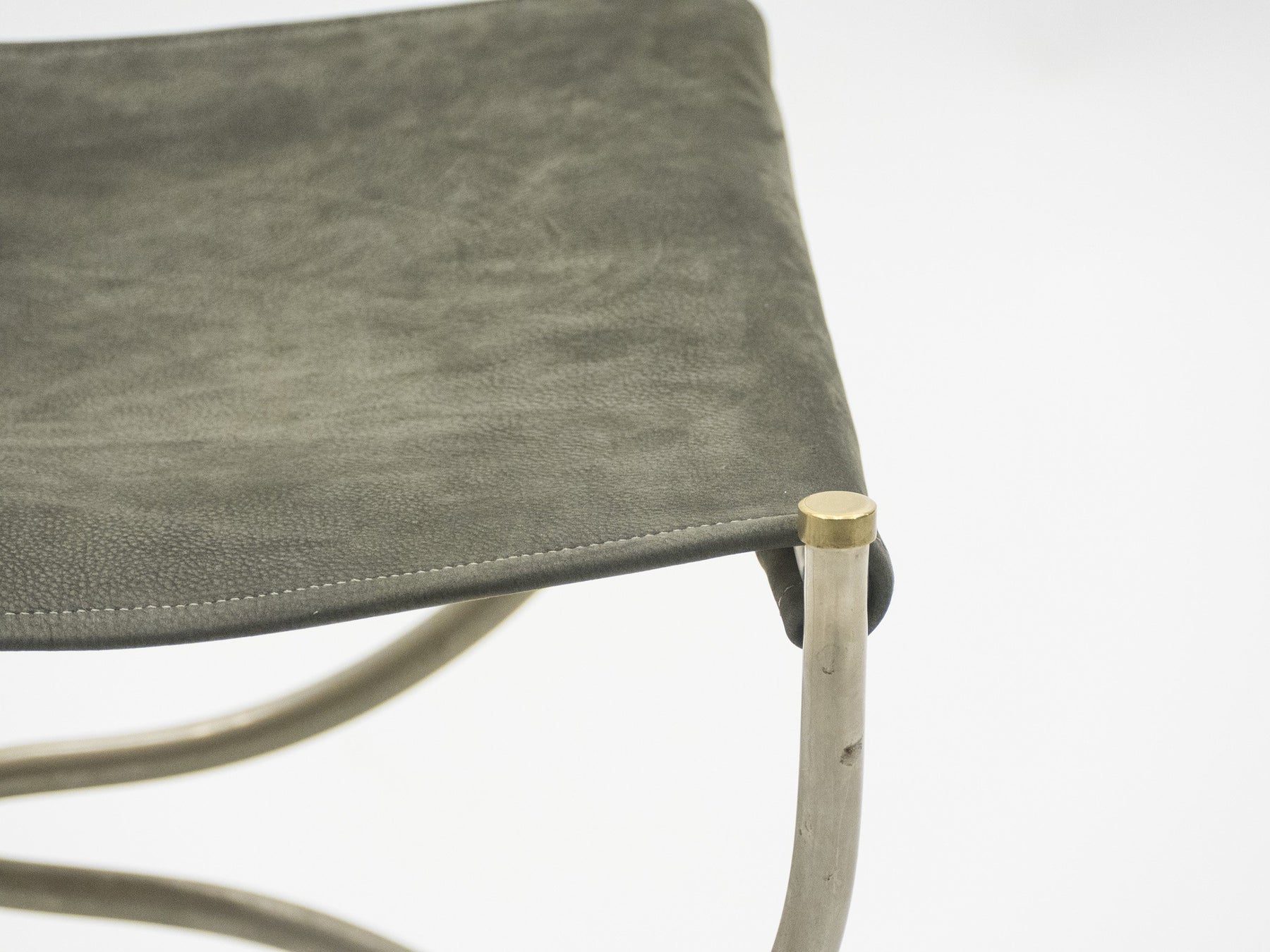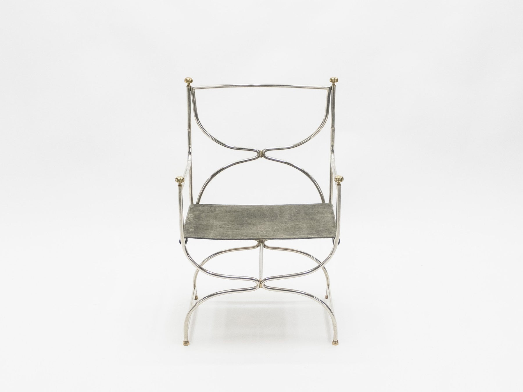 Beautiful set of 1960’s Curule Savonarola chairs made of heavy stainless steel metal with brass accents. This incredible set of eight chairs plus two chairs with armrests was created by French interior design firm Maison Jansen. The sparse original structure feels like a piece of modern art, and the new luxurious dark brown suede leather upholstery allows the chairs to feel comfortable and usable, not out of place in a contemporary interior. Every part of these decorative pieces is quality made—evident by the heaviness of the chairs—resulting in a timeless mid-century set.