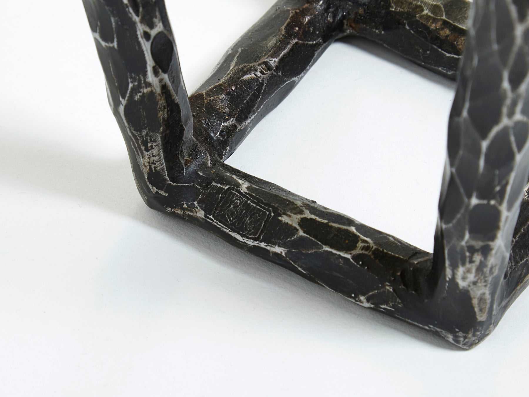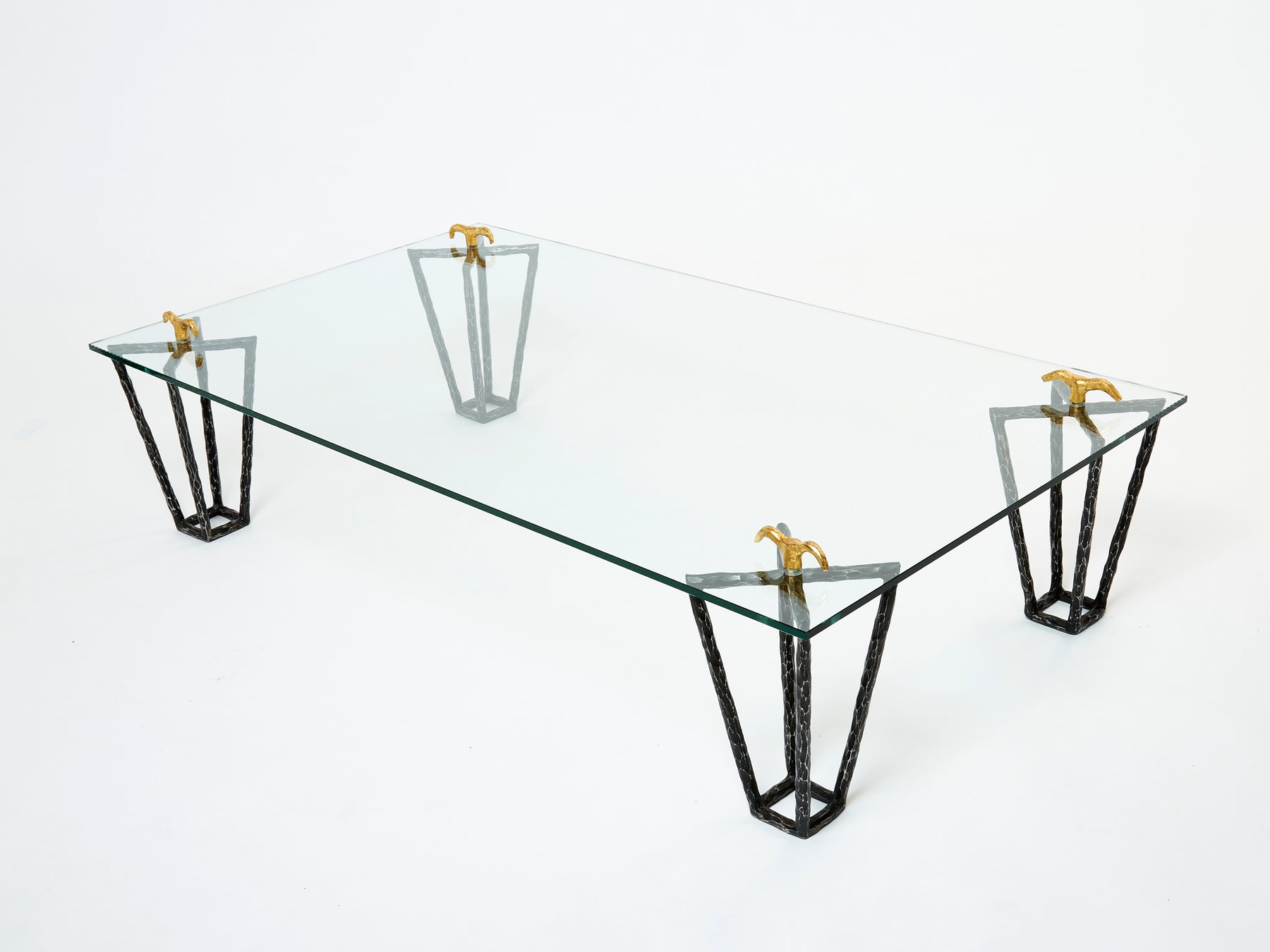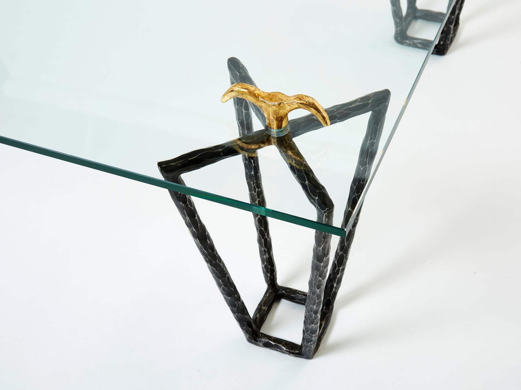 Rare and unique signed coffee table by Elizabeth Garouste & Mattia Bonetti designed in 1995 by the iconic duo, and edited by En attendant les Barbares. Made in wrought iron hand beaten and waxed, with gold leaf finished, this is clearly a statement piece, especially for those that believe passionate expressions of creativity go hand-in-hand with interior design. Elizabeth Garouste & Mattia Bonetti were a team of designers, based in Paris, who brought extraordinarily imaginative designs into the mainstream. Their work, like this table, reflects their idea that furniture design should have no rules in terms of form and materials. The piece is emblematic of the design duo’s commitment to avant-garde, romantic style, and is highly decorative. The table is signed and stamped, and, extremely rare, and in great condition. Glass top height is 14.5 inches.