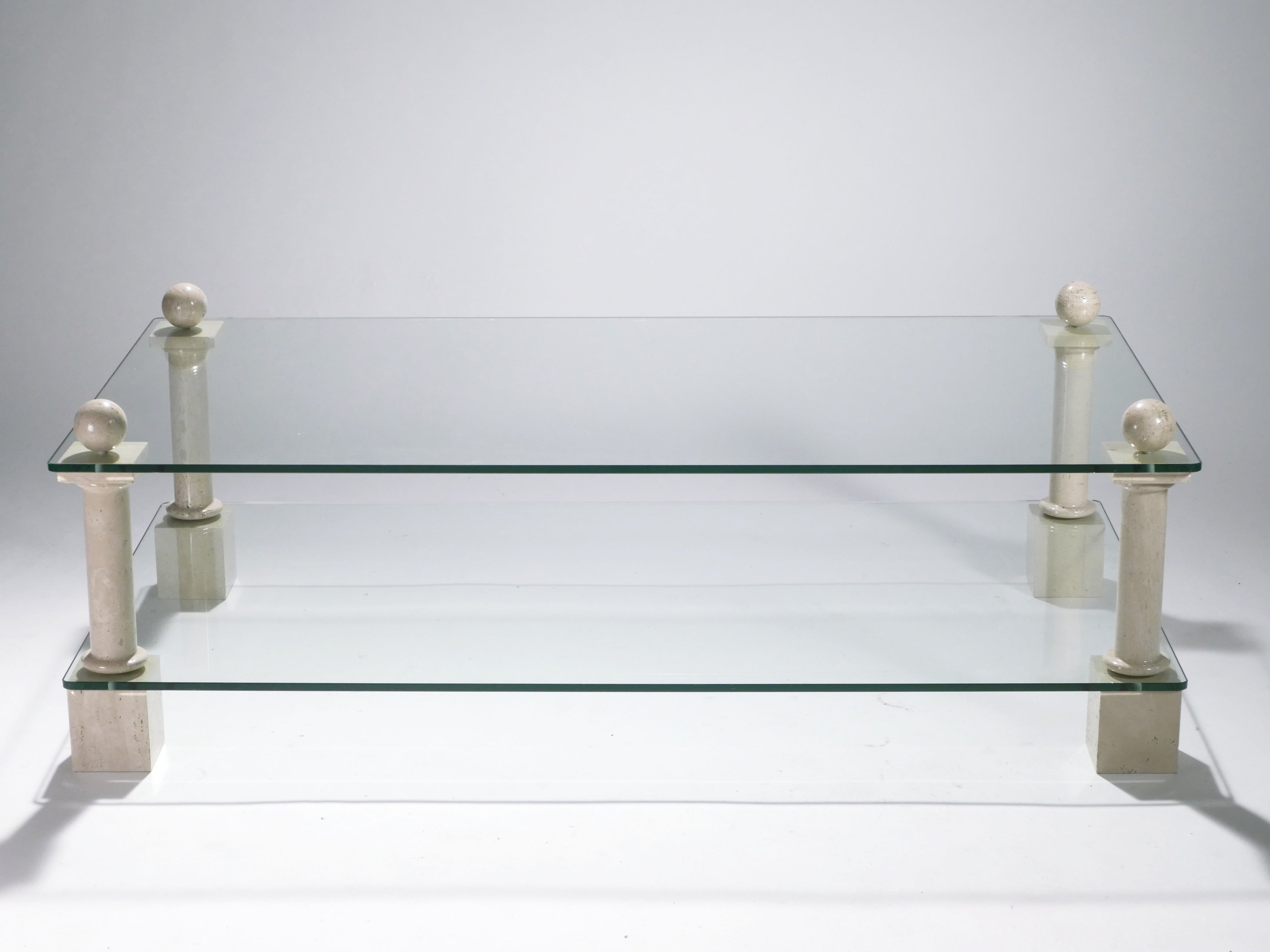 Crafted by the esteemed Maison Philippe Barbier, this rare coffee table mixes materials in the most sophisticated way. Tiered, thick glass slabs are supported by elegant travertine feet. Decorators might choose to place this 70’s era table in a modern, monochromatic space.