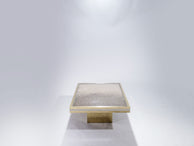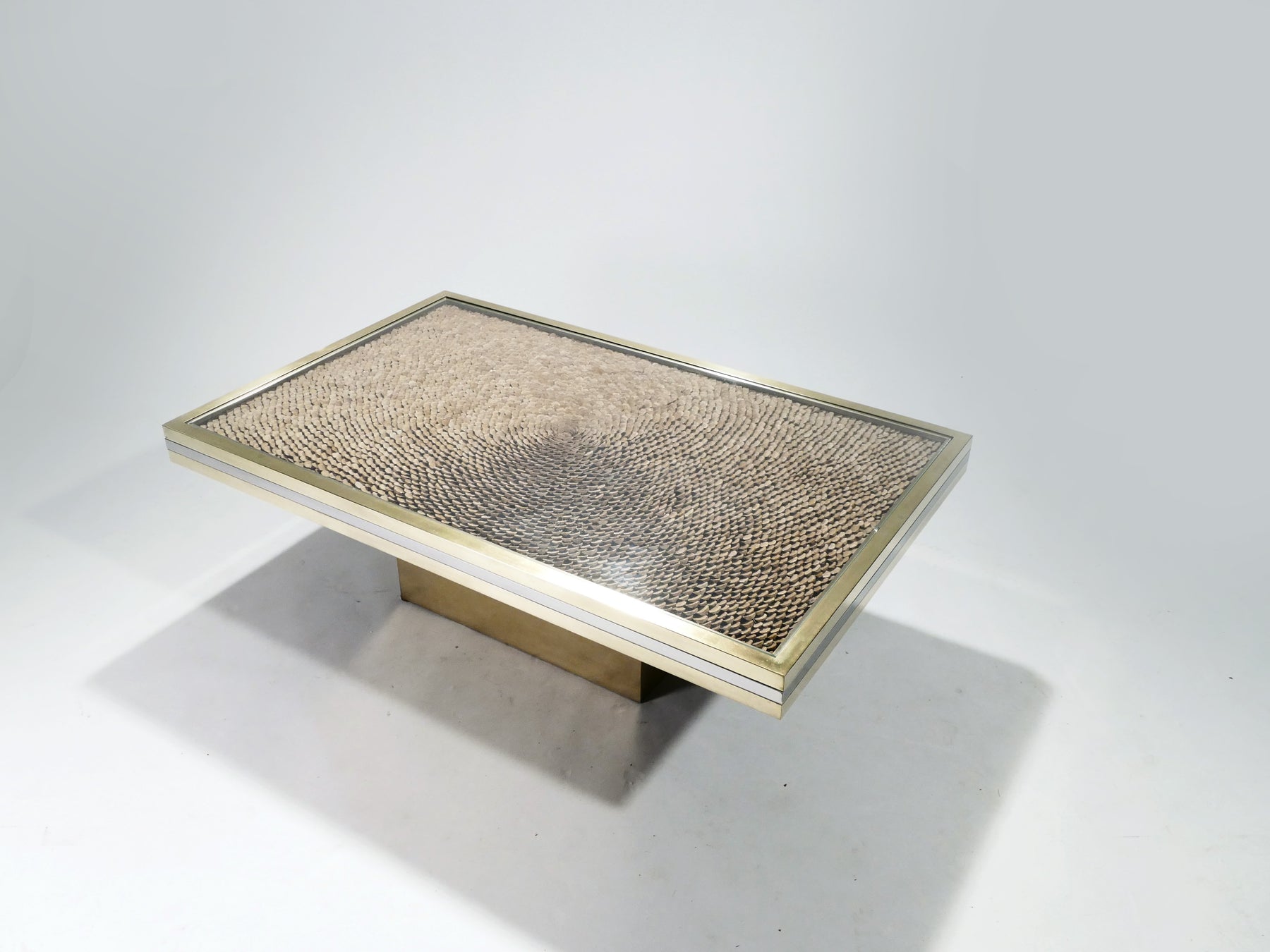 A swirling pinecone design underneath the transparent glass top of this coffee table is immediately eye-catching. Designed by Italian mid-century modern “glam” designer, Romeo Rega, the piece is not only unique but quite rare. Structurally, the table is typically mid-century modern sleek, with clean lines and a broad rectangular surface. Smooth and shiny brass and chrome complement each other as they wrap around the table top, with brass forming the chunky base. However, it’s the intricate pinecone design that really makes this piece special, giving it a naturalistic, rich look. Placed in a contemporary or vintage inspired living room, the coffee table will add an understated intrigue, one-of-a-kind feel, and mid-century modern flair to the space.