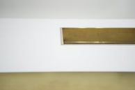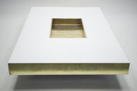 This stunning coffee table is guaranteed to be the focus of attention when you entertain guests, and will make a fascinating centerpiece for your living room. Following the glamorous mid-century look of other classic Willy Rizzo designs, the gleaming white lacquered table in inset with an eye-catching brass bar at its center plus brass sides, which creates a wonderfully radiant negative space in the surface of the piece. This is a truly unique piece of furniture, an ideal match for your unique home. A very rare find in this extra large size, and in mint condition.