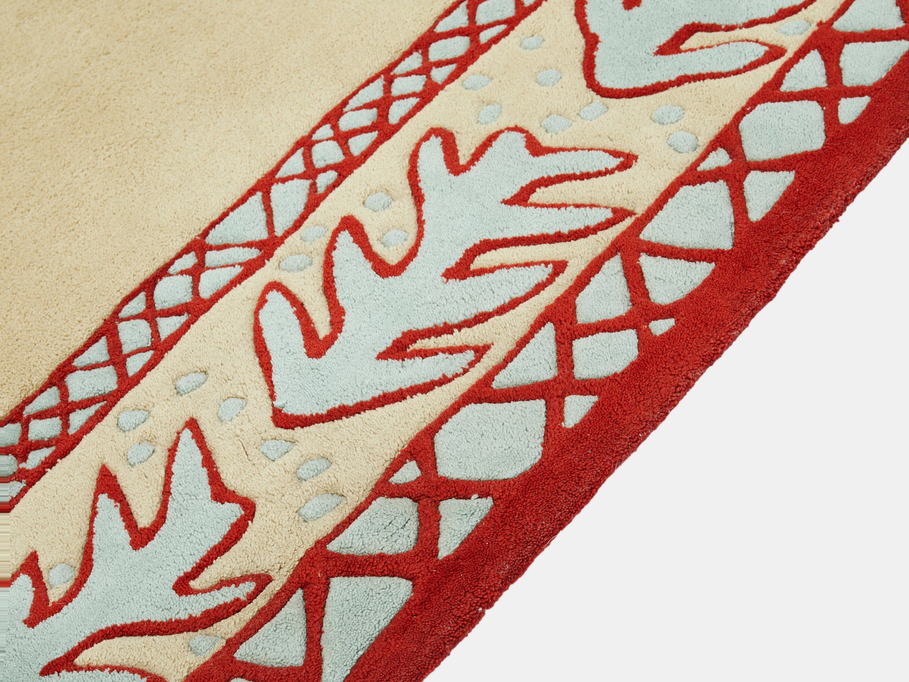 Rêverie carpet designed and created by Elizabeth Garouste and Mattia Bonetti for Sam Laik in 1993. Made of thick tufted wool, his beautiful piece features a very poetic red and light green pattern, and is signed BG and the lower right. This rug has been professionally cleaned, with very few marks from previous use, coffee table feet marks can be seen in pictures.