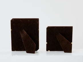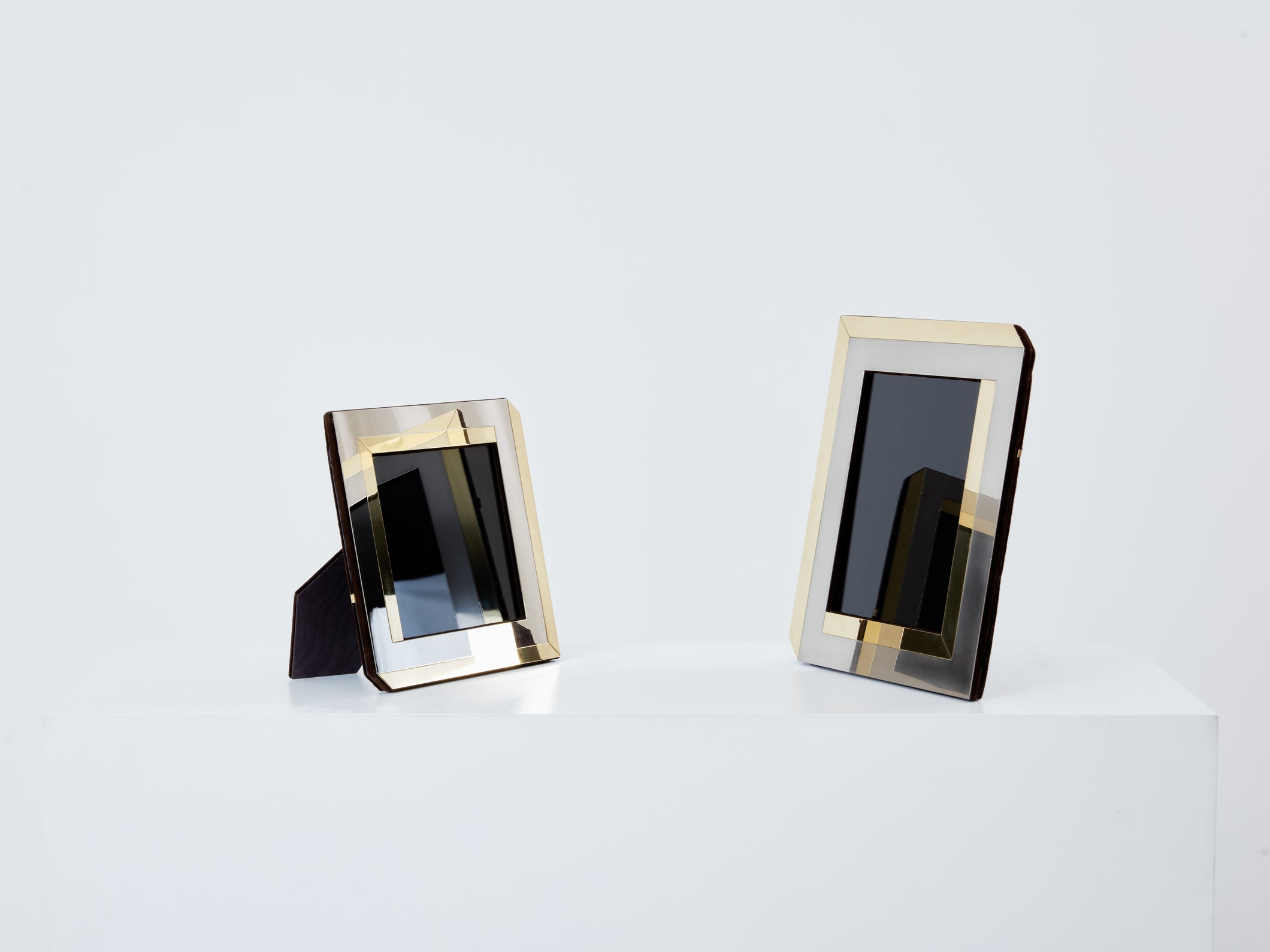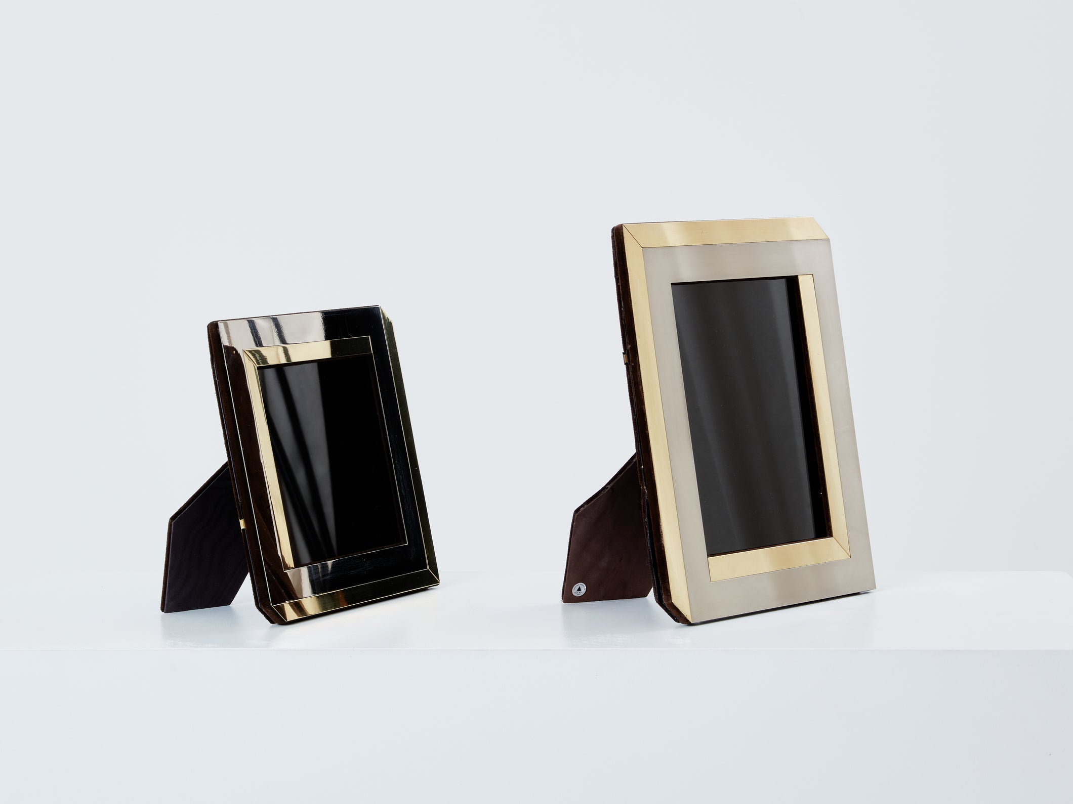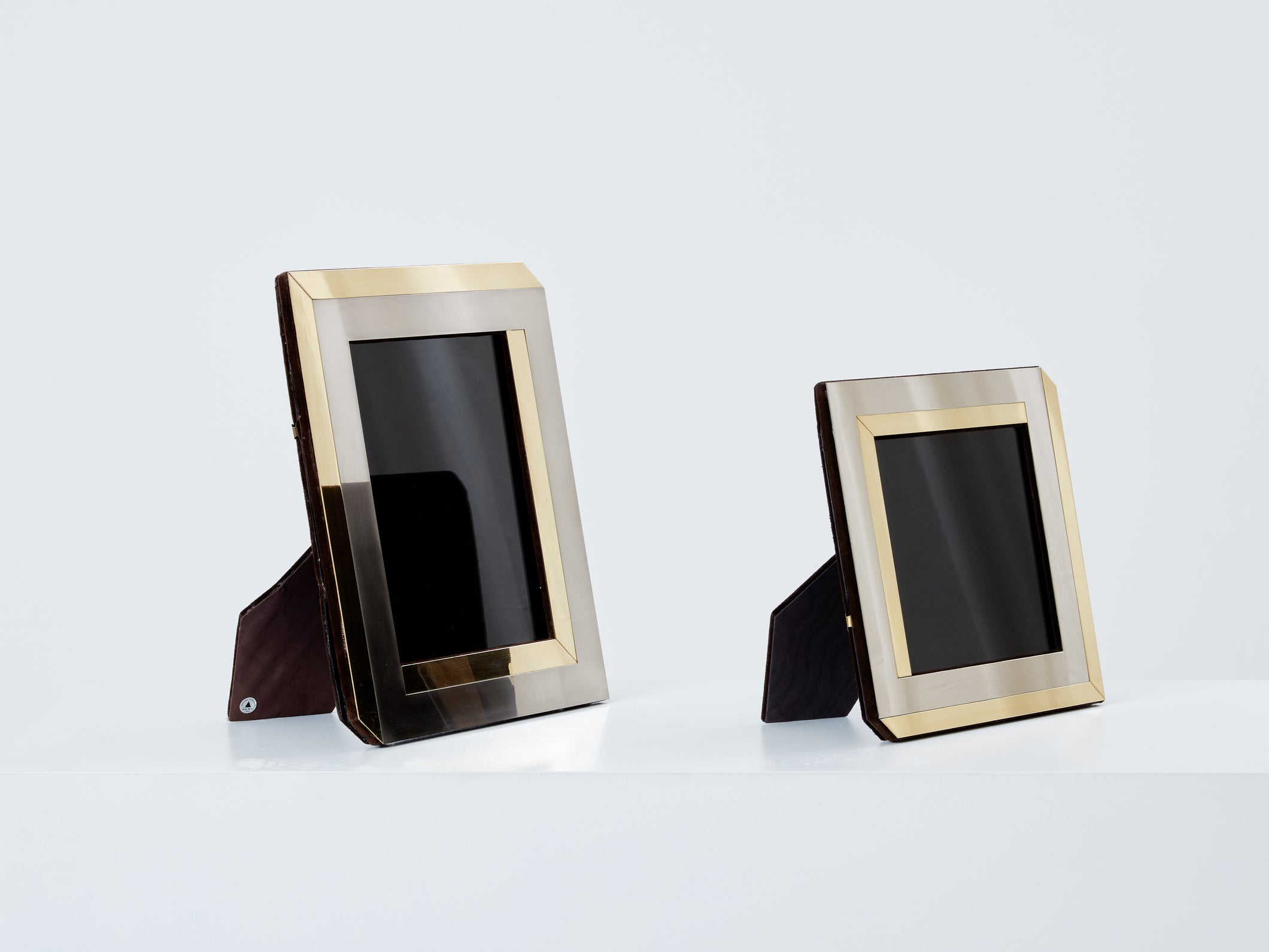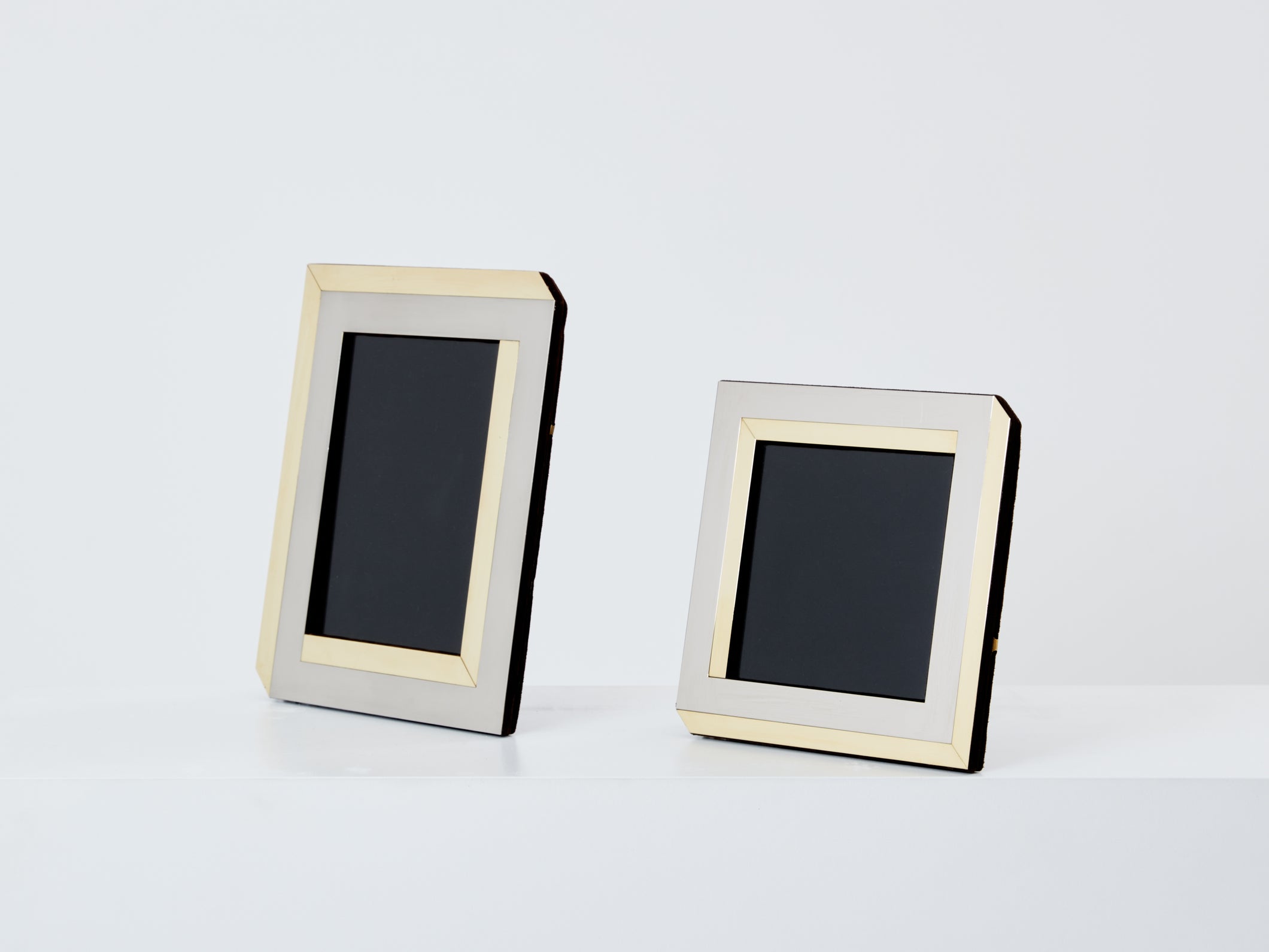 Beautiful set of two Mid-Century picture frames made in Italy in the late 1970s by Romeo Rega. These brass and chrome frames are very graphic and decorative, and covered with brown velvet on the back. The mix of brass and chrome is really nice, and typical of the lavish 1970s Romeo Rega style. These are collectible pieces, perfect as a gift, with a very nice decorative presence, fully cleaned, and found in a very good vintage condition. The large one measures are Width 10.65 inches x Height 13 inches, and the smaller one Width 9.85 inches x Height 9.85 inches.