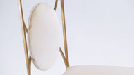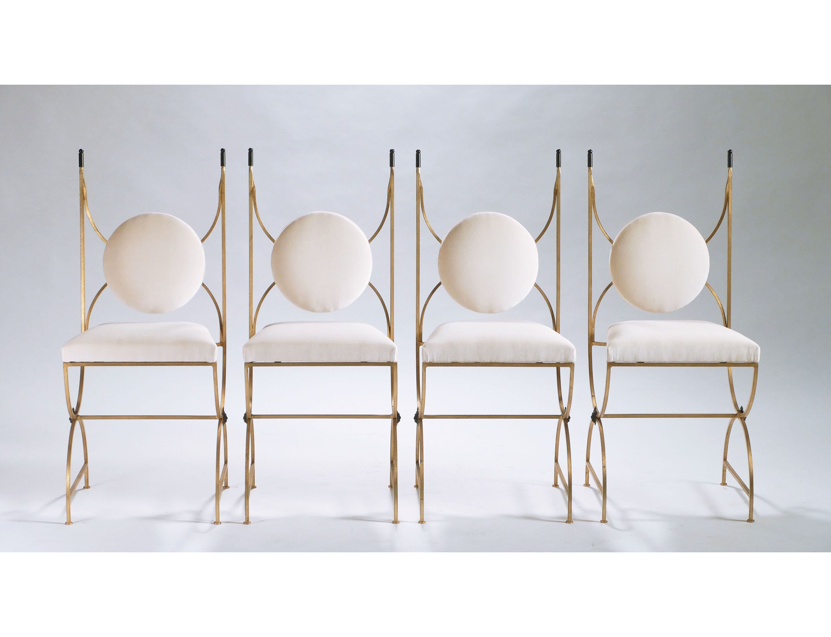 Grace your home with the true elegance of these four dining chairs. Wrought iron has been gilded with gold leaf for a gentle warm golden patina throughout the entire structure. These chairs are newly upholstered in a quality creme velvet that adds a glam twist, which makes a gracious complement to the French neoclassical/mid-century modern design. Designed by Parisian decorator and designers Roger and Robert Thibier, the pieces are a lovely timeless aesthetic. Their size makes it ideal as a decorative and functional piece in an kitchen or bedrooms.