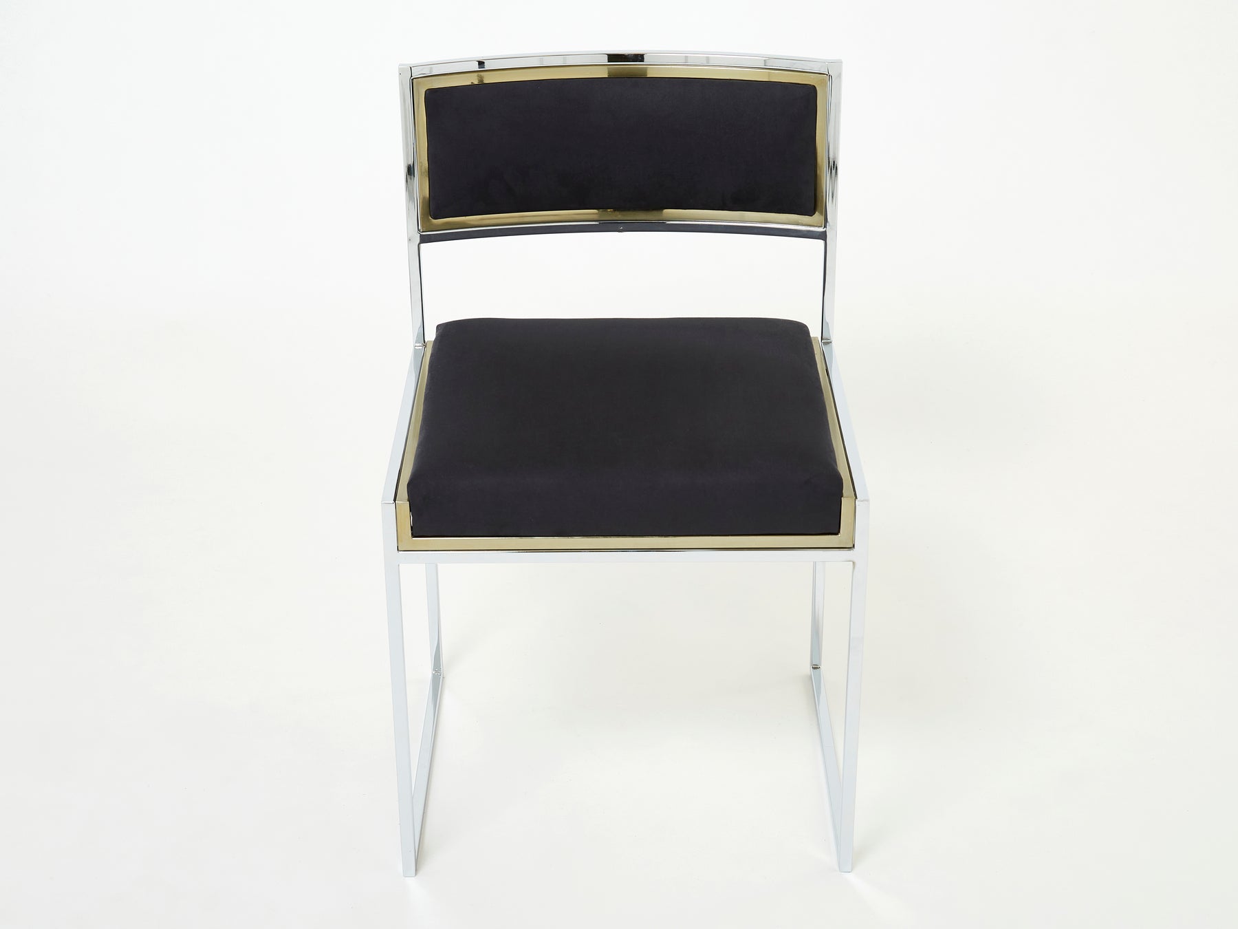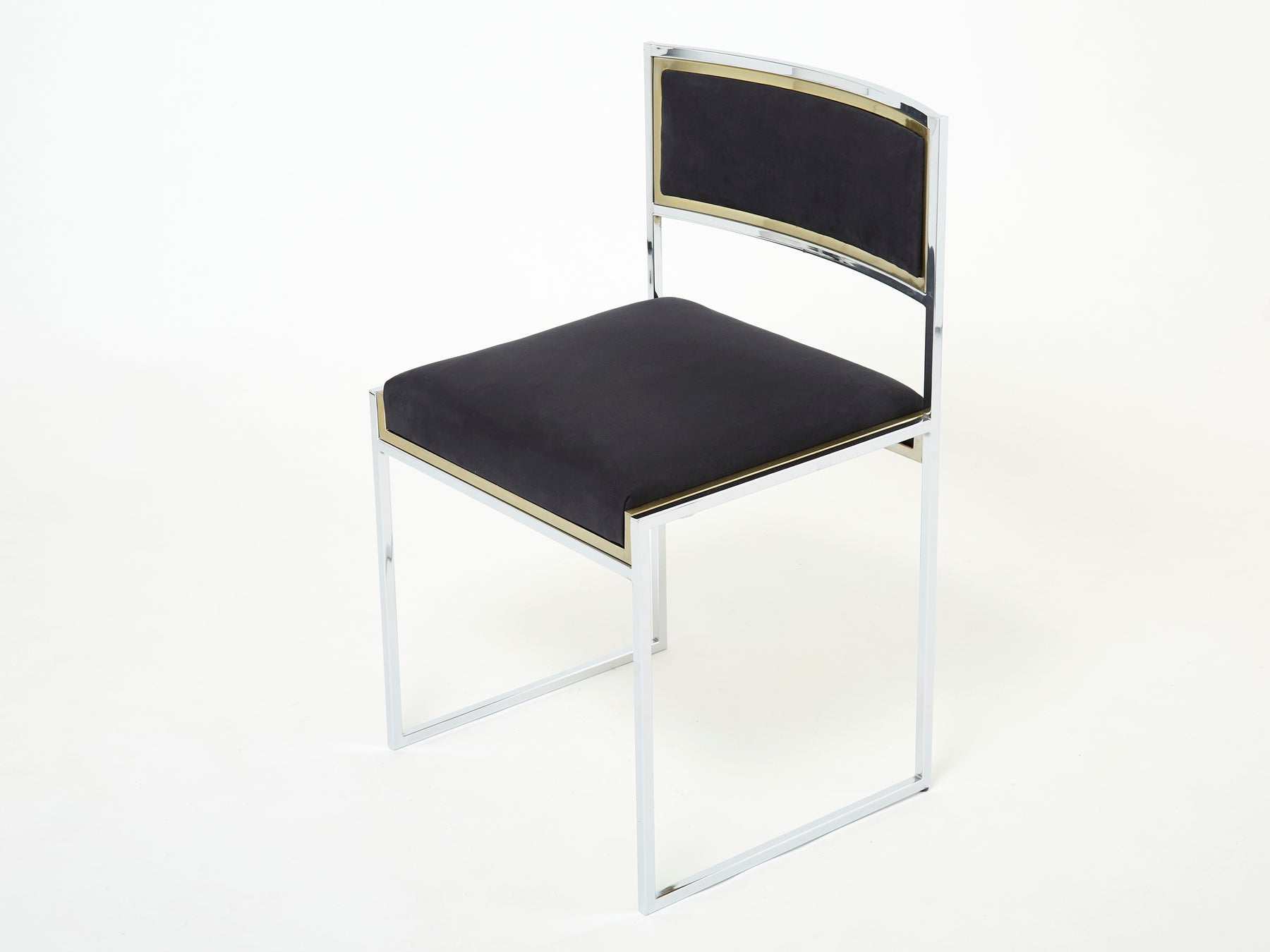This stunning set of four chairs is guaranteed to be the focus of attention when you entertain guests in your living room. Following the glamorous Italian Hollywood Regency look of other classic Willy Rizzo designs, these chairs model feature a chrome-plated steel frame finished with brass edges, resulting in a beautiful and rich contrast. They have been fully restored and reupholstered with a black alcantara suede fabric from Lelièvre, and are in a great vintage condition.