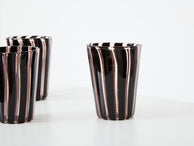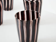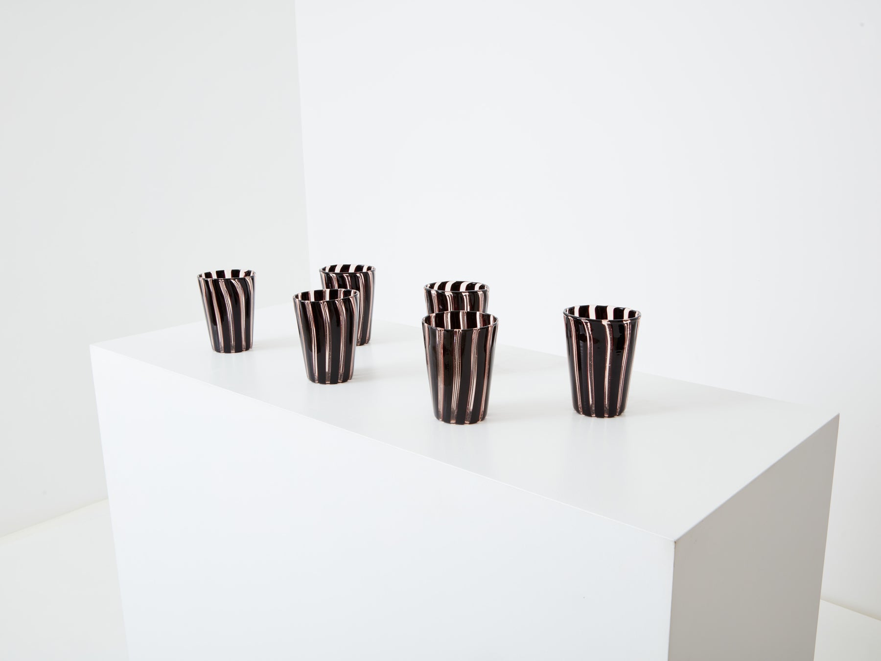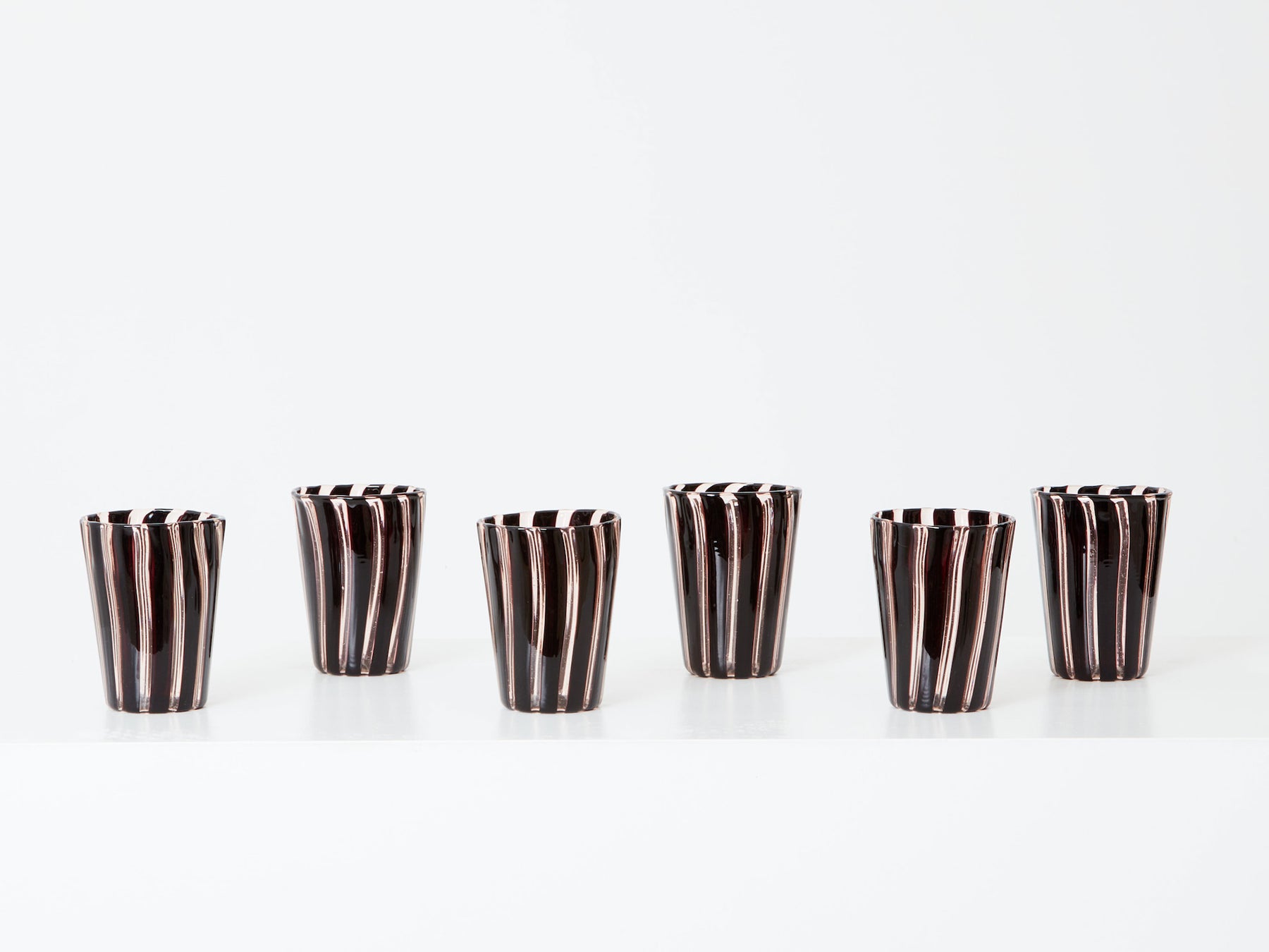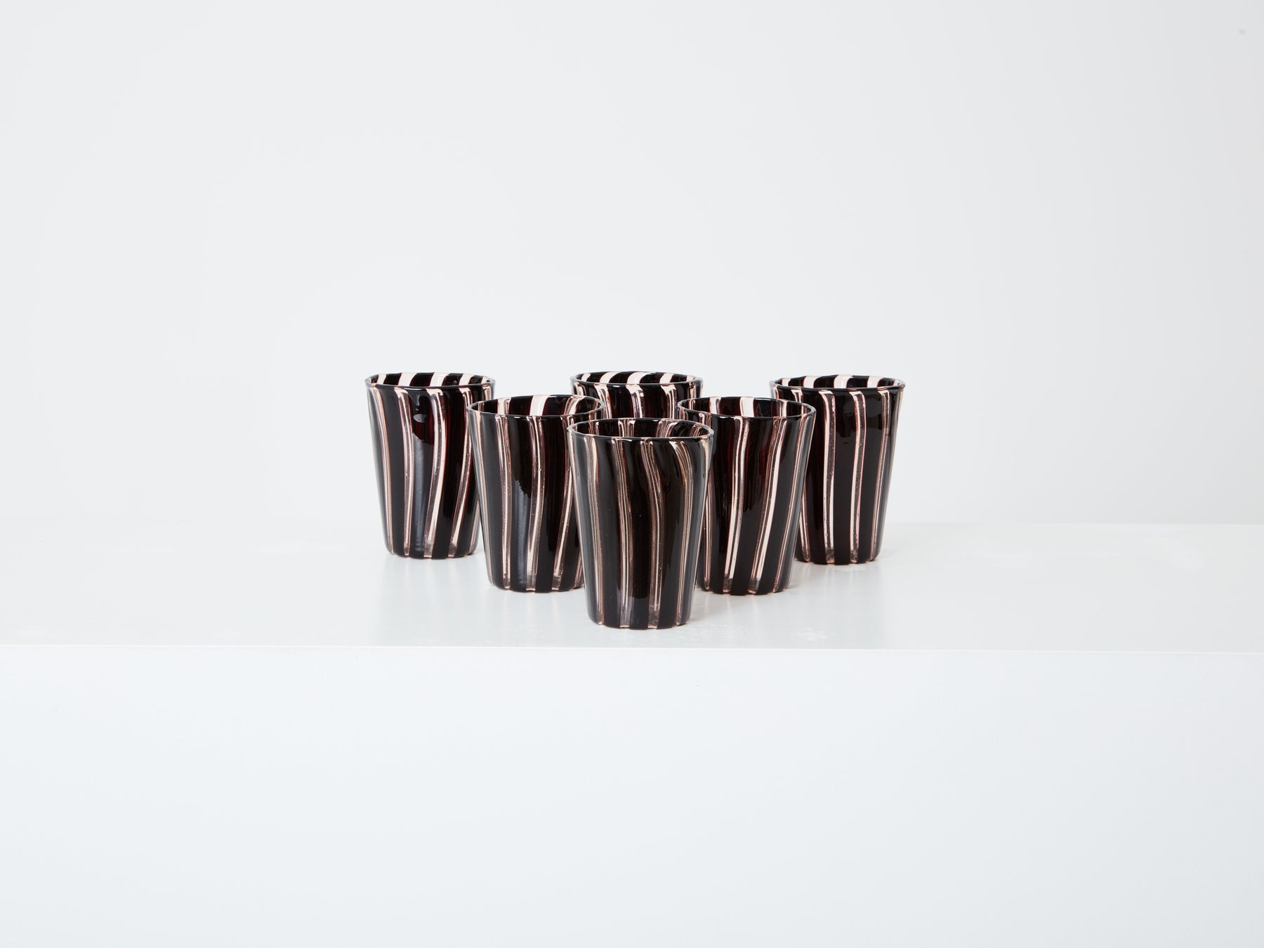 This is a beautiful set of six black and white Murano glass tumblers made in Italy in the 1980s. These are inspired by Gio Ponti and Paolo Venini tumblers “Canne” models from the Morandiana series. This beautiful set of murano pieces has eye-catching pattern, with a wonderful decorative presence. They are found in a very good vintage condition, no chip.