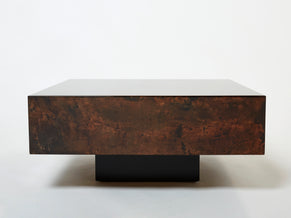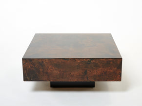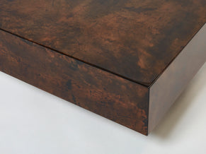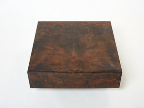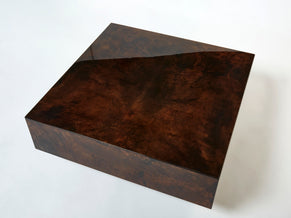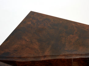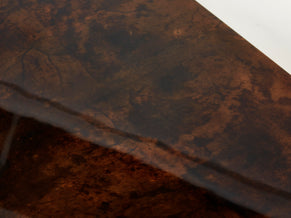 The varnished goatskin parchment, in rich shades of brown, makes this square coffee table typical of designer Aldo Tura. This small coffee table or end table would make a perfect warm and chic piece for any living room. It’s been beautifully finished for a smooth, glossy texture that feels highly decorative. Despite its sharpness, the warm, dappled colours of the table allow it to seem cosy, rather than harsh. It’s found in a great vintage condition.