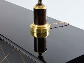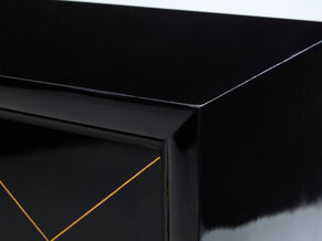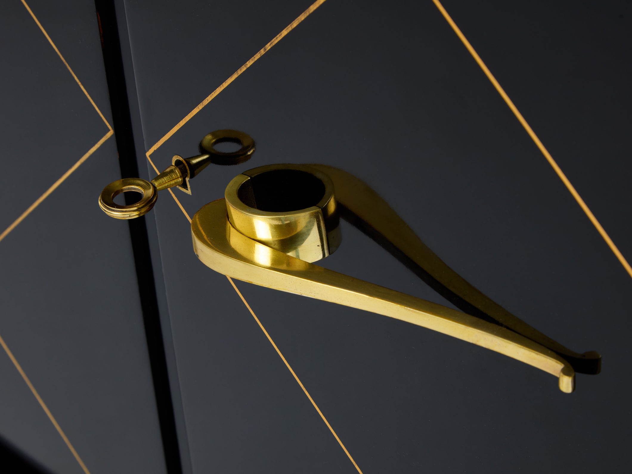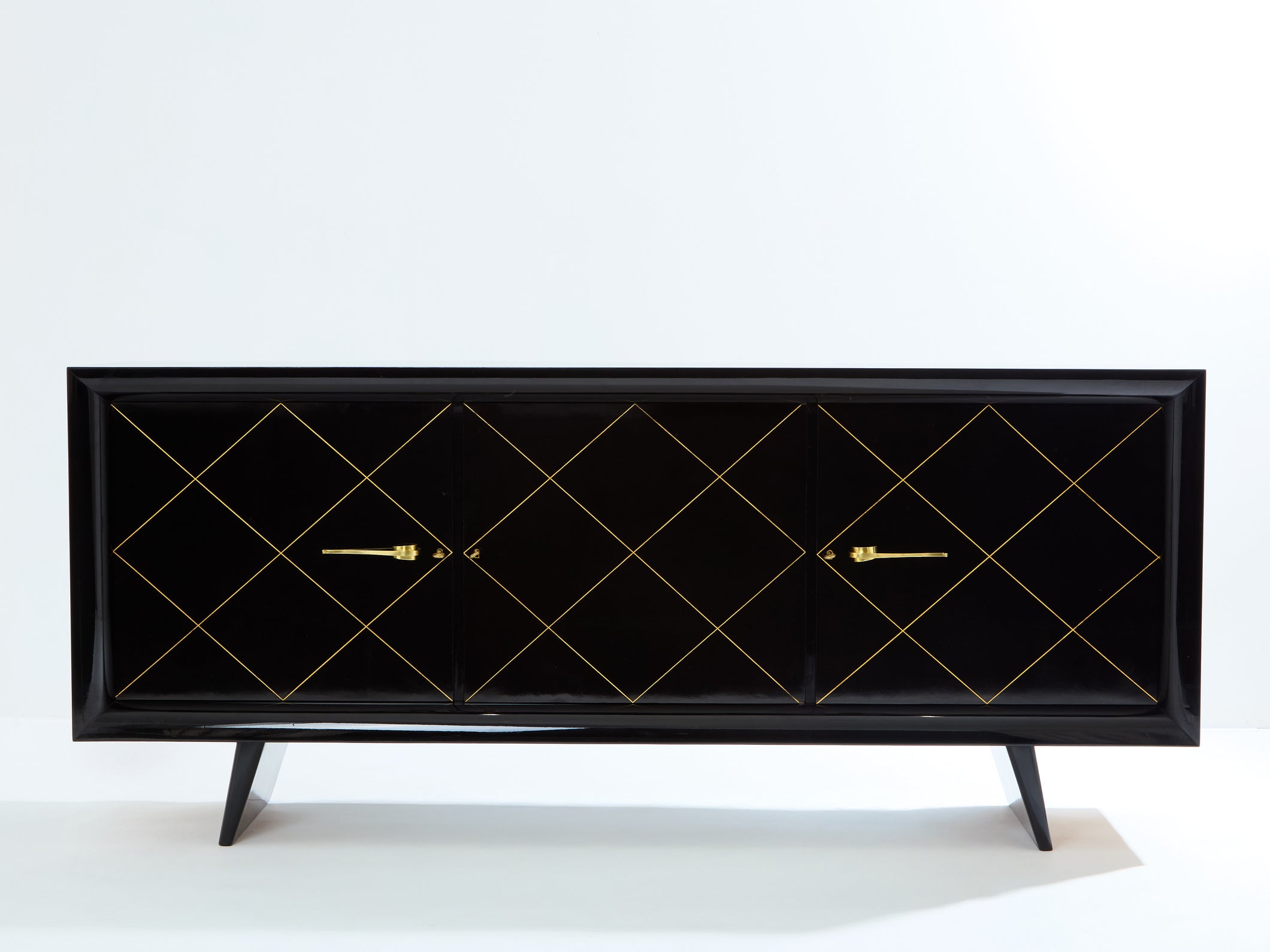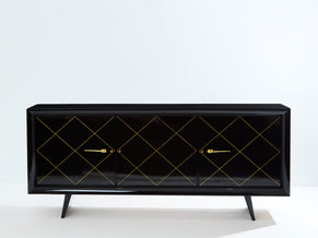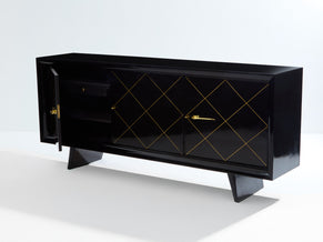 This beautiful ebonized sycamore sideboard was designed and crafted by Suzanne Guiguichon in the early 1940s. It features three doors, each with gilt geometric lines, opening with brass handles and keys, and revealing two shelves on the central part, and two shelves with a small drawer on each side of the sideboard. The eye-catching gold leaf geometric decor and brass handles contrast perfectly with the ebonized varnished sycamore. This piece has been fully restored, polished with traditional shellac varnish, and is in superb condition.