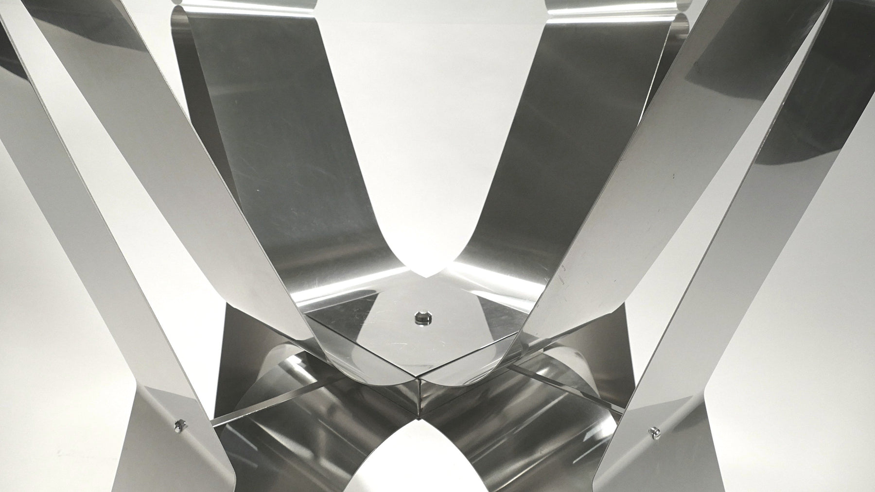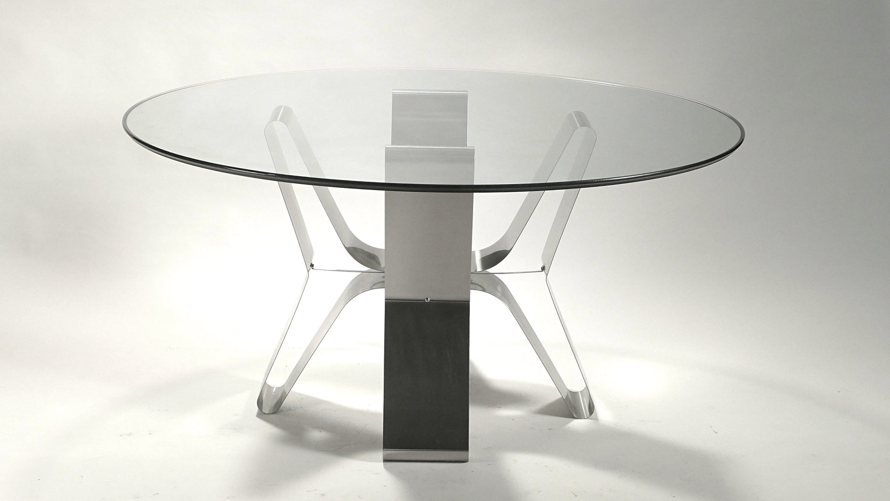 This extravagant contemporary dining table is perfect in every way. Curved in toward the table's center, this iconic piece by French Modernist is made from bendable sleek brushed steel frame with an tempered original glass top that gives a timeless modernism. As well, giving balance and accent to any dining room space.