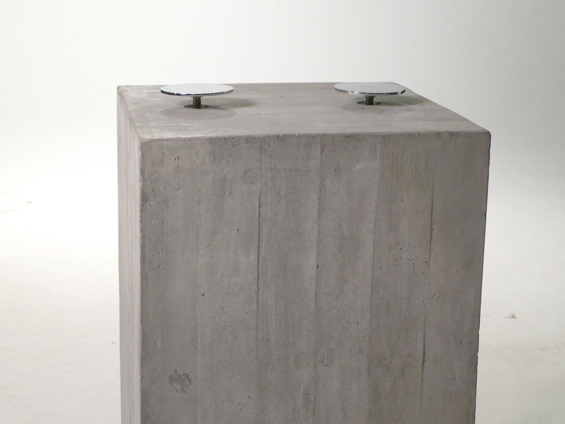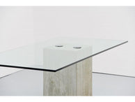 A textured block of concrete is a stimulating choice for the feet of this dining table, and its rugged look is at once emphasized and balanced by the thick sheet of transparent glass that forms the sleek surface. The 1970’s table is a signature model for the Italian design team Sergio and Giorgio Saporiti and is emblematic of their slick, brutalist work. Found in very good vintage condition, this piece would work well in a minimalist space such as a loft or other contemporary interior.