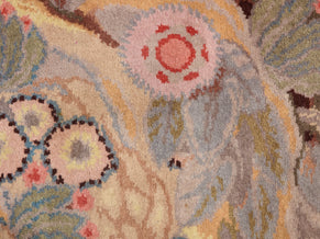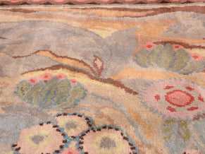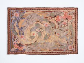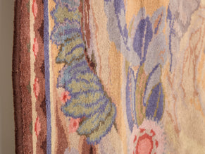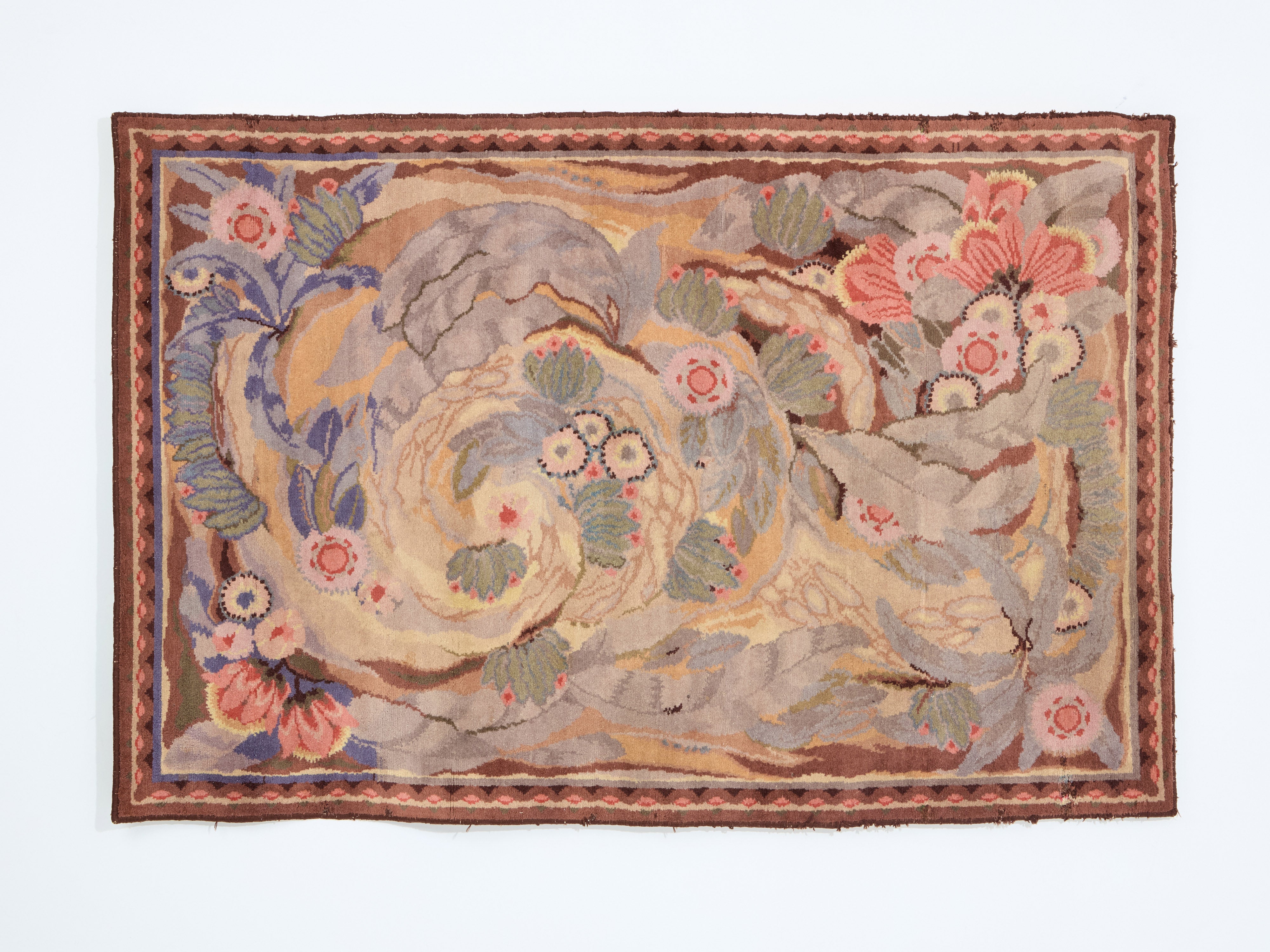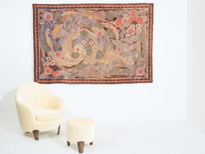 Maurice Dufrêne designed this tapestry for the studio La Maitrise, Les Galeries Lafayette, in Paris in 1922, just as he became the director of the studio. Crafted from handspun wool, the tapestry displays a mystical scene of flowers and leaves, intertwined and almost lost among abstract swirls and flourishes. Pastel colors like lilac, white yellow, and coral, lend a gentle and inspiring feel to the design. The piece would make a stunning, museum-quality art piece, full of important Art Deco history and demonstrating a masterful combination of skill and creativity. It is one of the first pieces he ever designed during his time with La Maitrise, heralding a prolific period of production.