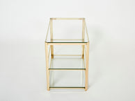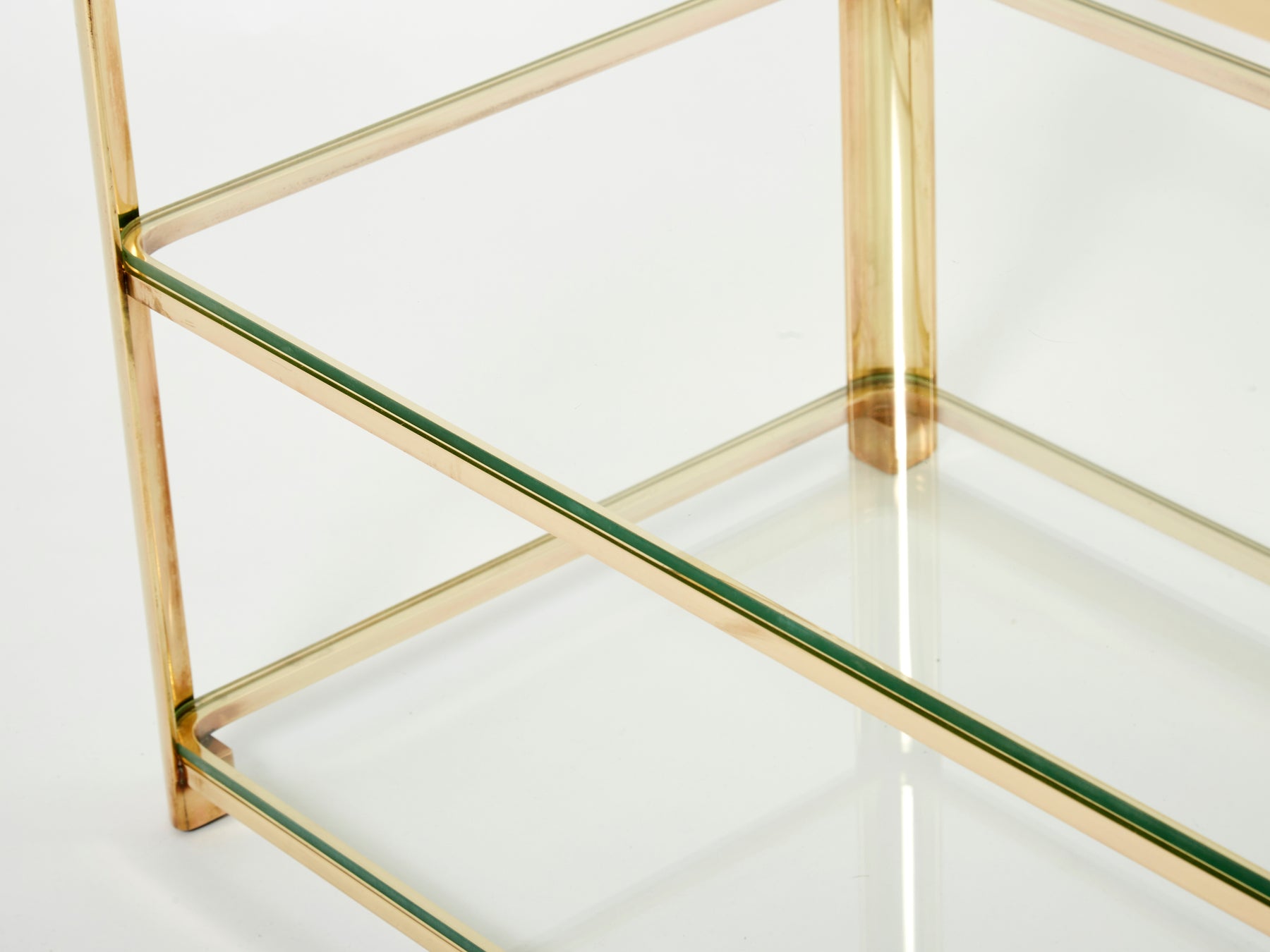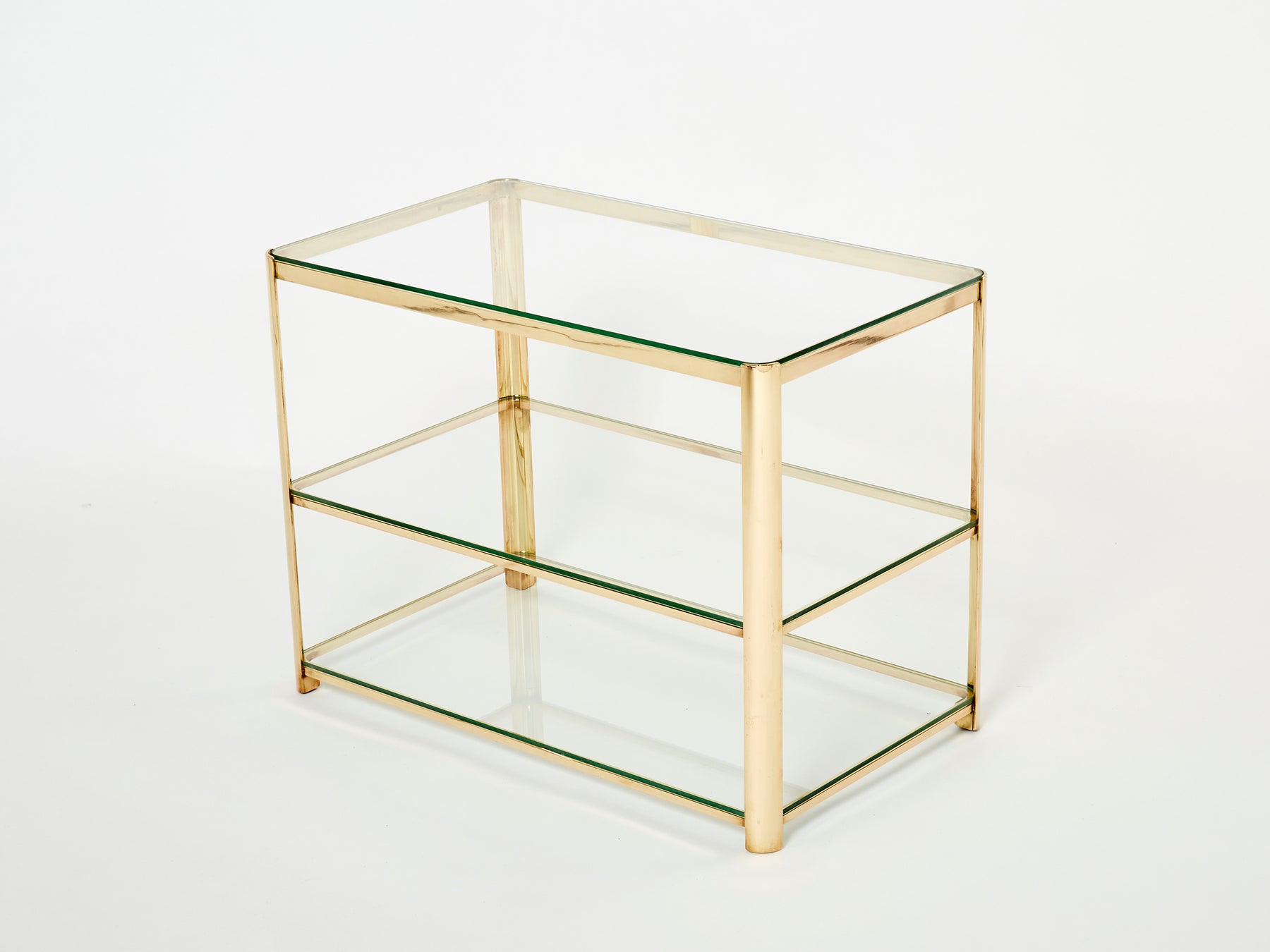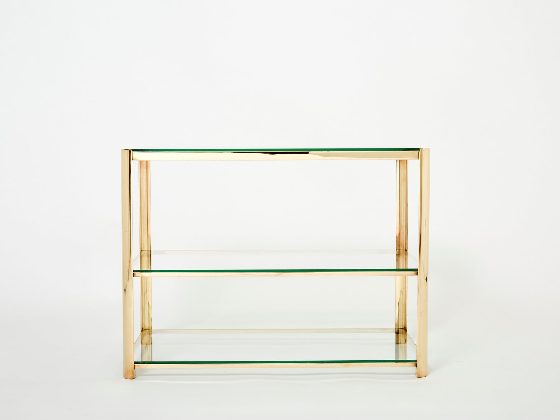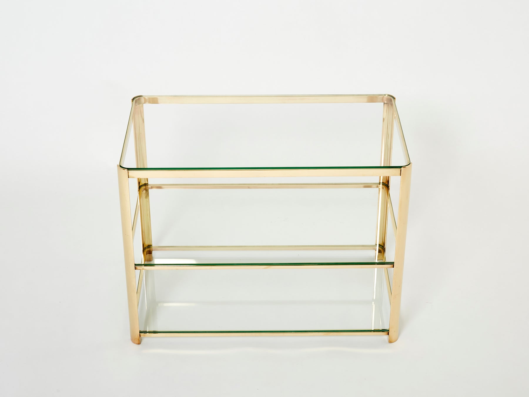 This beautiful three-tier side table designed by Jacques Théophile Lepelletier and stamped by Broncz, is a remarkable find. The table features a strong, solid polished bronze structure built to last forever. The original three-tier glass tops add a nice aesthetic appeal as well as extra storage space. This end table will not only be a chic focal piece but also a functioning addition to your living room. It looks minimal and elegant, and has a lovely timeless aesthetic, typical of the French neoclassical mid-century modern design. The table has been fully cleaned, and is in a great vintage condition.
