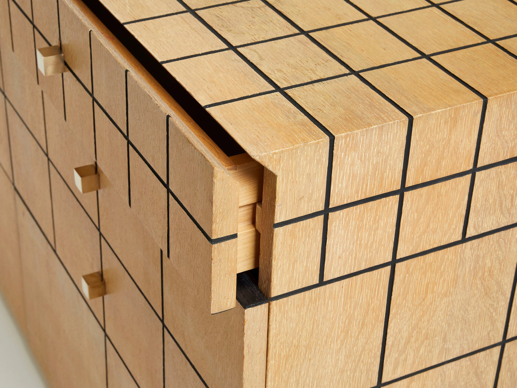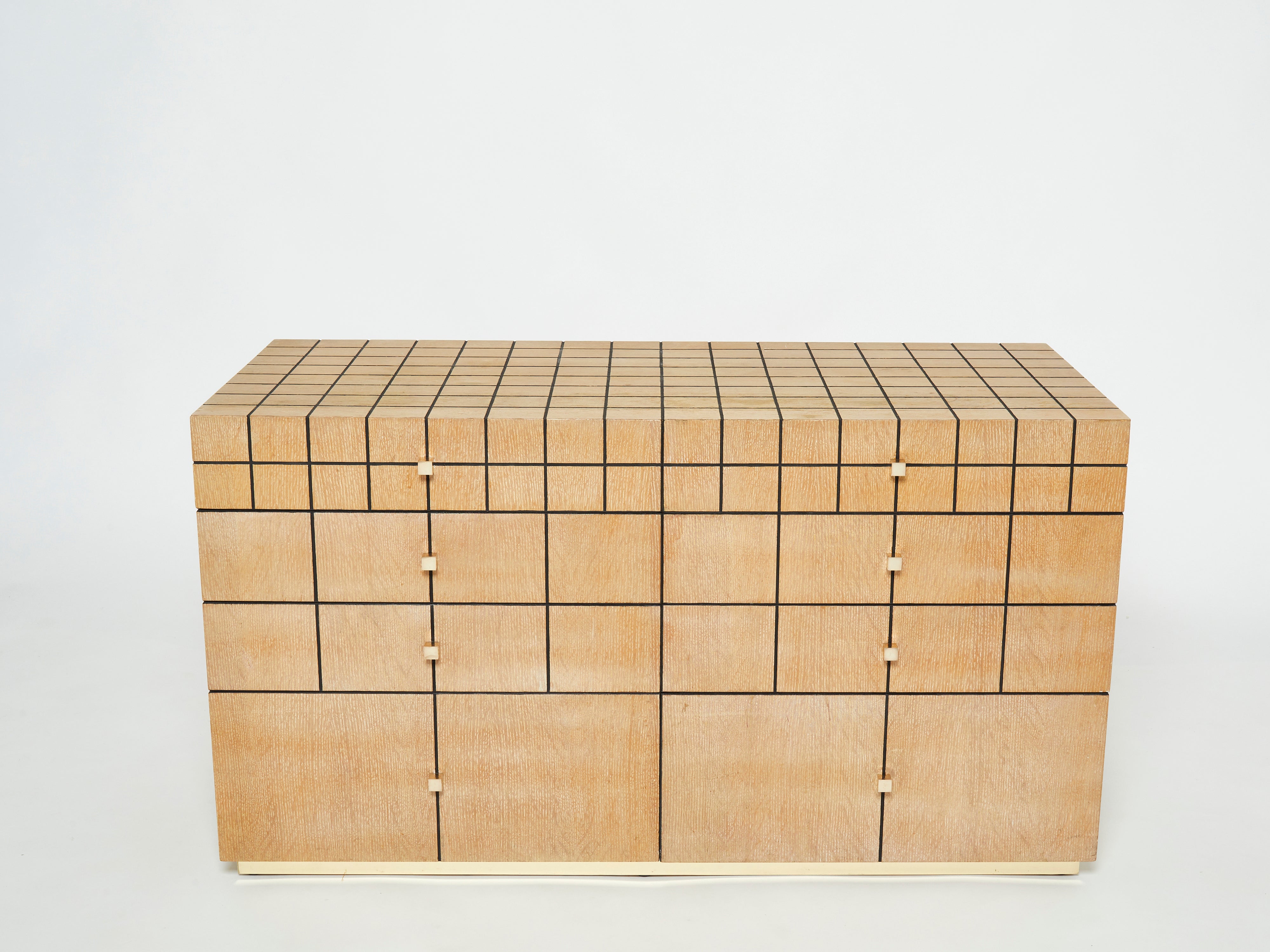 This 1970’s commode chest of drawers would impart a strong architectural and glowing mood to any space. The warm cerused oak wood, with geometric black painted lining and brass handles, remains looking healthy and smooth fifty years later. Quality brass handles and accents adorn the front of the chest. Made to order in France by Jean-Michel Wilmotte, the piece feels delightfully modern for the period and charmingly vintage now. A beautiful piece, in great vintage condition.