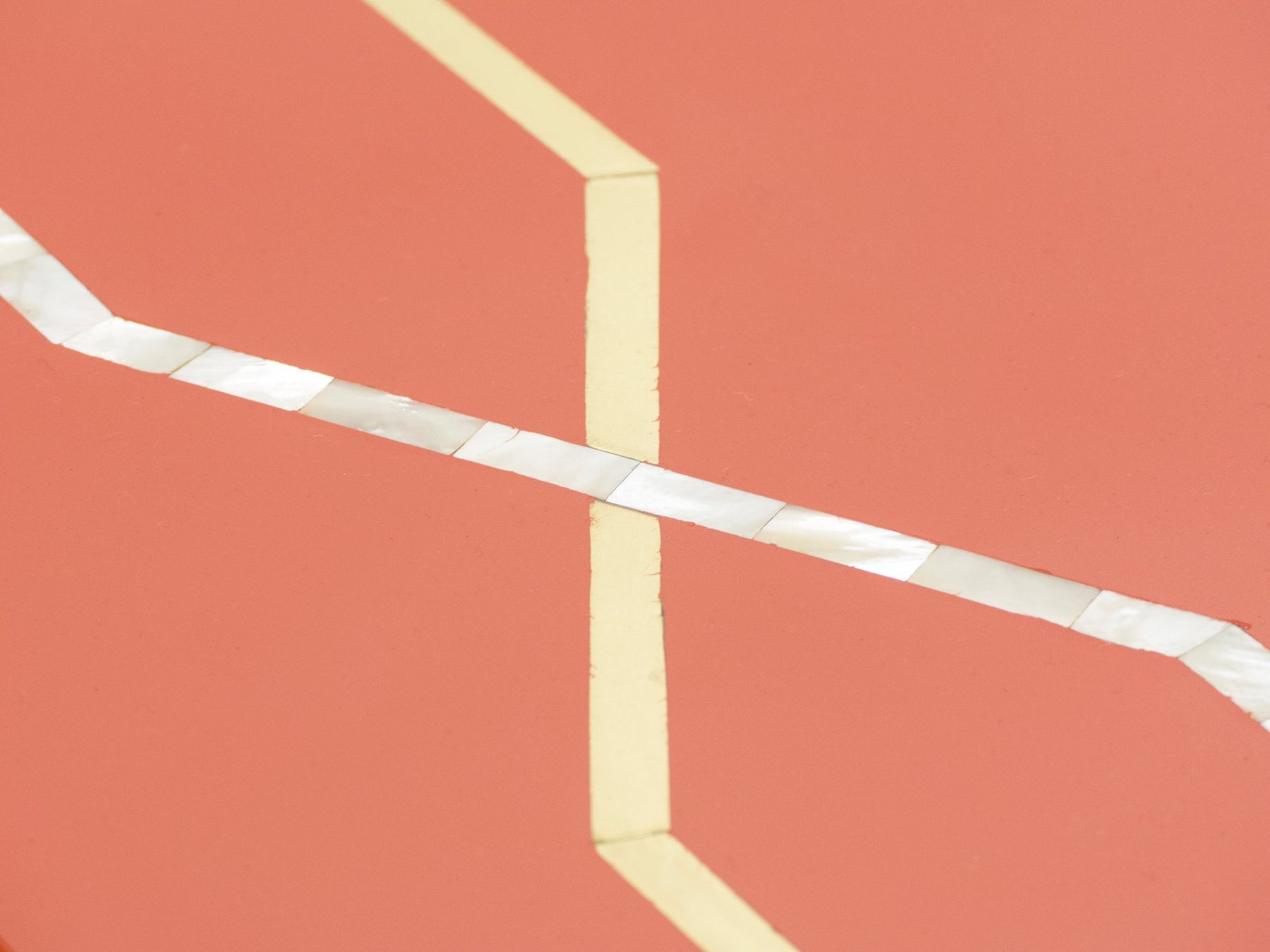 As expected for Hollywood Regency design, the structure feels rich, thick legs made from solid brass. The table top is a lovely red lacquer, inlaid with unique geometric designs of gleaming brass and organic-feeling mother of pearl. The elongated octagonal shape of the table offers a final punch of individuality, shirking the typical oval or rectangle shape. Fully restored to very good vintage condition, this table reveals stunning attention to detail at every bend. It is a fascinating Jansen masterpiece.