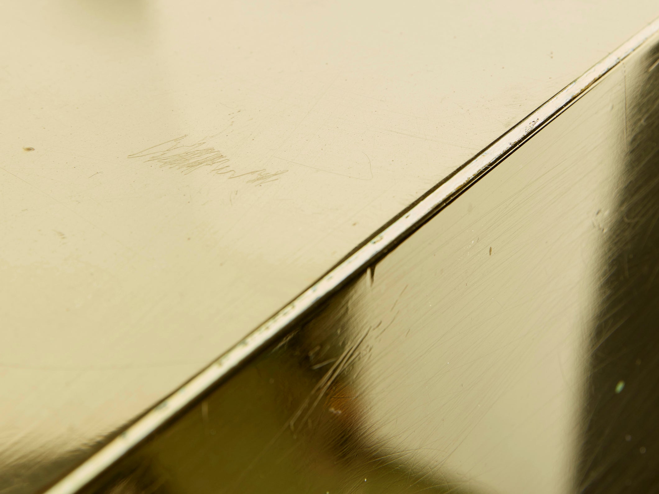 A unique bar for a standout look. This rare piece was designed by Jean-Claude Mahey in the 1970s for Maison Romeo Paris, and displays all the trademark glam of the French seventies period. Brass and black lacquer are used in large, chunky blocks for a powerful impact, with nice curves on each side. From a distance, the piece seems to sparkle. There are 3 large storage spaces in the back, with enough room for a small fridge, ice machine, glasses and liquor. This dry bar would be a unique piece to add to a contemporary living room. It has been fully cleaned and restored, with only minor traces of use on the counter, and a beautiful patina all around. This can be easily disassembled and assembled for shipping.