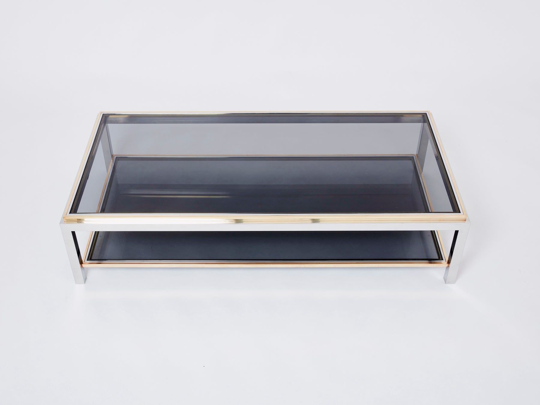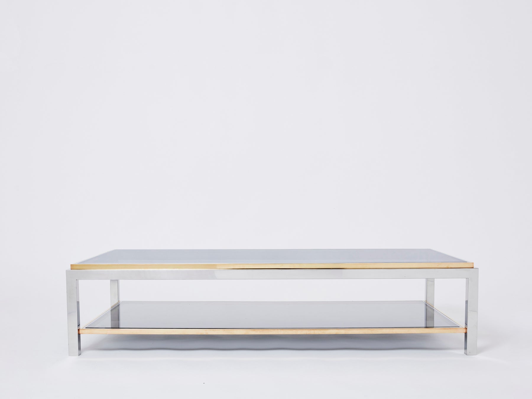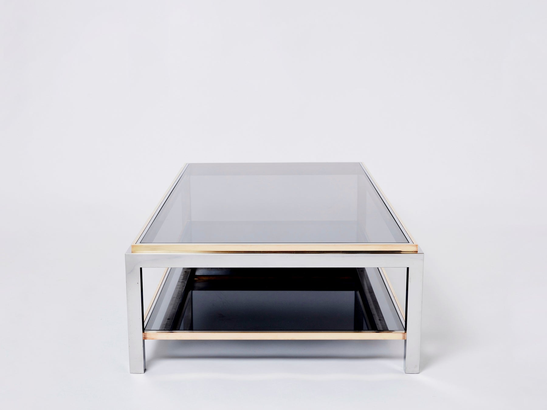 This stunning two-tier coffee table is guaranteed to be the focus of attention when you entertain guests in your living room. Following the glamorous Italian Hollywood Regency look of other classic Willy Rizzo designs, this Flaminia model coffee table features a chrome-plated steel frame finished with brass edges, resulting in a beautiful and rich contrast. The combination of chrome, brass and grey smoked glass forms an architectural modern yet timeless inspiration. This piece has been fully restored and refinished, glass tops renewed, and is in great vintage condition.